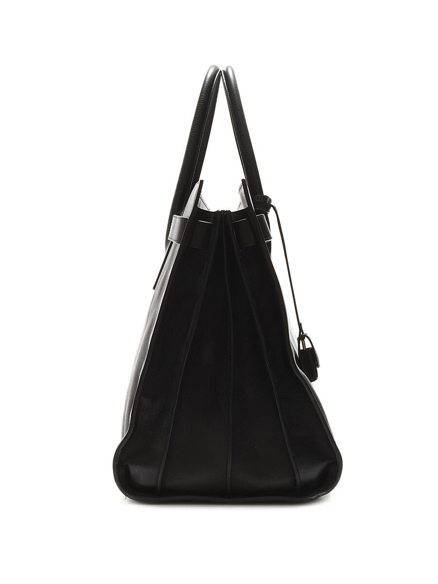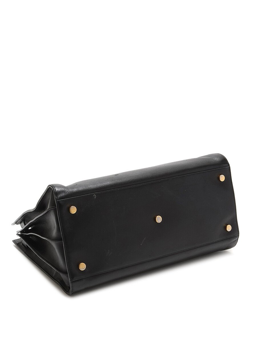 Grand cabas en cuir noir à ouverture sur le dessus. Poignées en cuir avec clochette. Ferrures dorées. Intérieur spacieux.