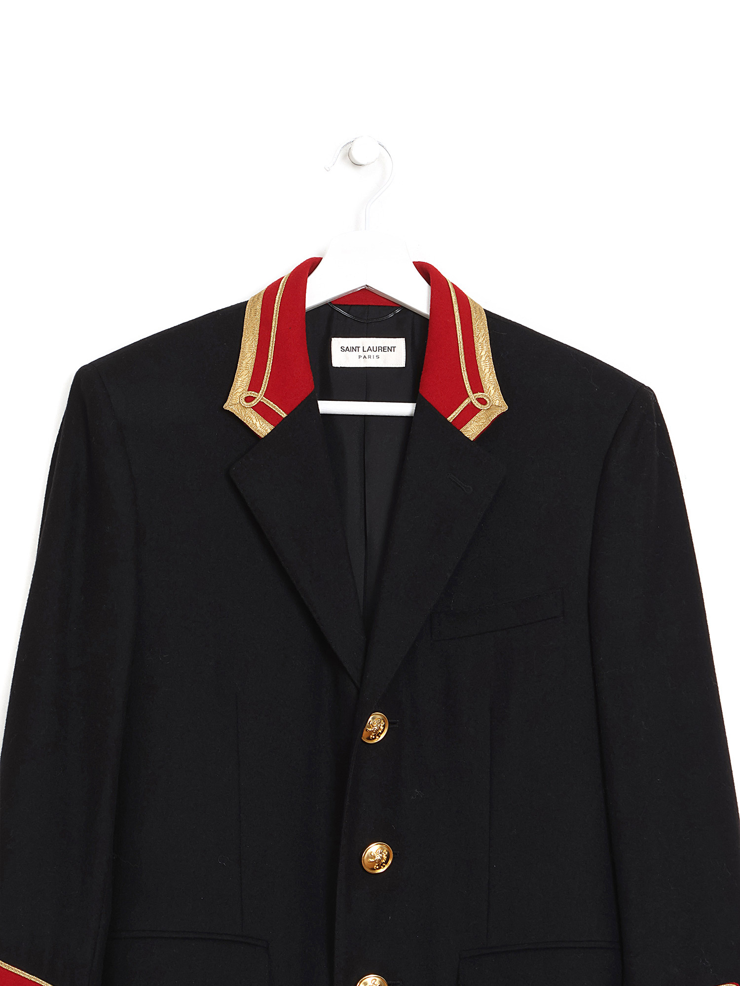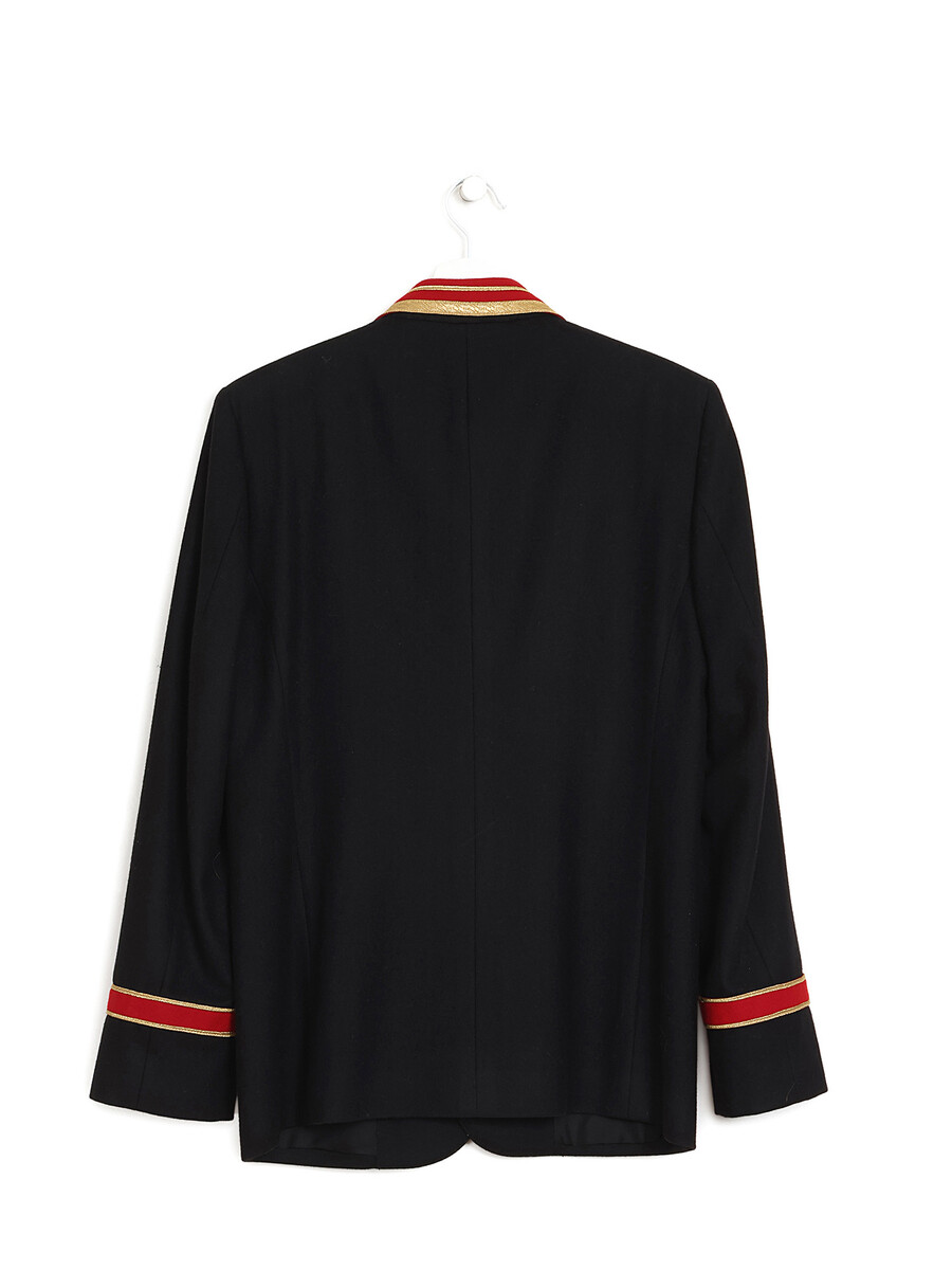 Veston bleu marin de style militaire avec des garnitures rouge et dorées. Fermeture à boutons sur le devant. Col en V échancré. Poches plaquées de chaque côté.