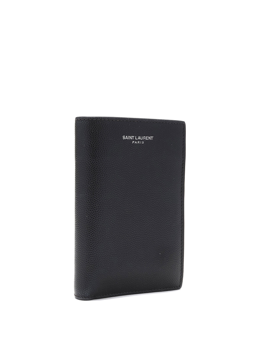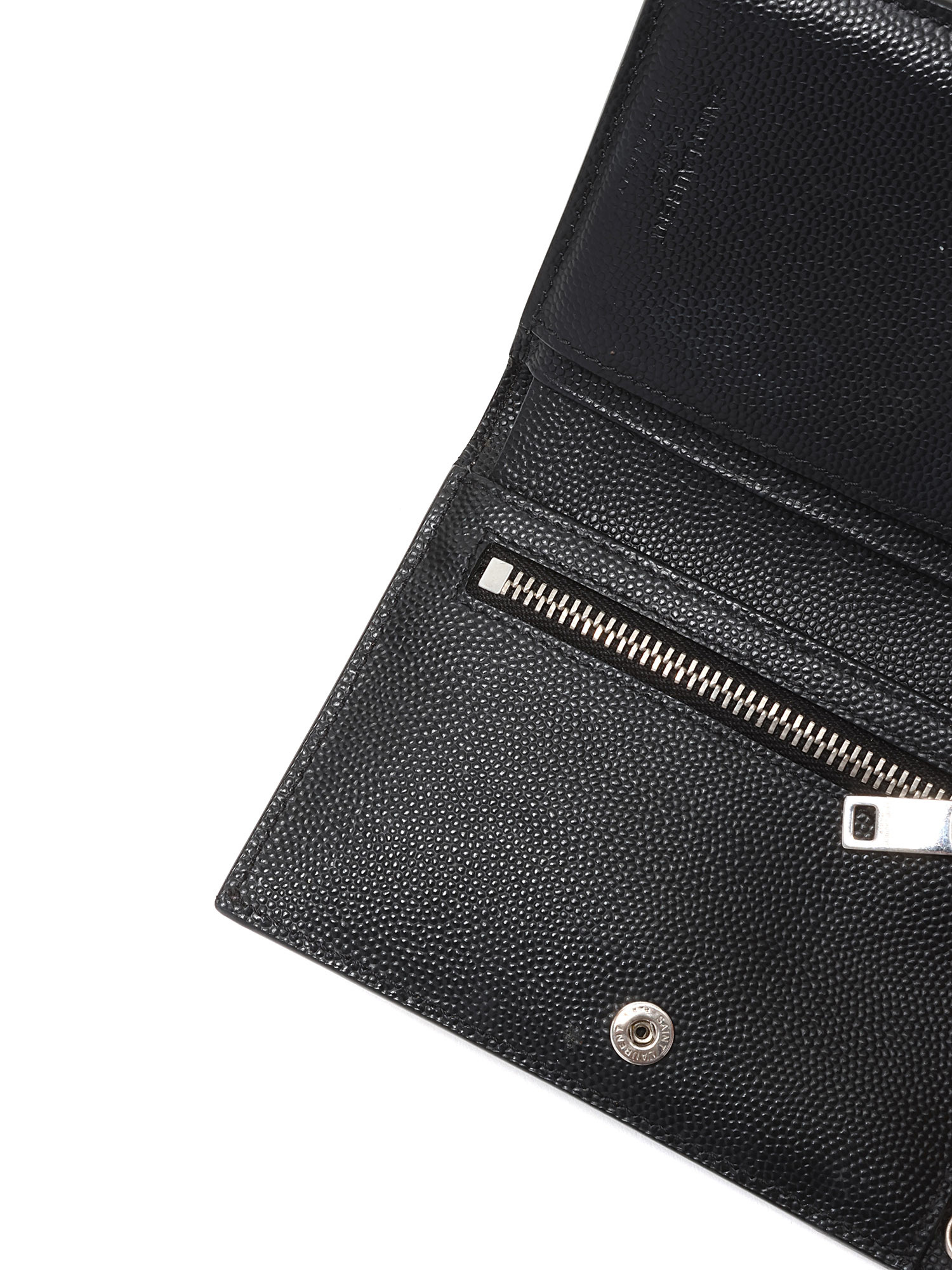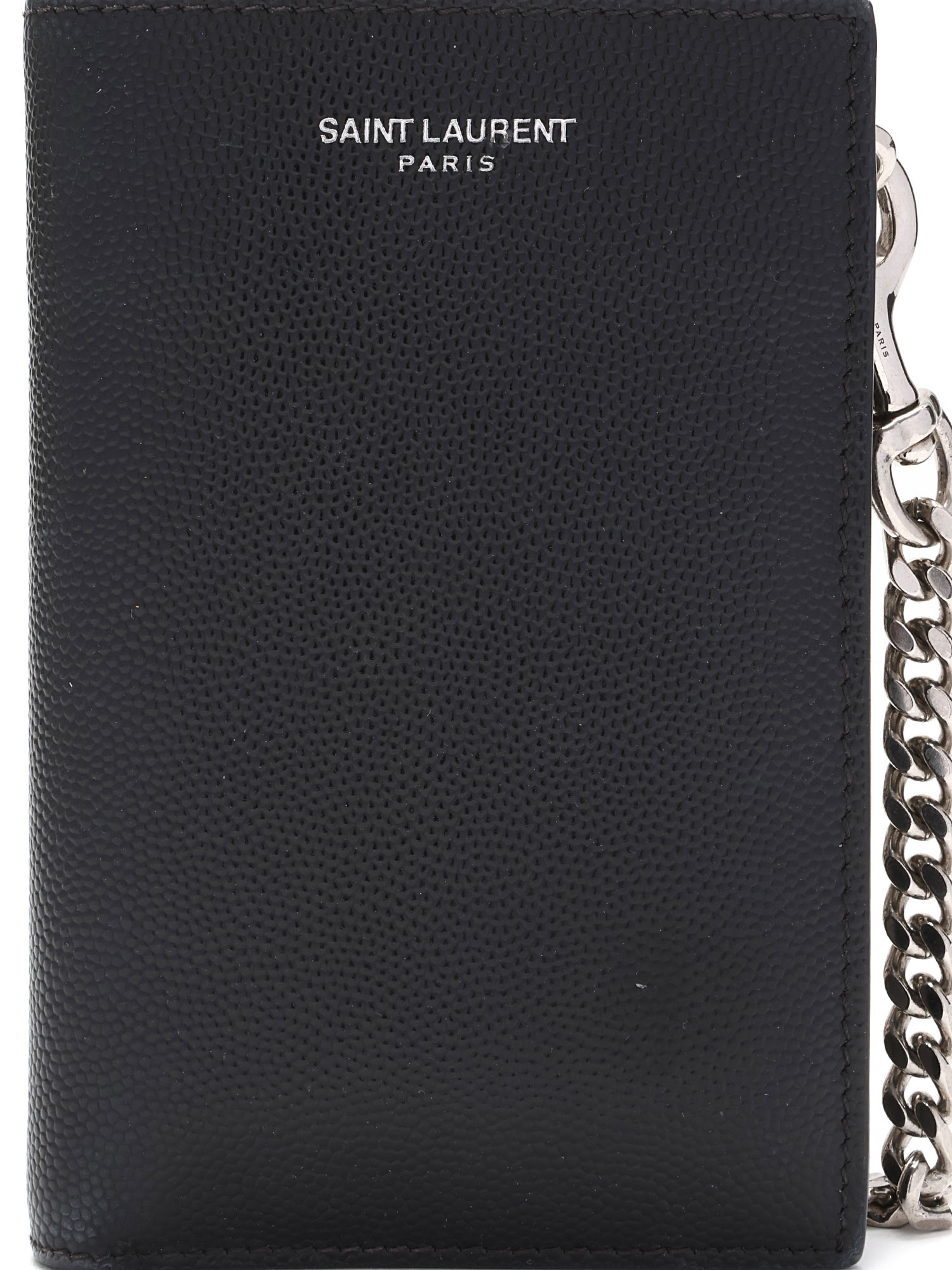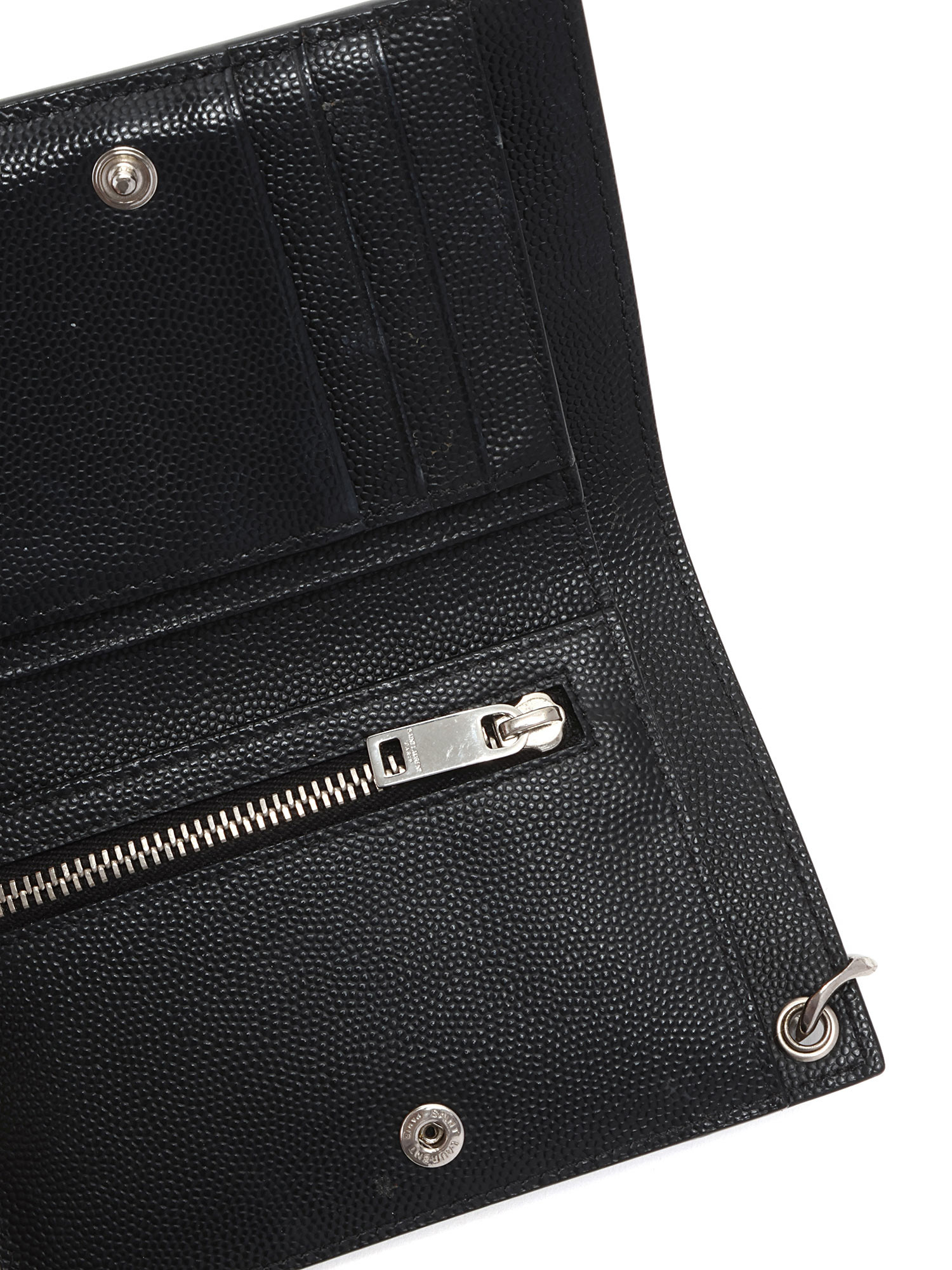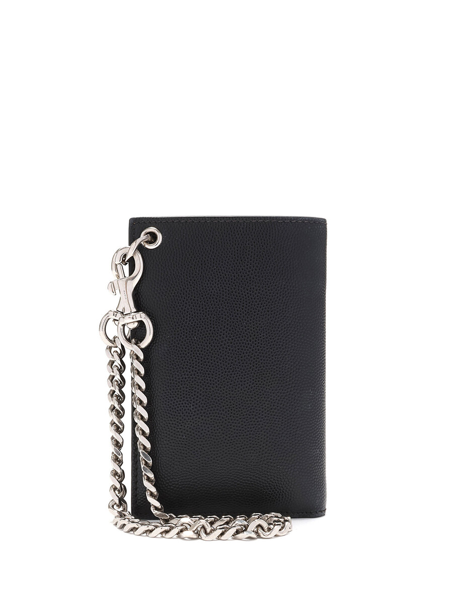 Portefeuille « bifold » noir en cuir grainé avec logo embossé sur le devant. Fermeture par rabat à bouton pression. Chaîne détachable. Ferrures en métal argenté.