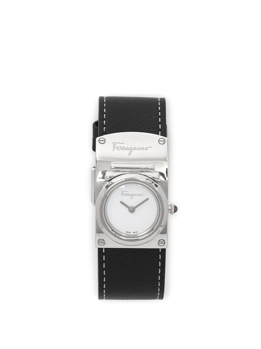 Montre à cadran rectangulaire avec un boîtier argenté et bracelet en cuir avec surpiqûres contrastantes noires. Fabriqué en Suisse.