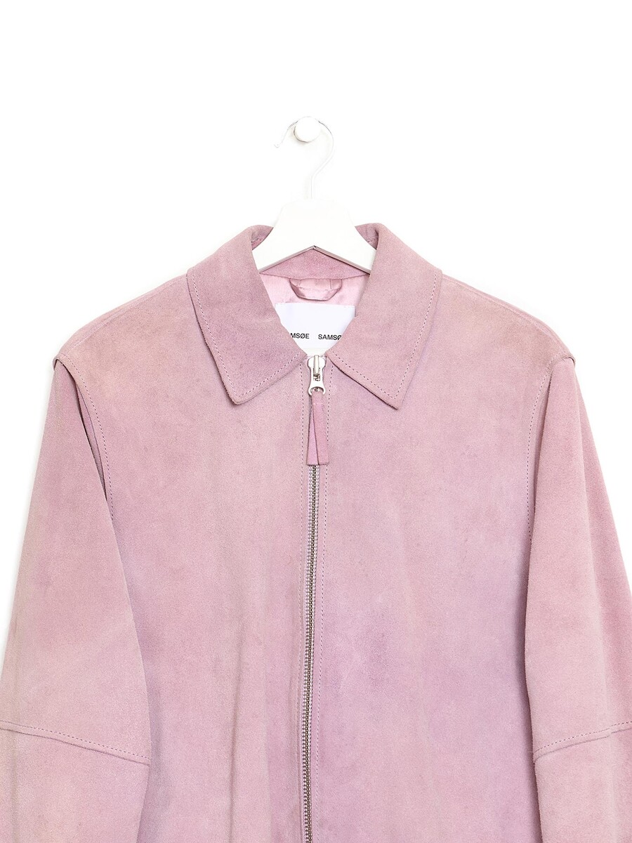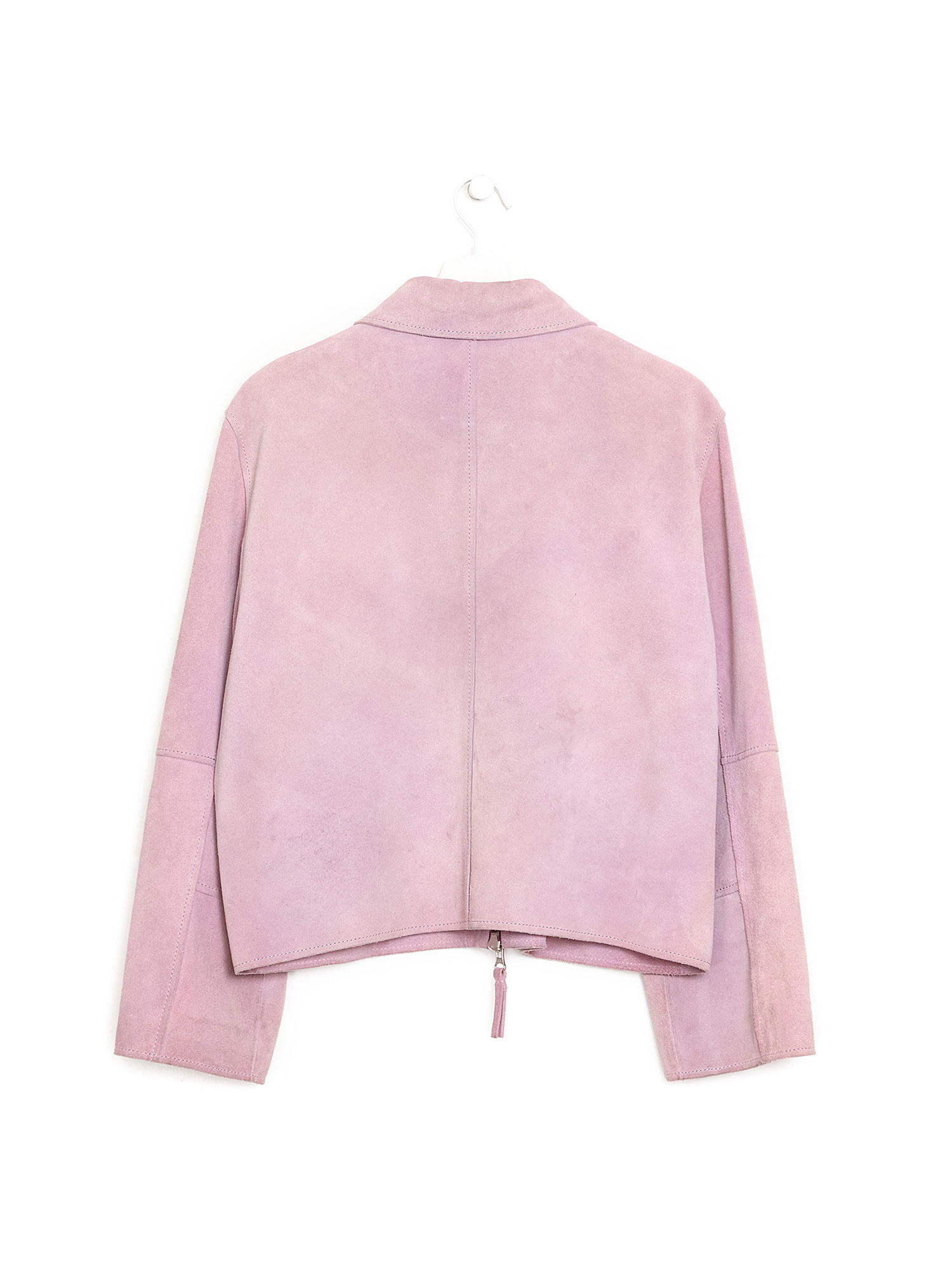 Veste en suède rose. Col tailleur avec fermeture à glissière. Coupe ajustée.
