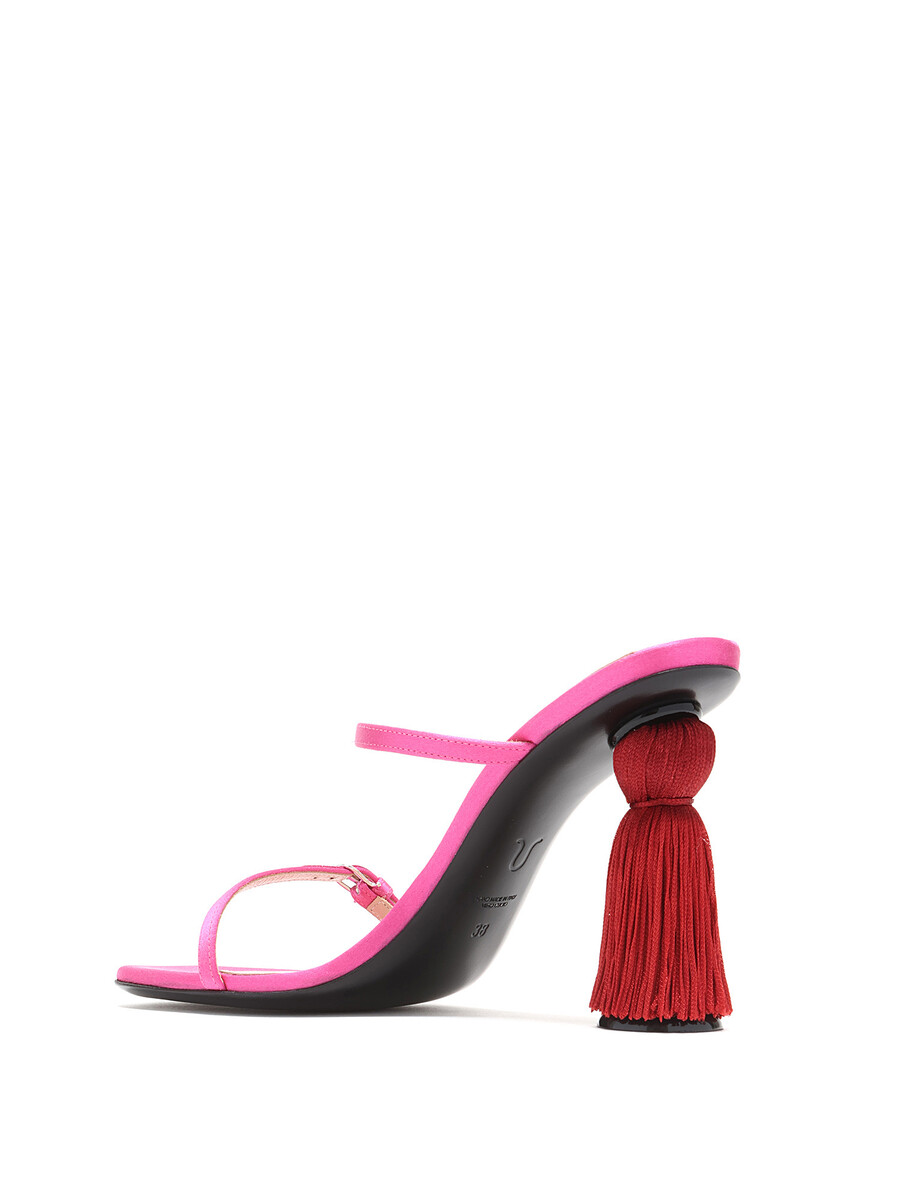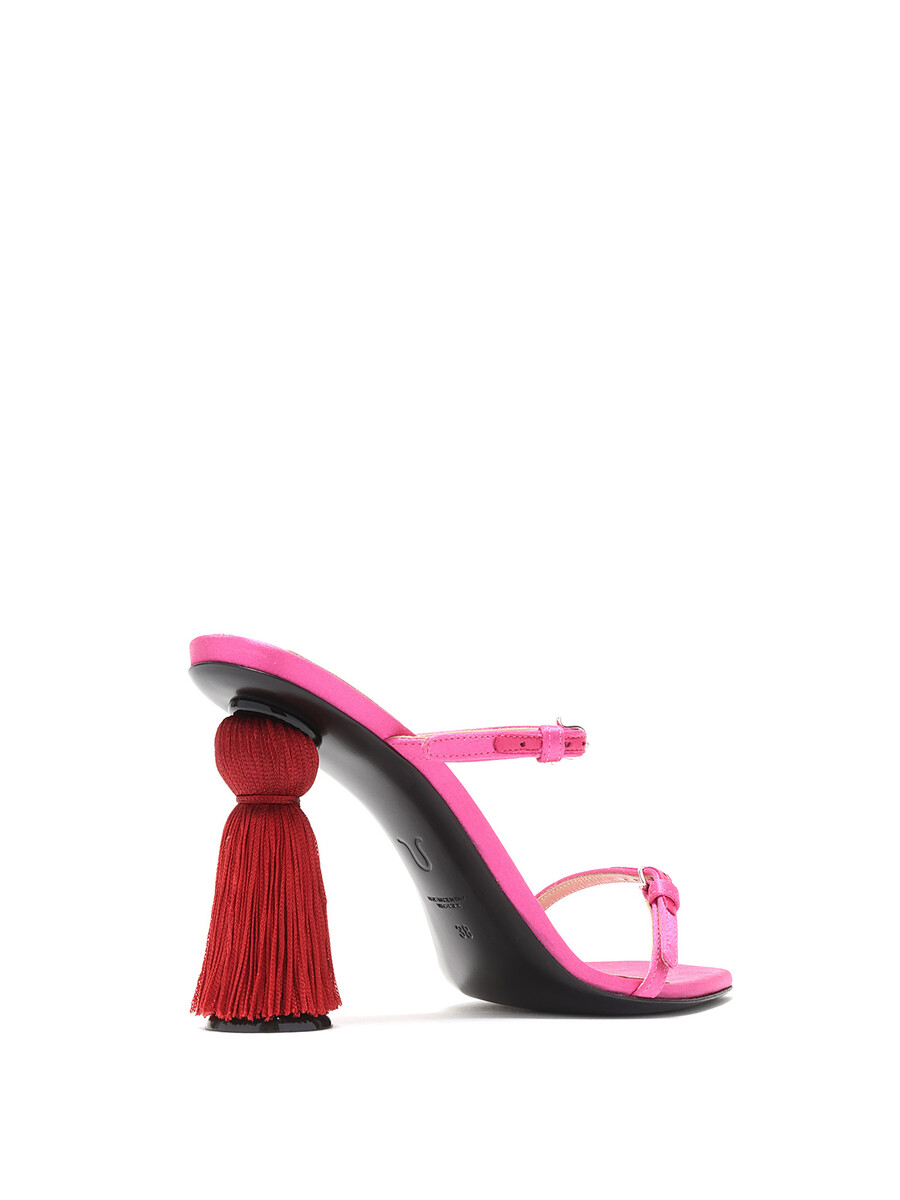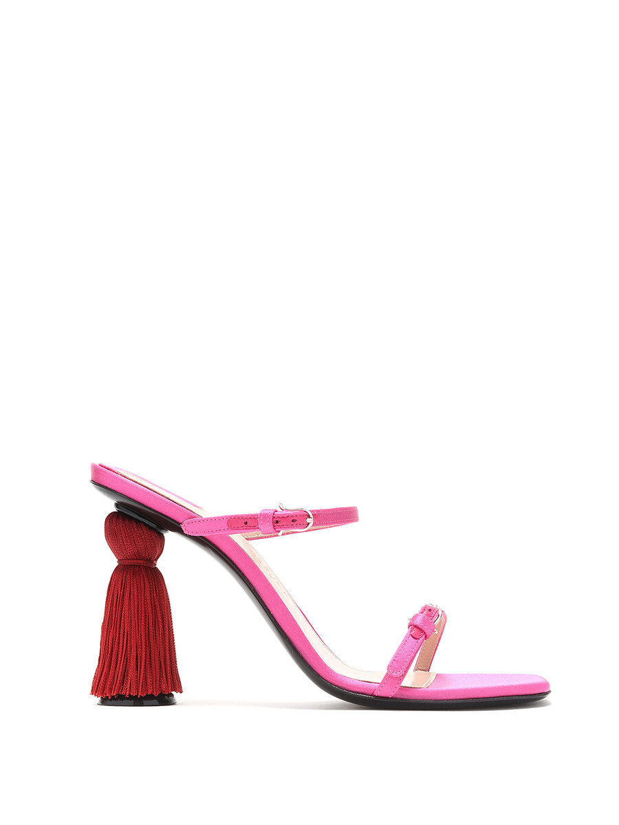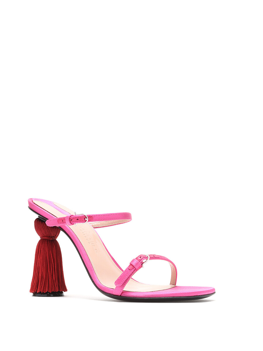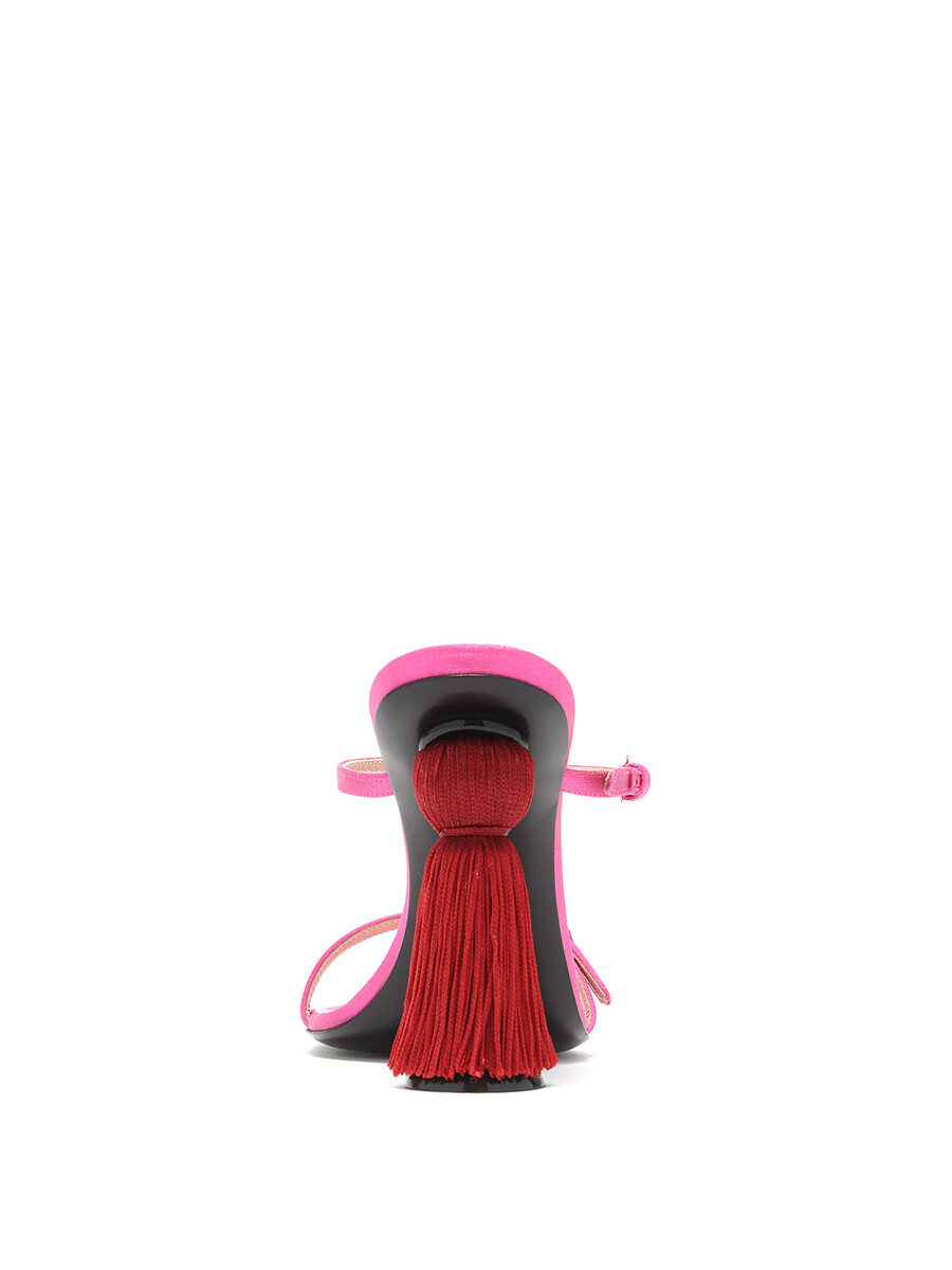 Sandales à talons hauts en cuir rose ornées de fines brides et d'un détail de franges rouges à l'arrière. Fermeture à boucle et bout ouvert. Semelle en cuir. Avec boîte.