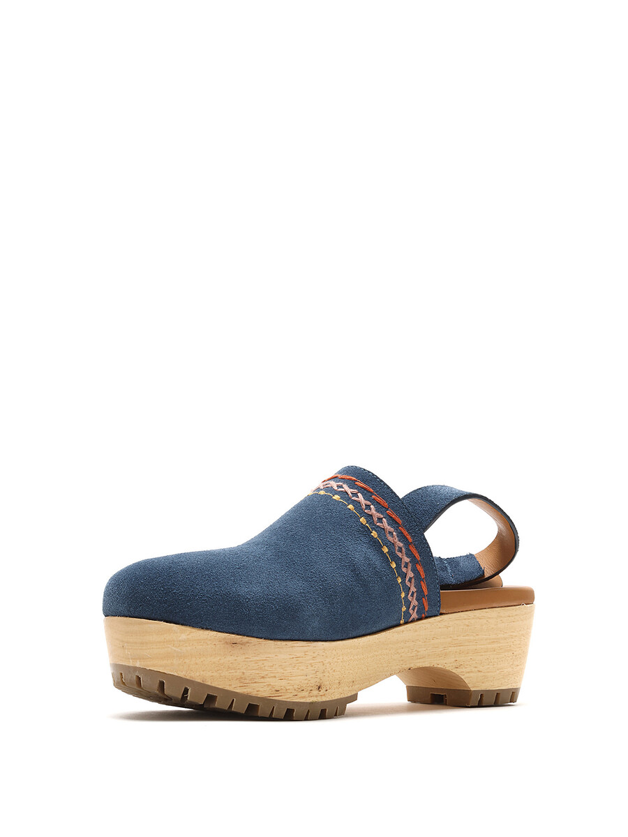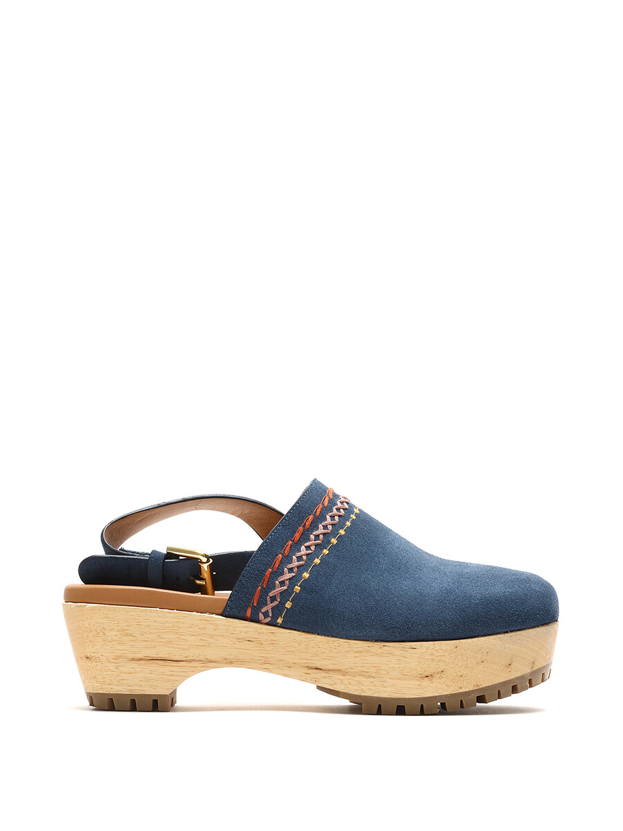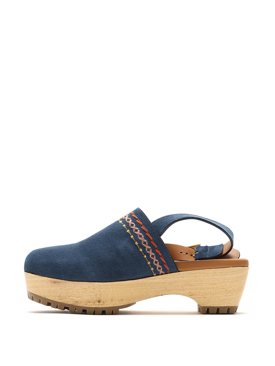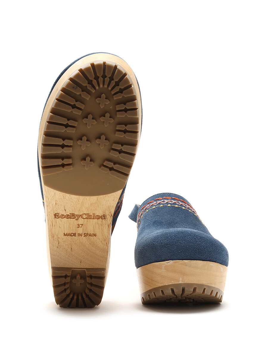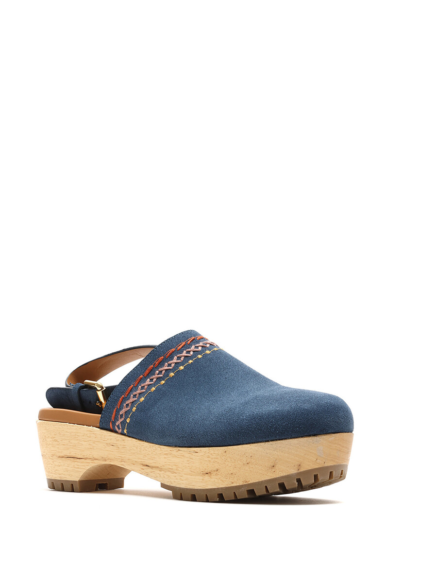 Sabots en daim brodés en bleu. Fermeture par boucle. Bout rond fermé. Semelle à crampons épaisse en caoutchouc.