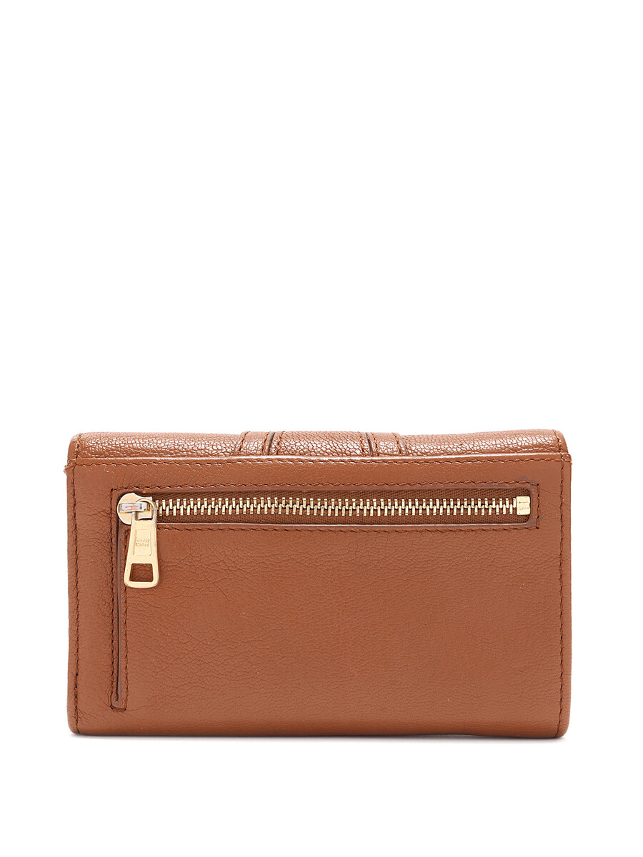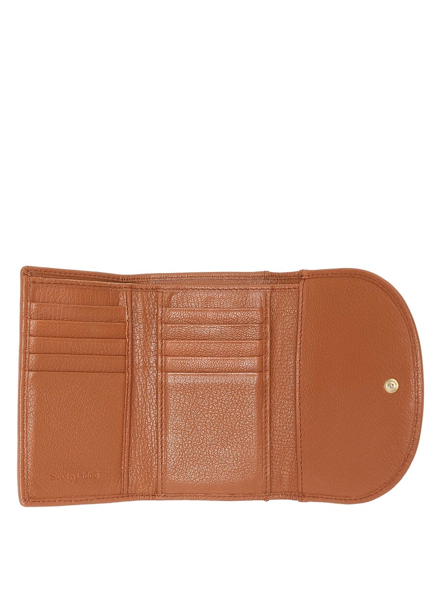 Portefeuille en cuir grainé brun avec un anneau en métal doré tressé. Fermeture à bouton-pression. Quincaillerie dorée.