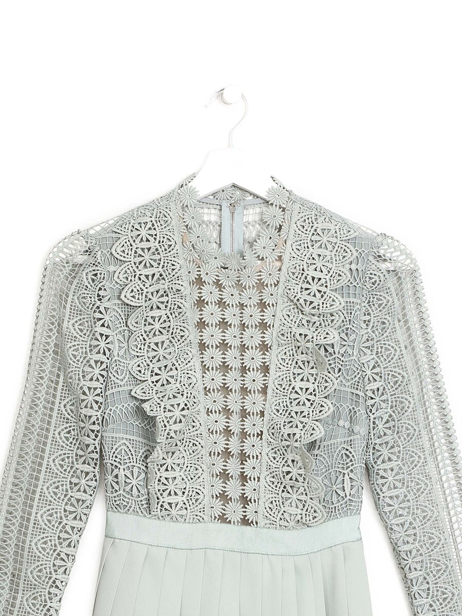 Robe maxi à manches longues avec motif brodé en bleu pâle. Fermeture à glissière centrale au dos. Motifs brodés délicats. Silhouette élégante.