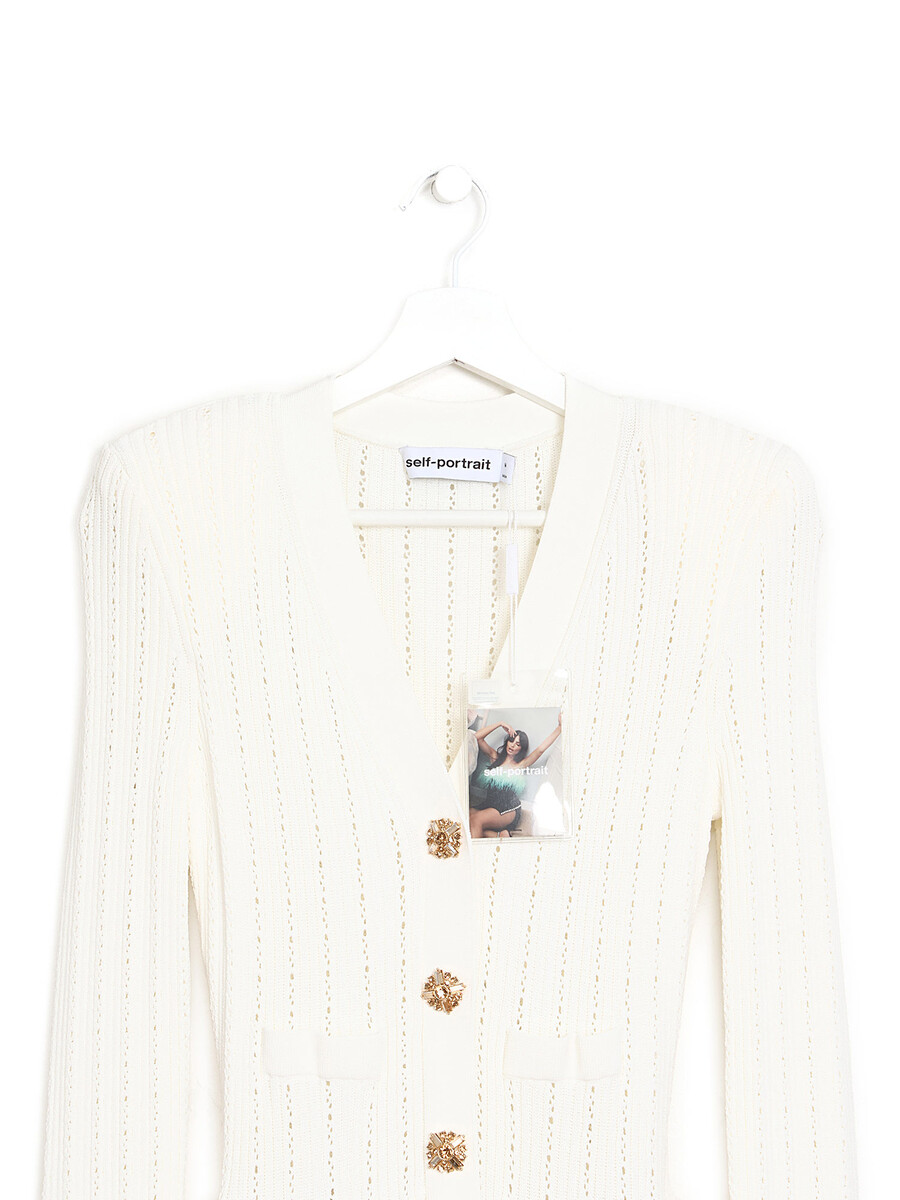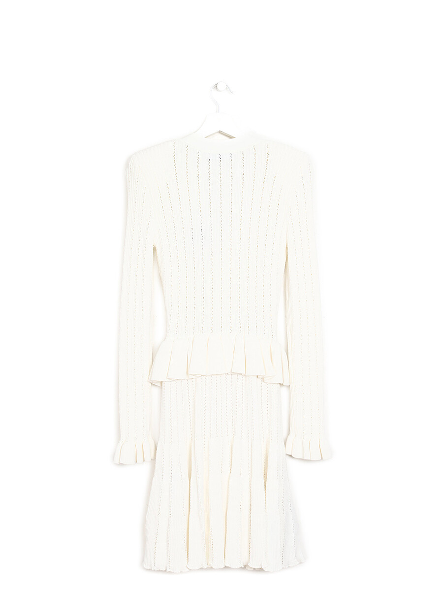 Robe courte blanche à manches longues avec texture en tricot. Ourlet peplum, fermeture boutonnée sur le devant, et encolure en V.