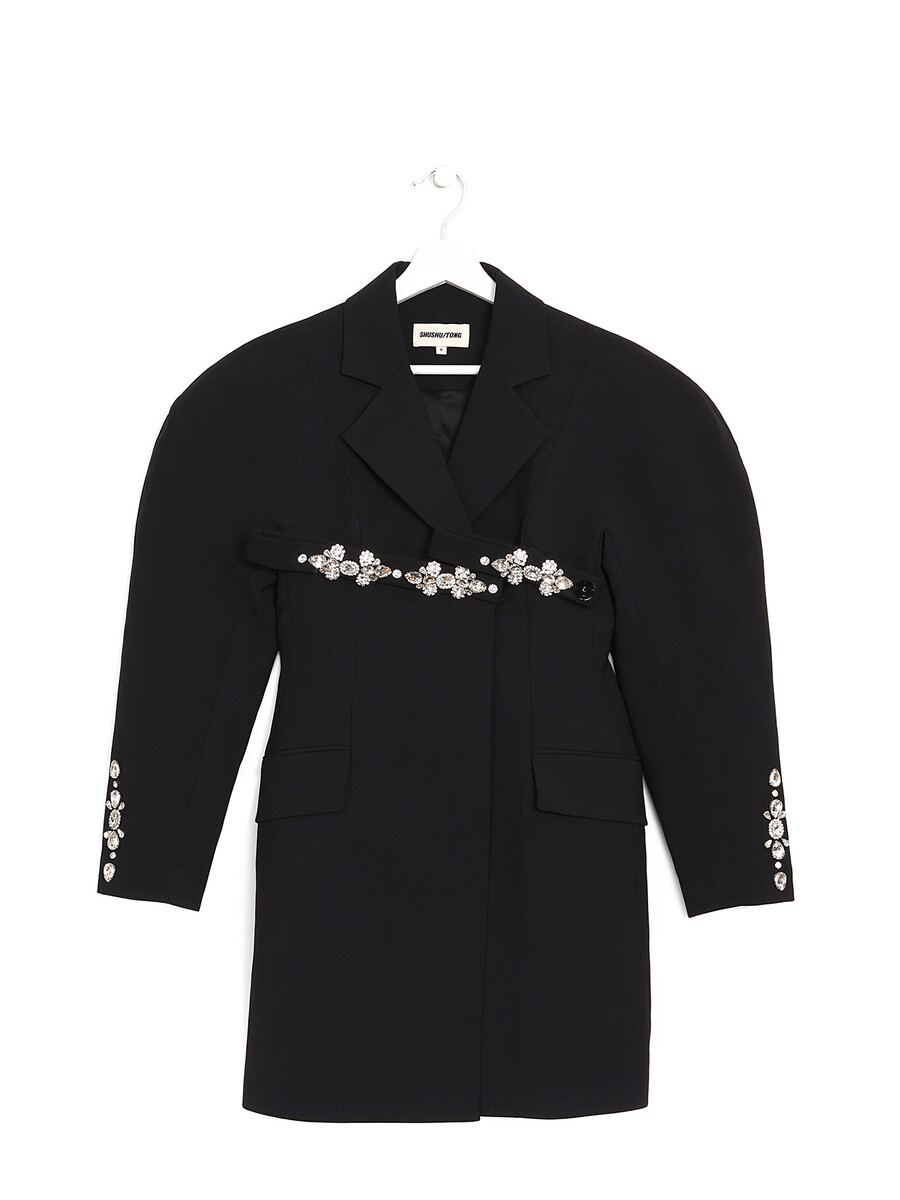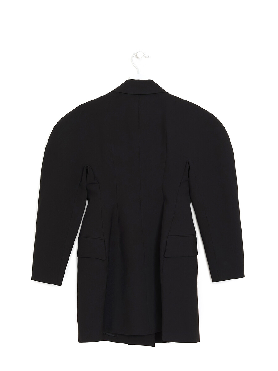 Blazer noir à manches longues avec détails fantaisie. Fermeture boutonnée sur le devant. Col à revers crantés. Poches à rabat de chaque côté.