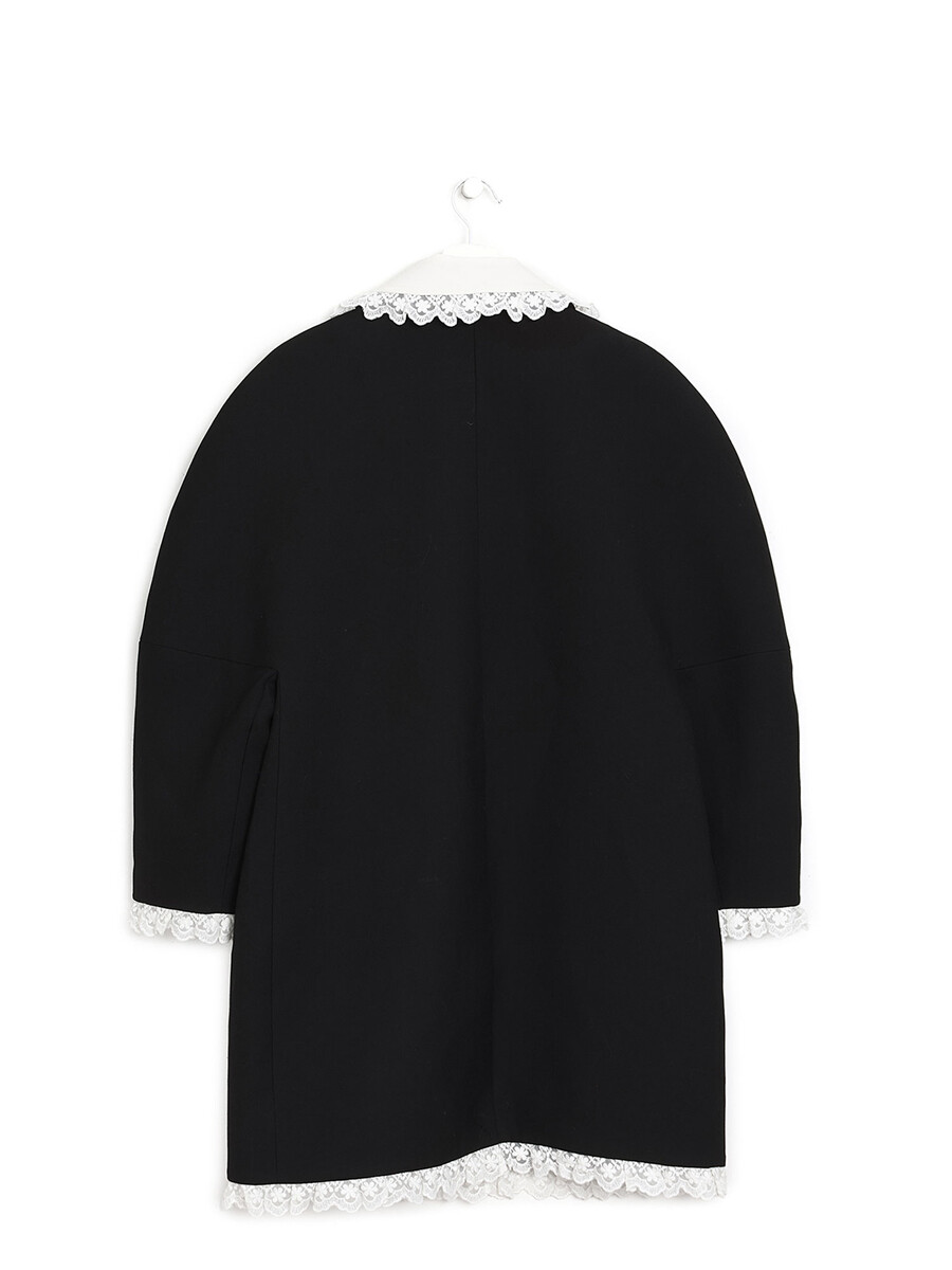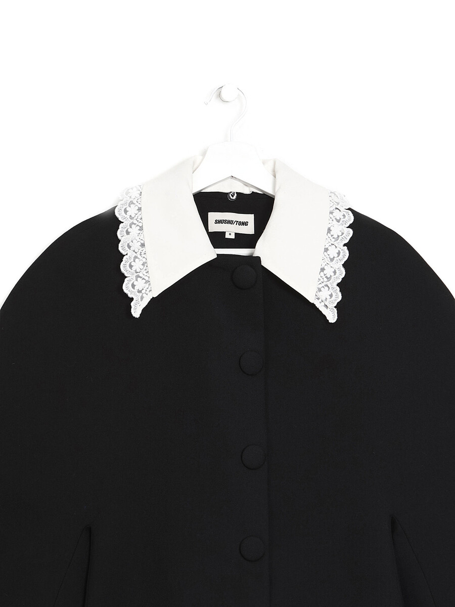 Veste noire à manches longues avec un large col bordé de dentelle en noir. Fermeture à boutons.
