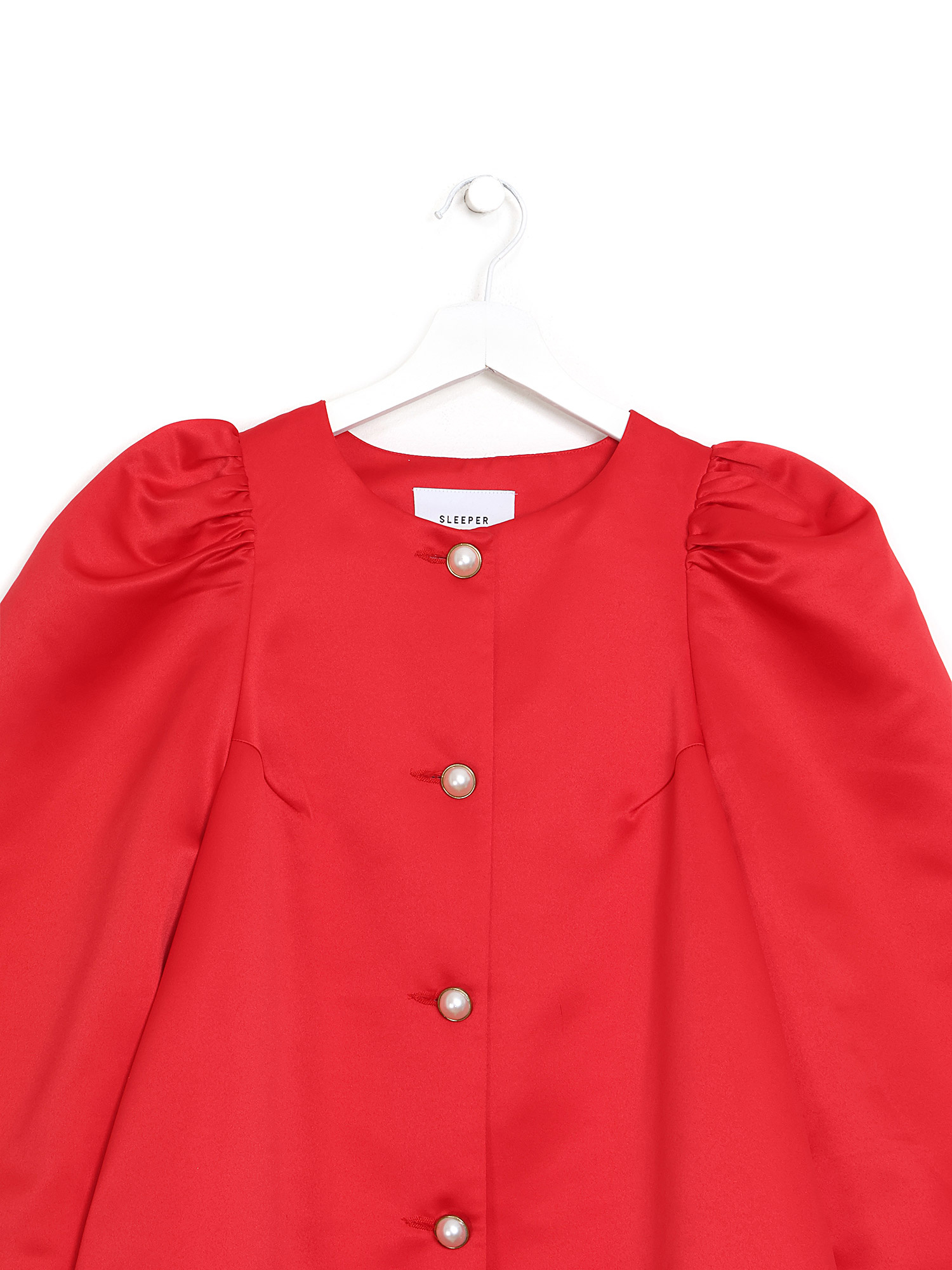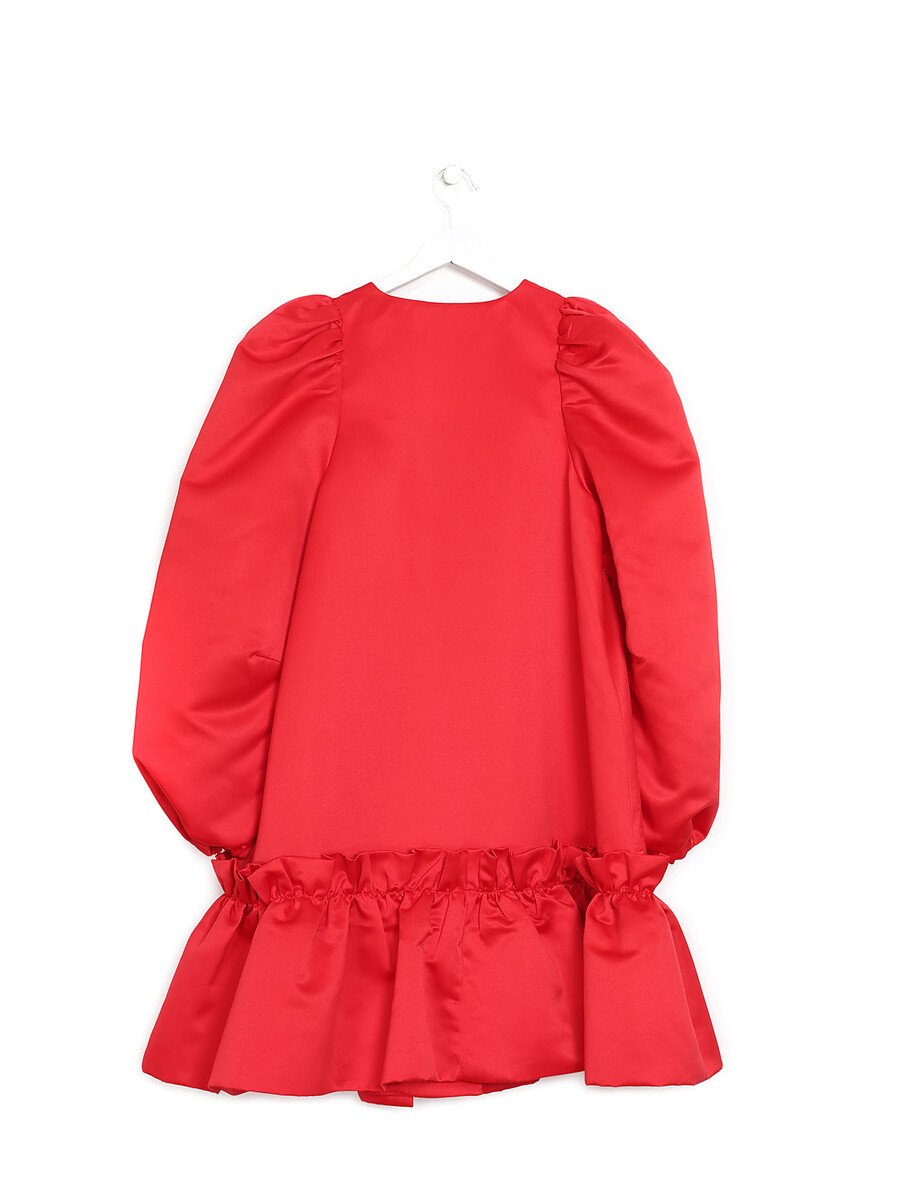 Robe rouge à manches longues avec boutons décoratifs sur le devant et poignets élastiques ornés de volants. Tissu voile mi-lourd. Coupe décontractée.