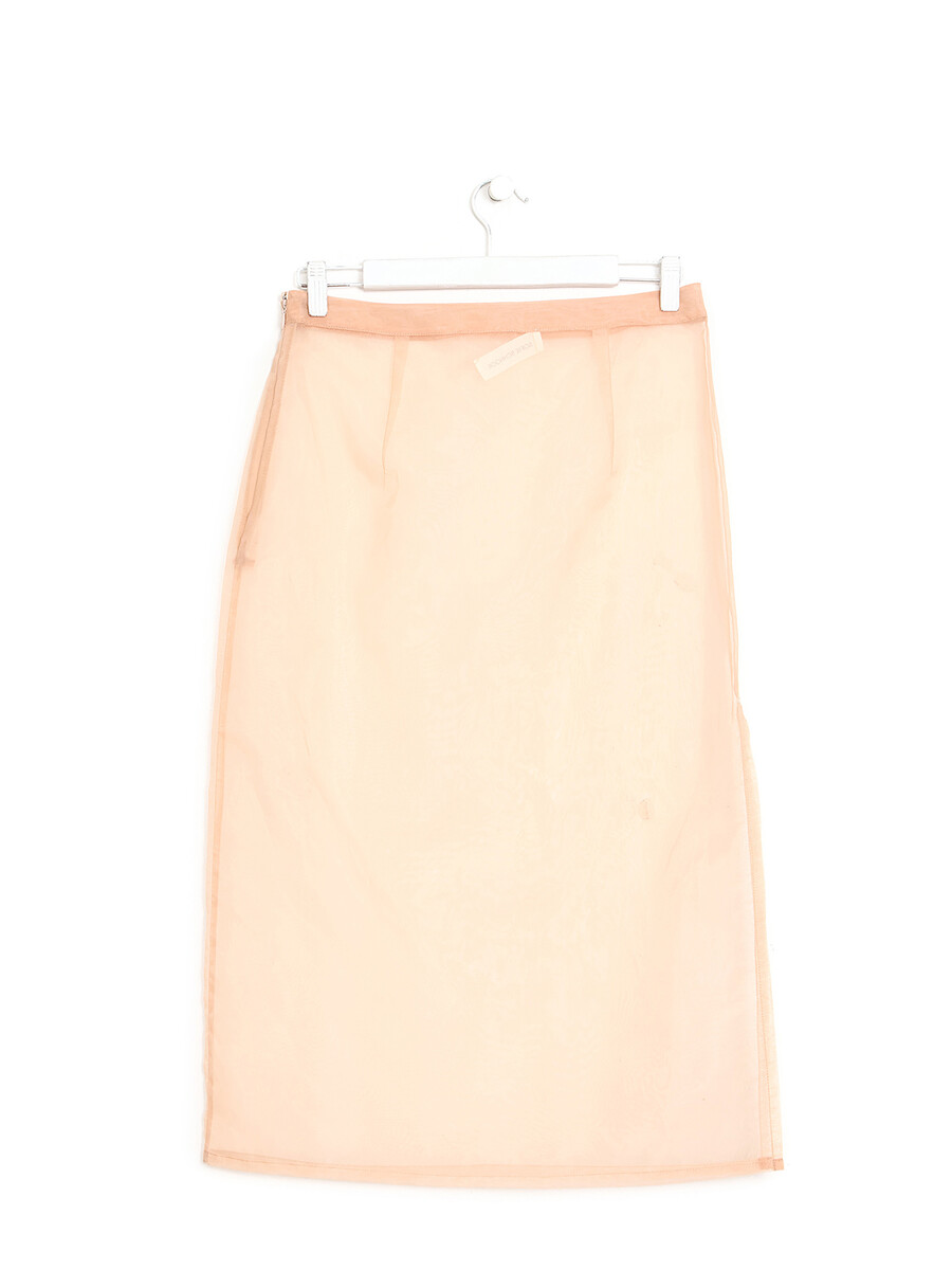 Jupe midi transparente en rose avec silhouette fluide délicate.