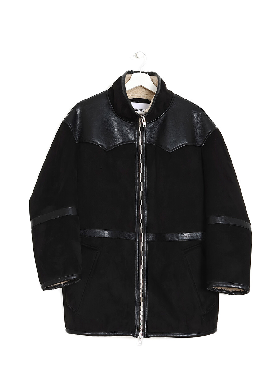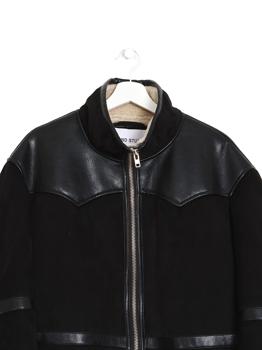 Veste à manches longues en fausse fourrure noire avec détails en faux suède et cuir. Fermeture à glissière argentée au devant.