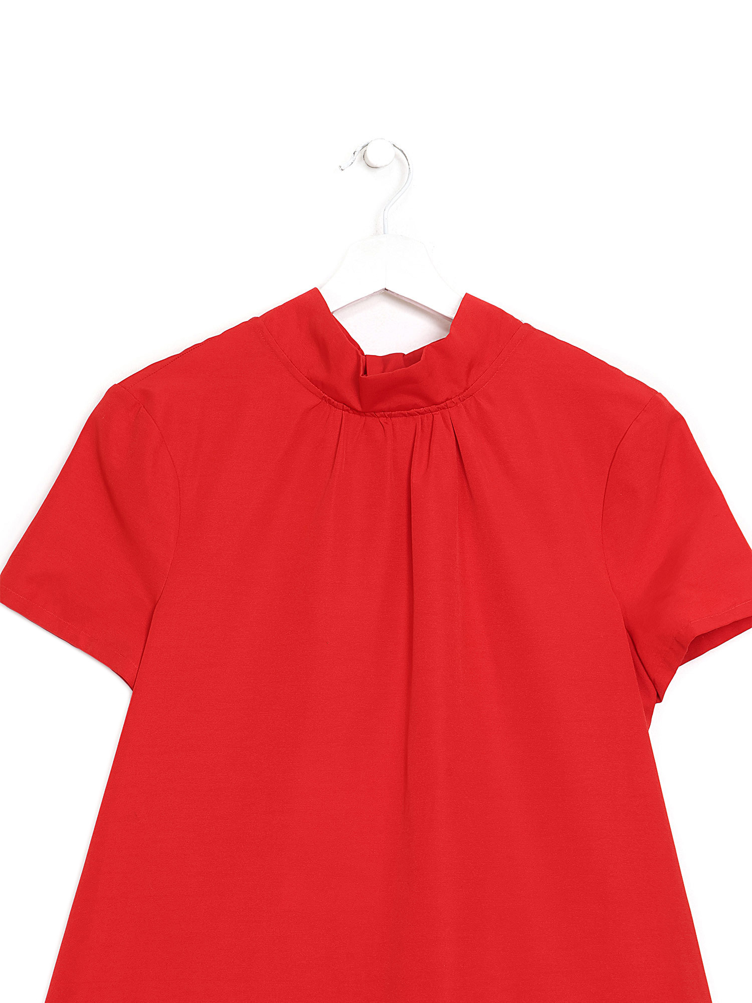 Robe rouge à manches courtes avec une bande à nouer à l'arrière. Mélange de coton et polyester.