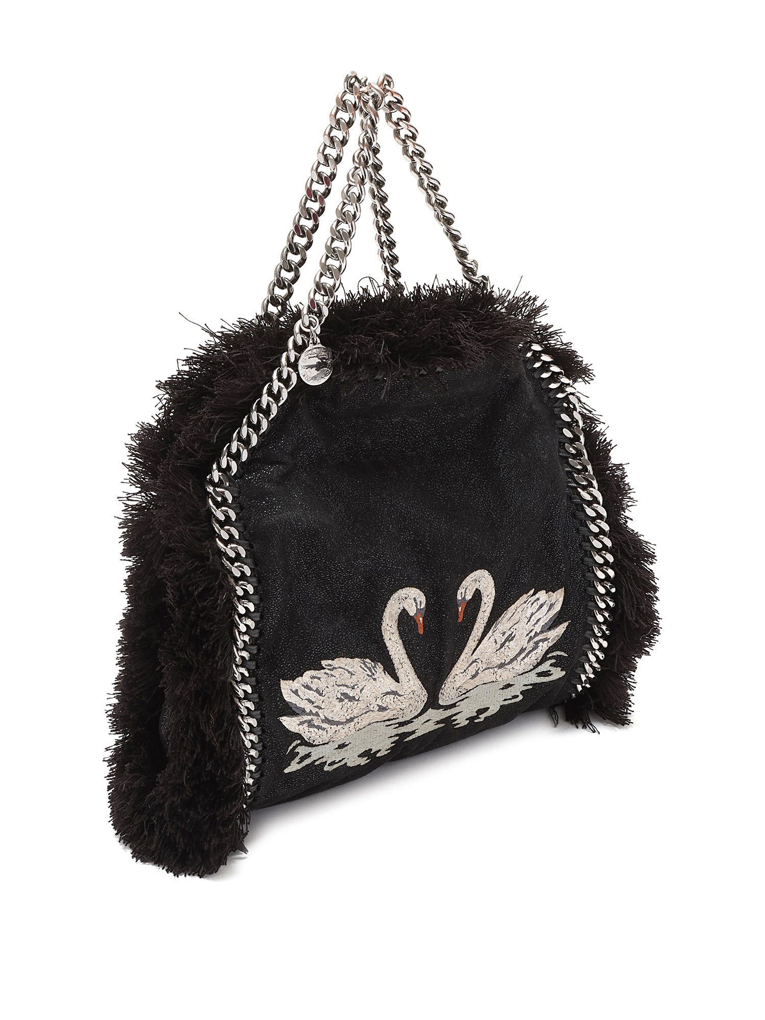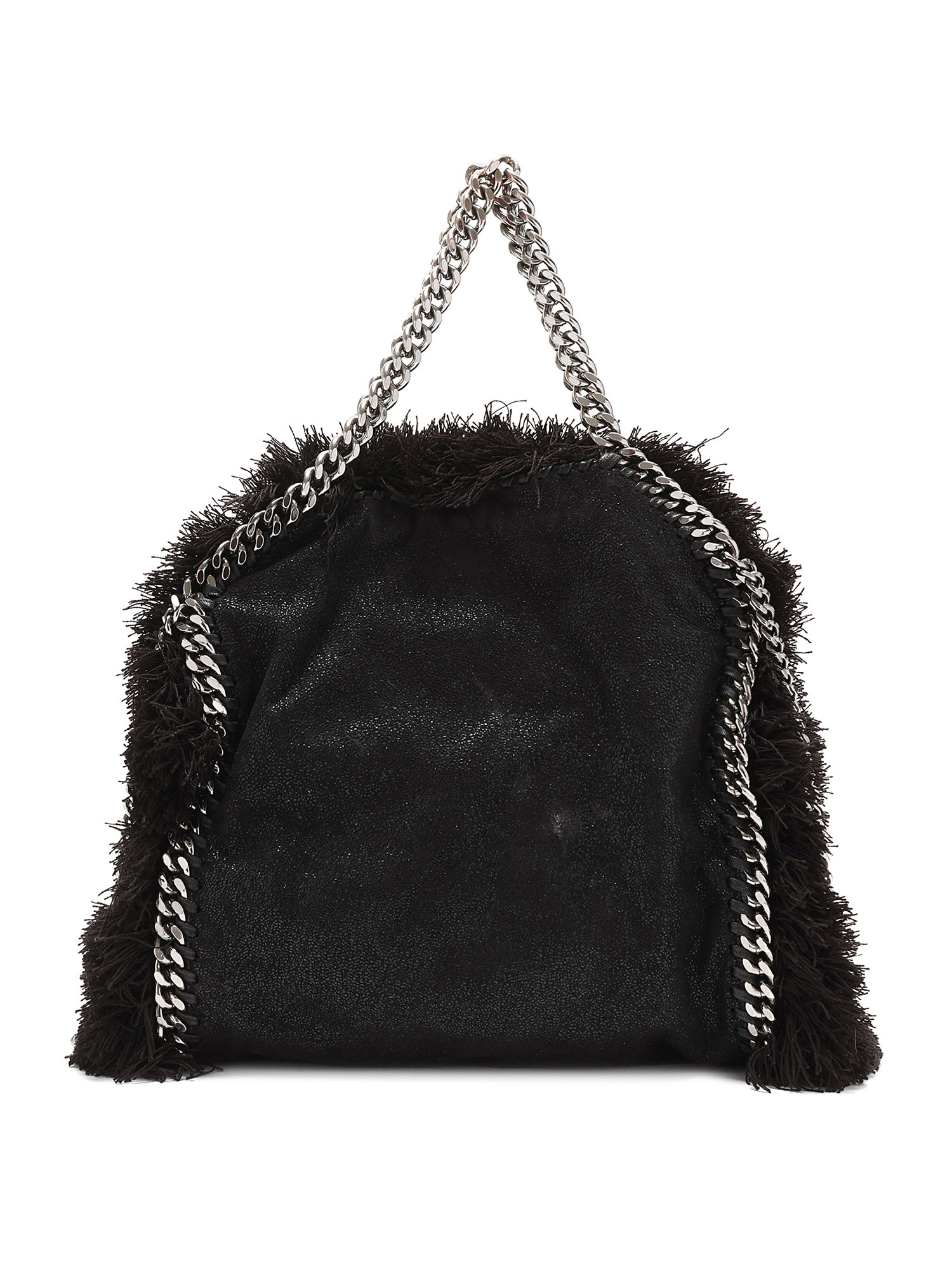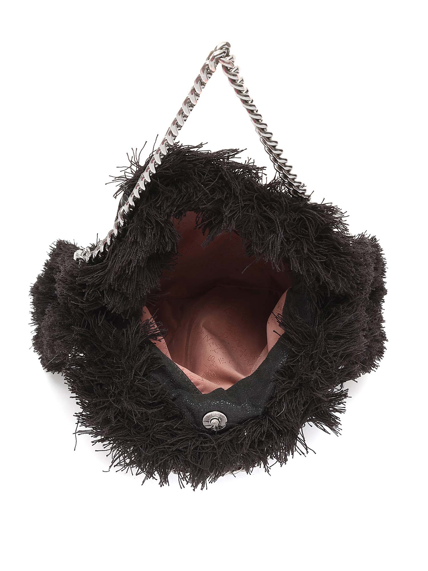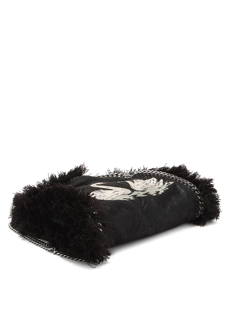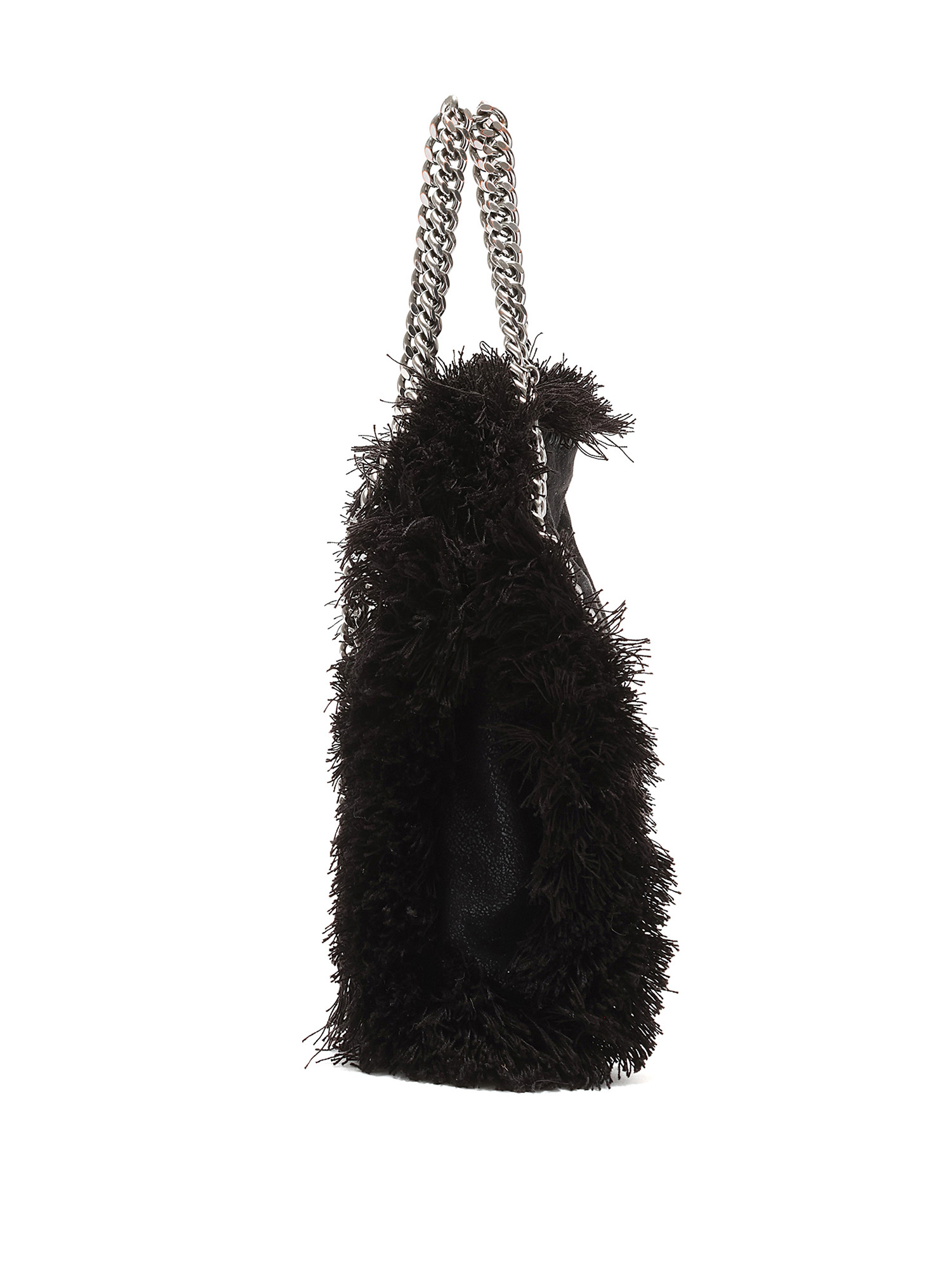 Sac à l'épaule en cuir grainé noir avec motif de signes embossés. Fermeture à pression. Bandoulière à chaîne. Bordures à franges. Quincaillerie de tons argentés.