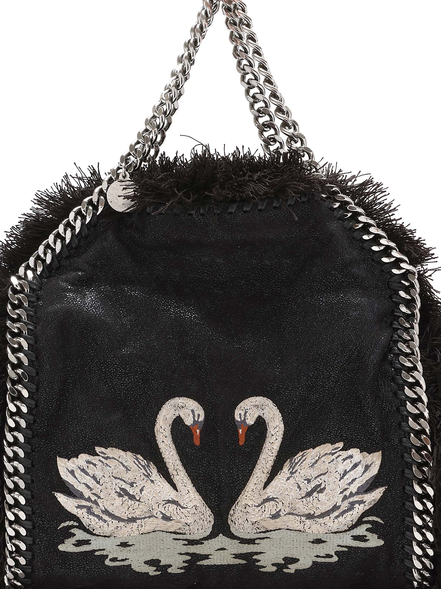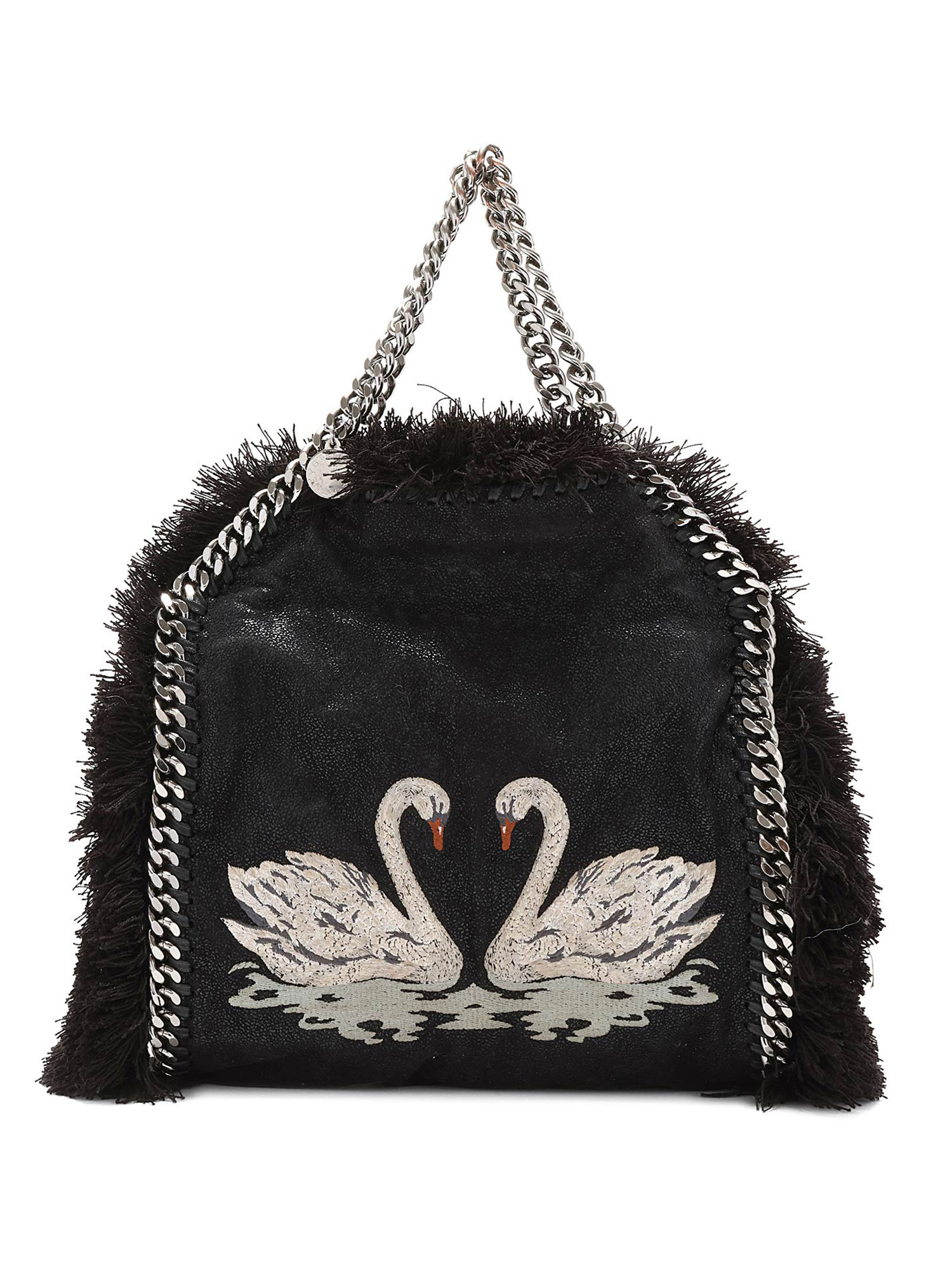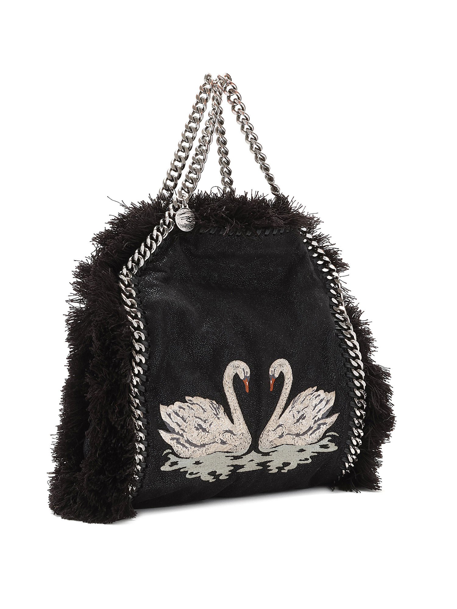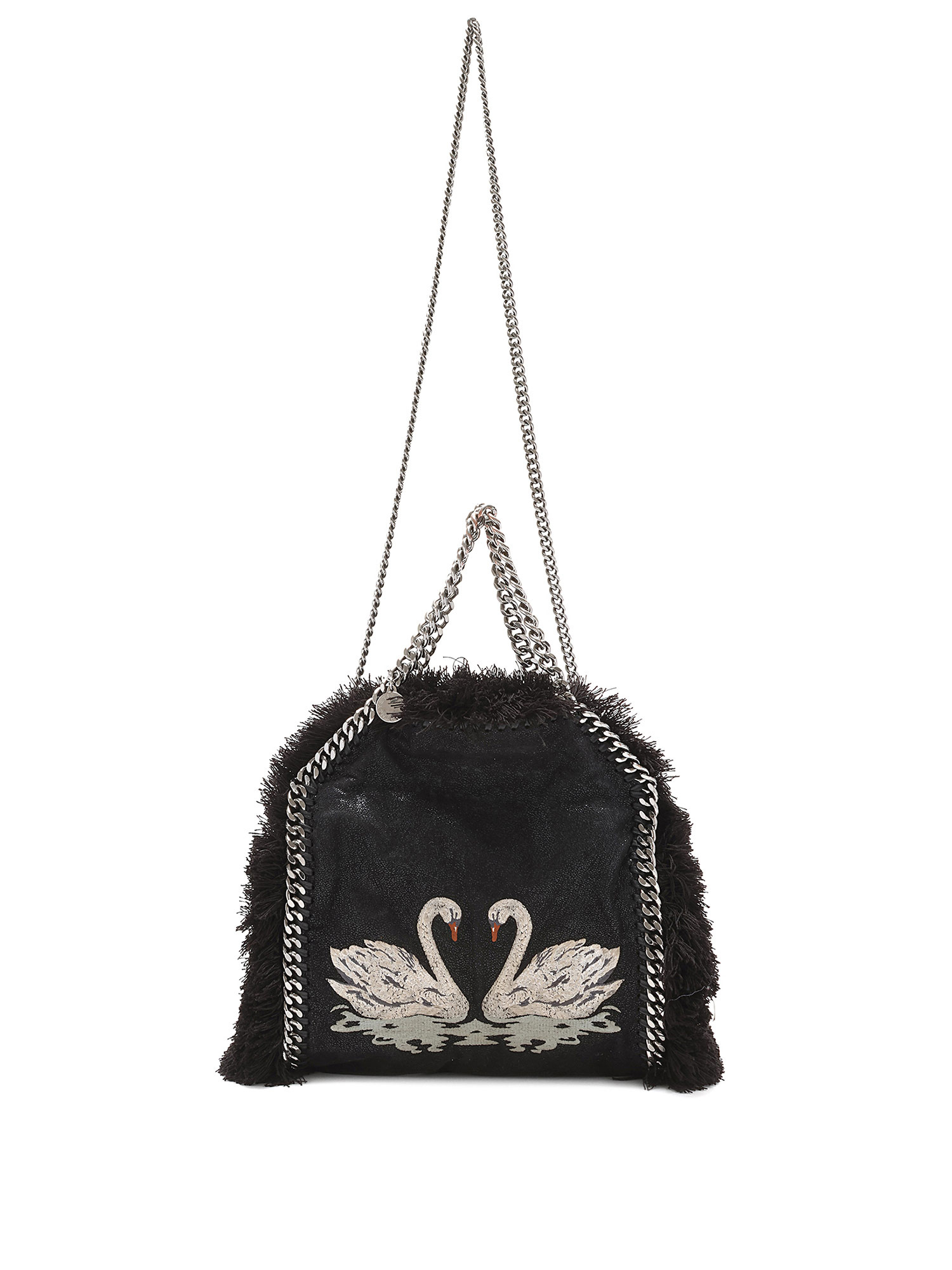 Sac à l'épaule en cuir grainé noir avec motif de signes embossés. Fermeture à pression. Bandoulière à chaîne. Bordures à franges. Quincaillerie de tons argentés.