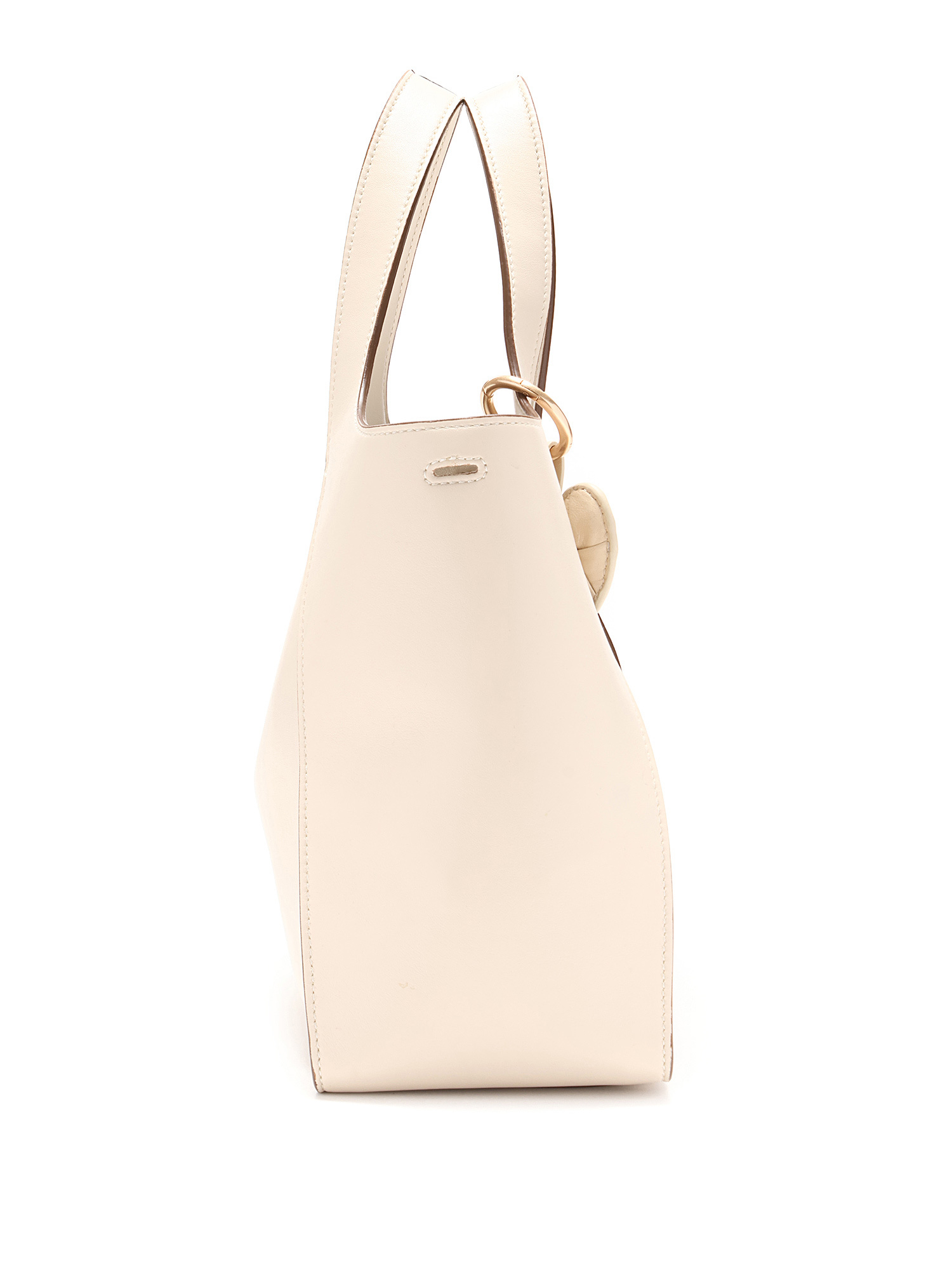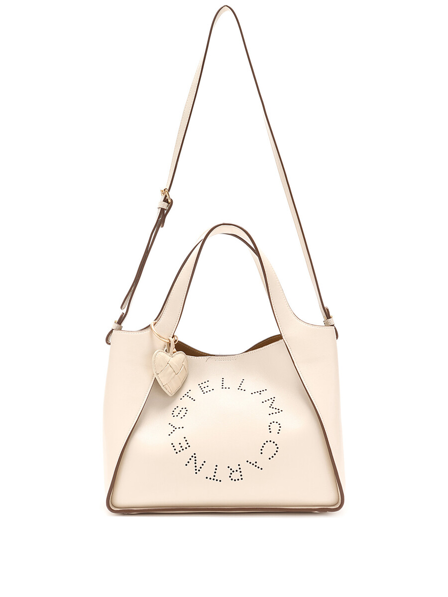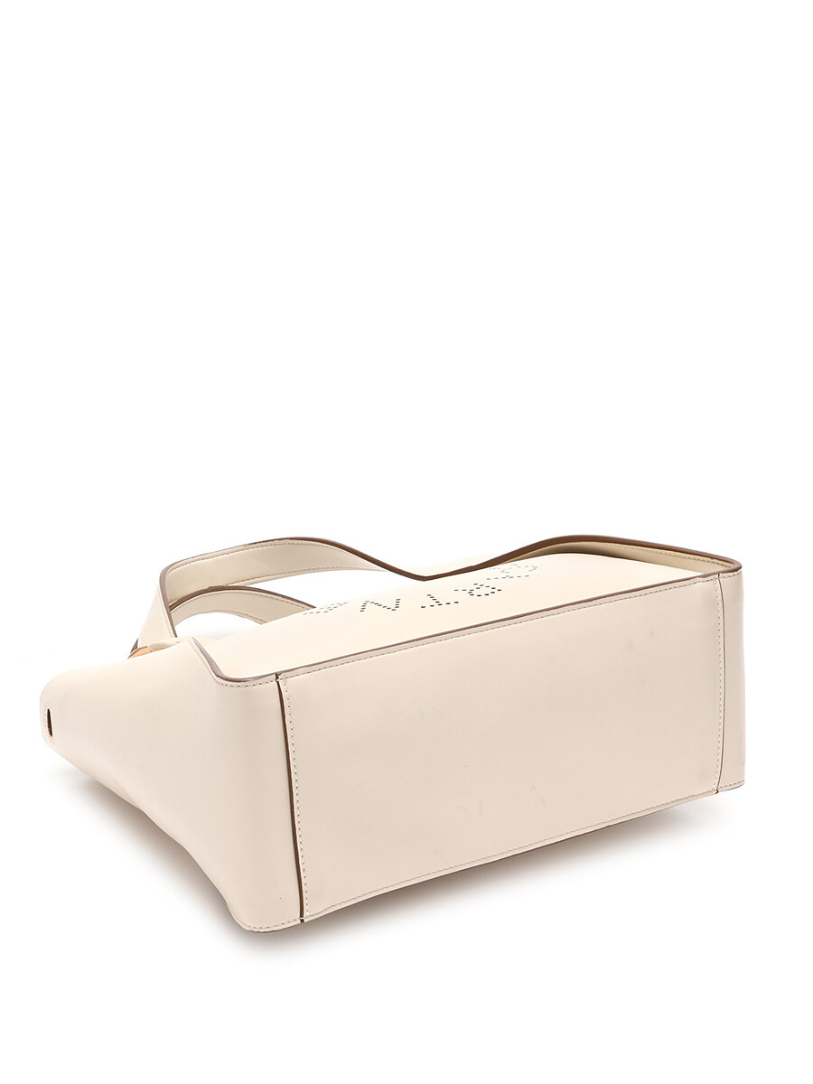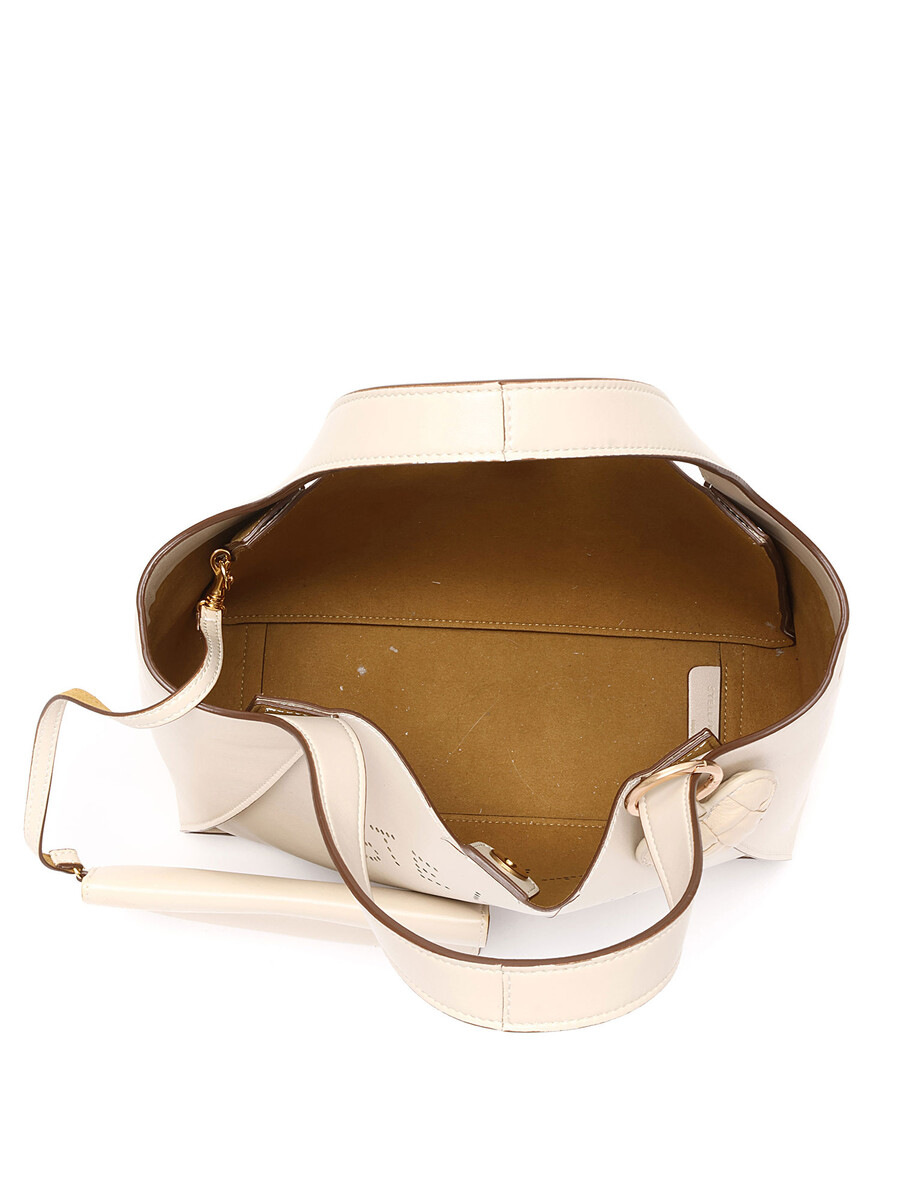 Sac bandoulière blanc en polyuréthane à logo perforé. Garnitures brunes. Quincaillerie dorée. Fermeture à pression. Bandoulière réglable. Avec dust bag.