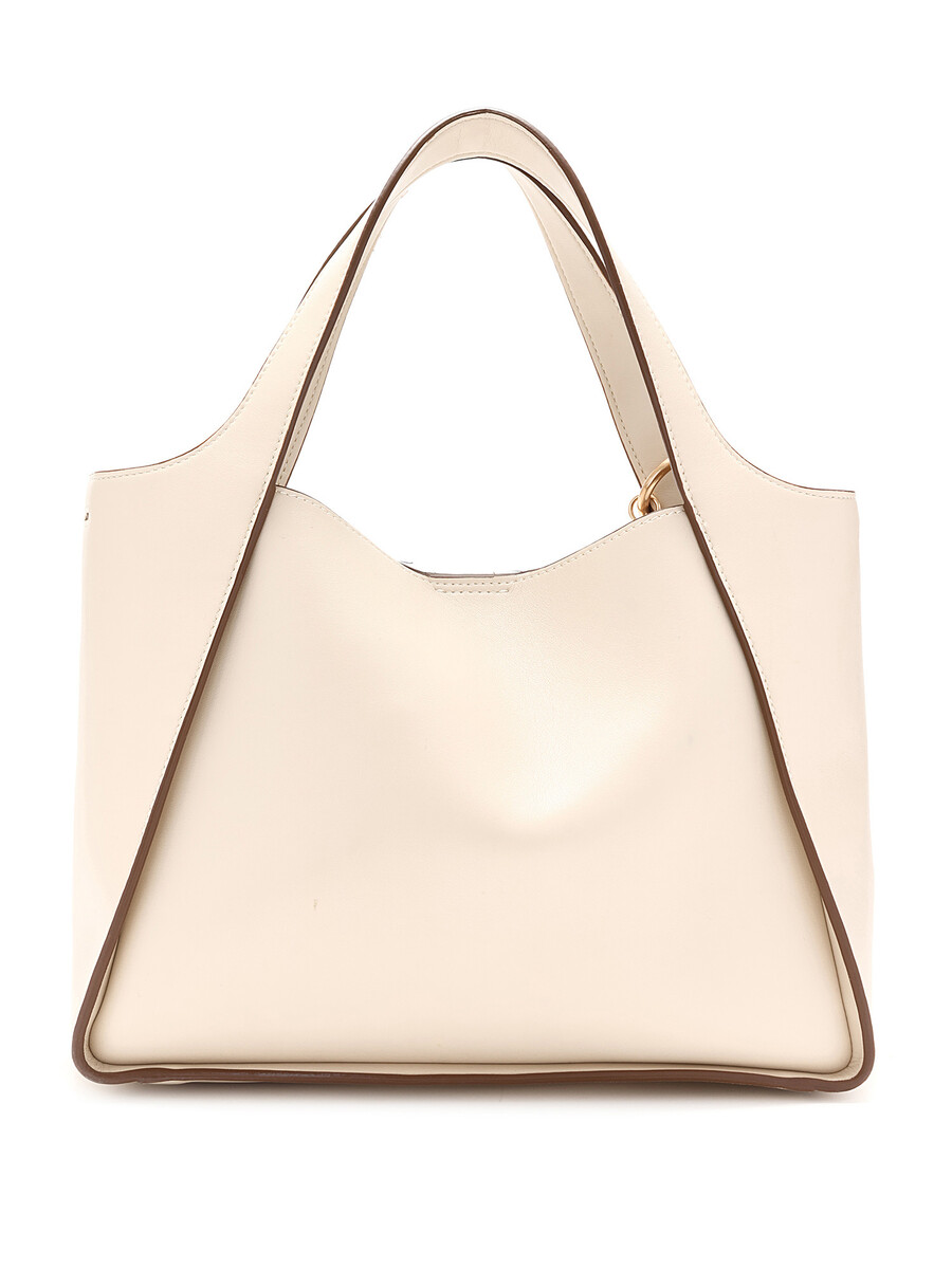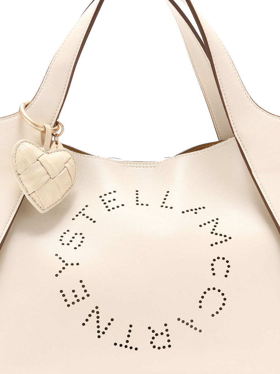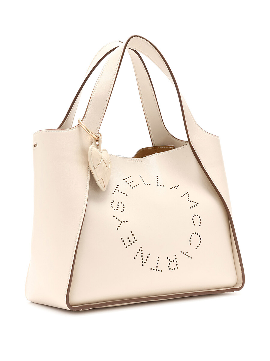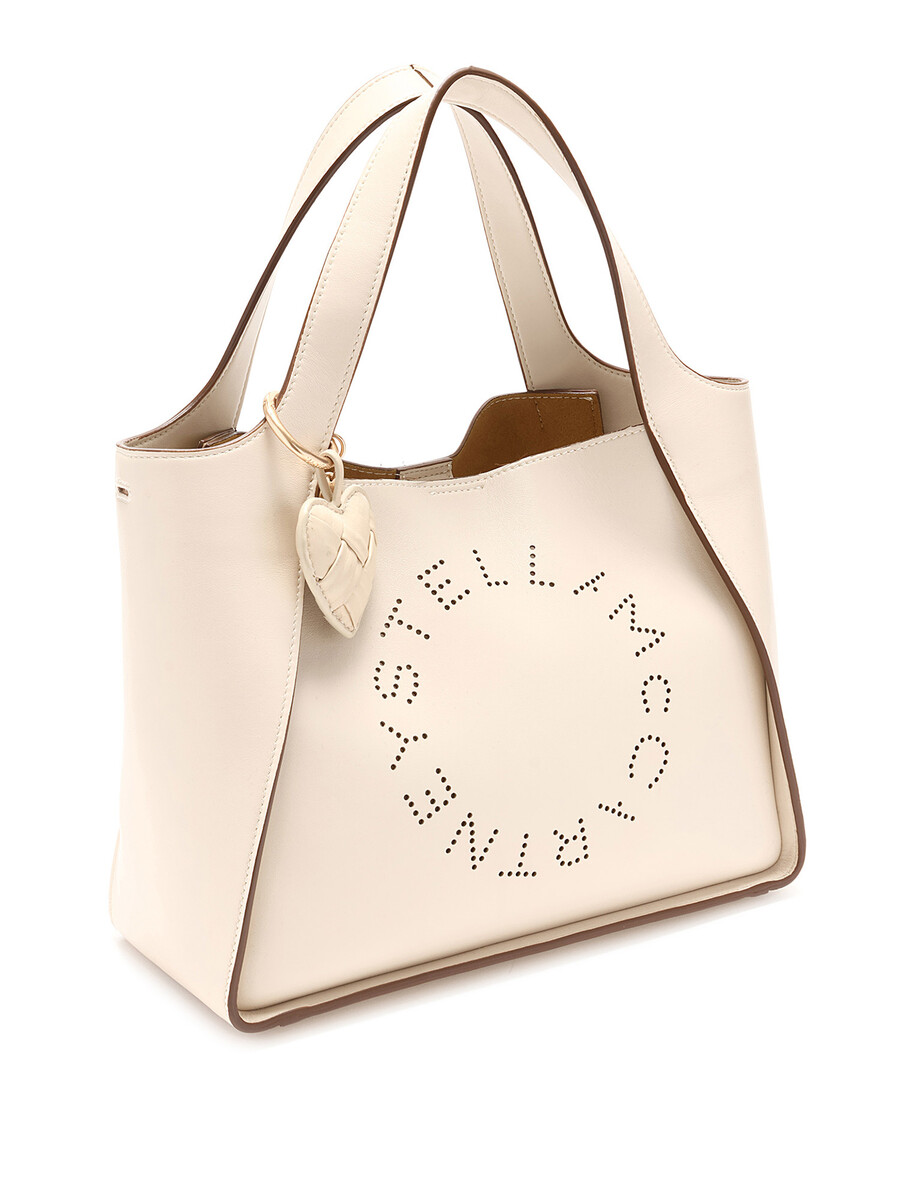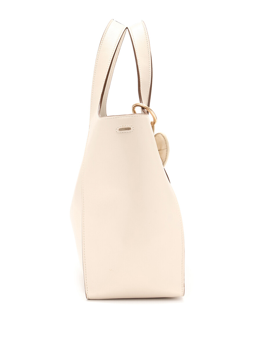 Sac bandoulière blanc en polyuréthane à logo perforé. Garnitures brunes. Quincaillerie dorée. Fermeture à pression. Bandoulière réglable. Avec dust bag.