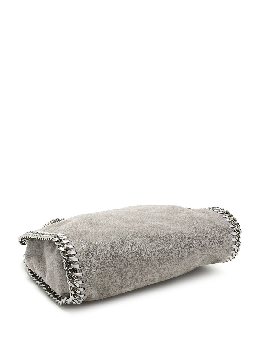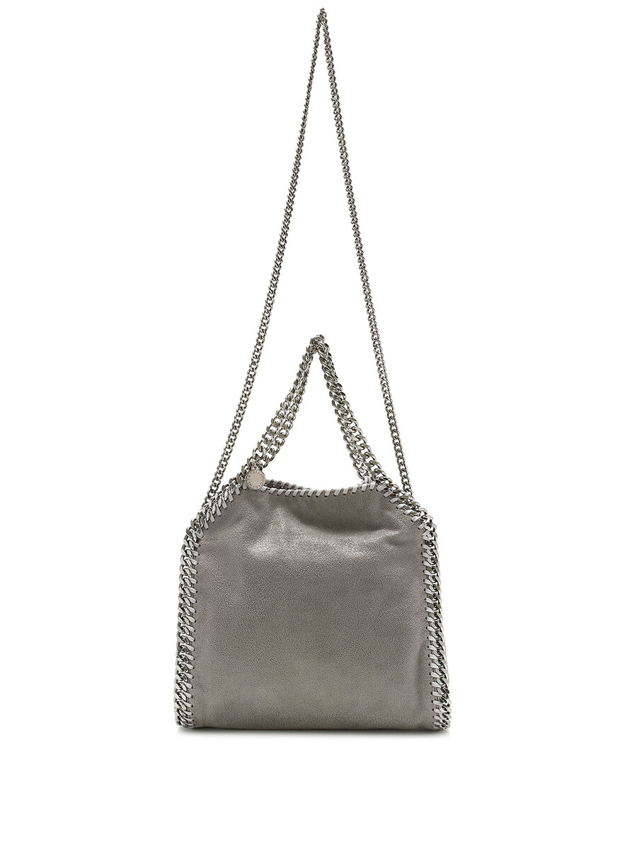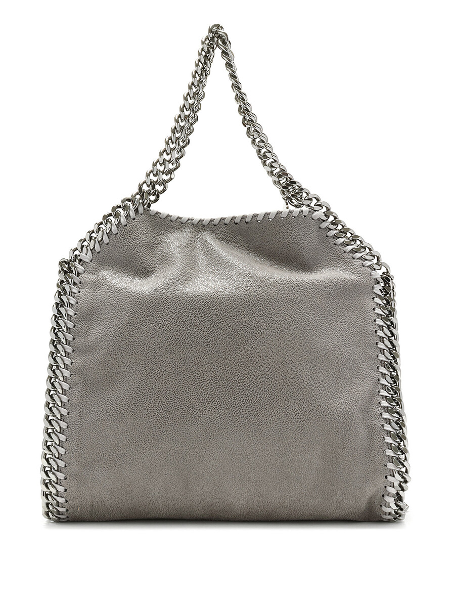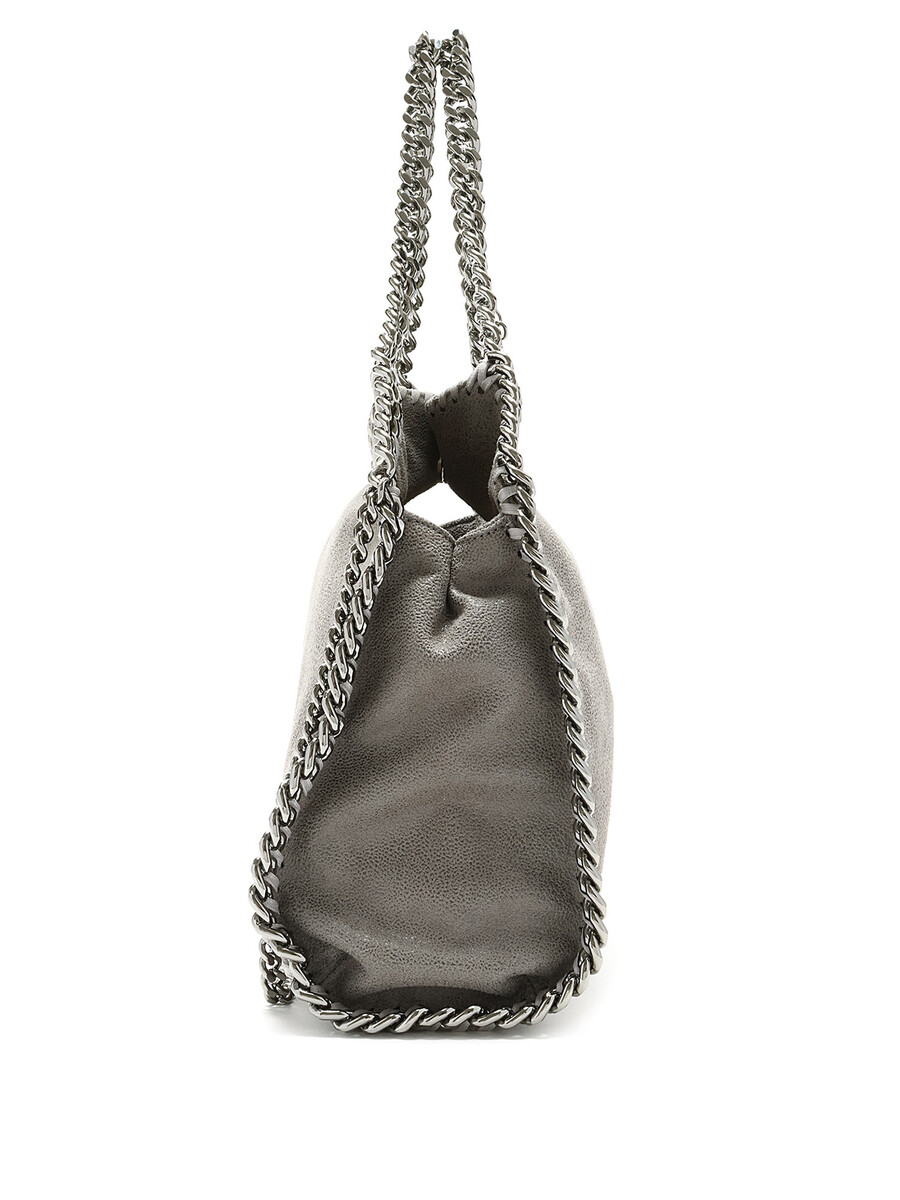 Mini sac Falabella en gris avec une construction en cuir faux. Détails en point de surjet. Fermeture à bouton-pression. Chaînes et garnitures en métal argenté.
