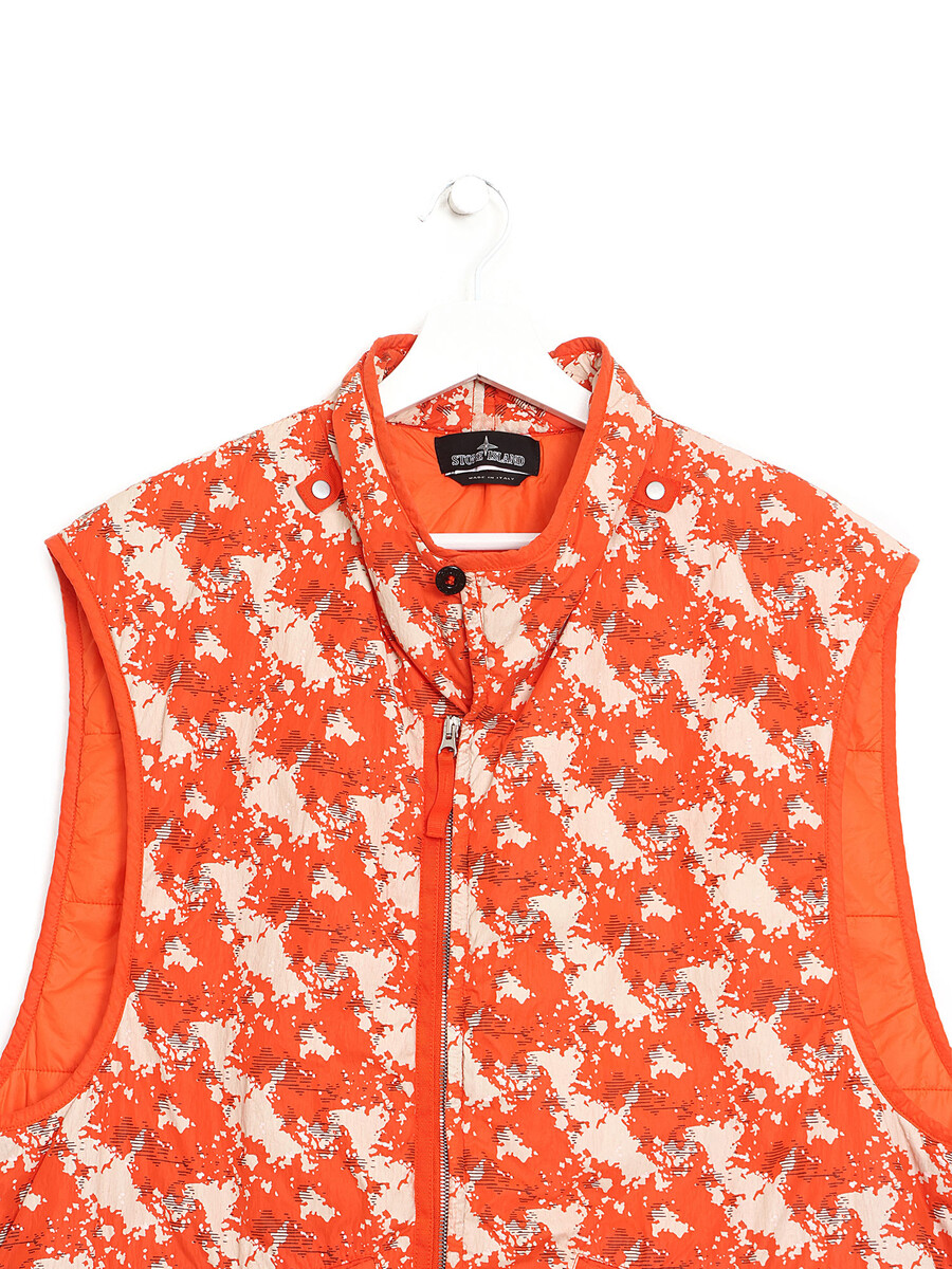 Gilet à imprimé abstrait dans les tons orange et beige. Fermeture zippée sur le devant. Col montant.