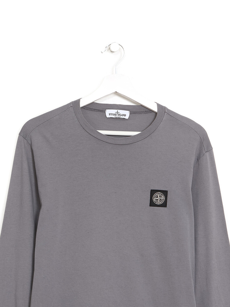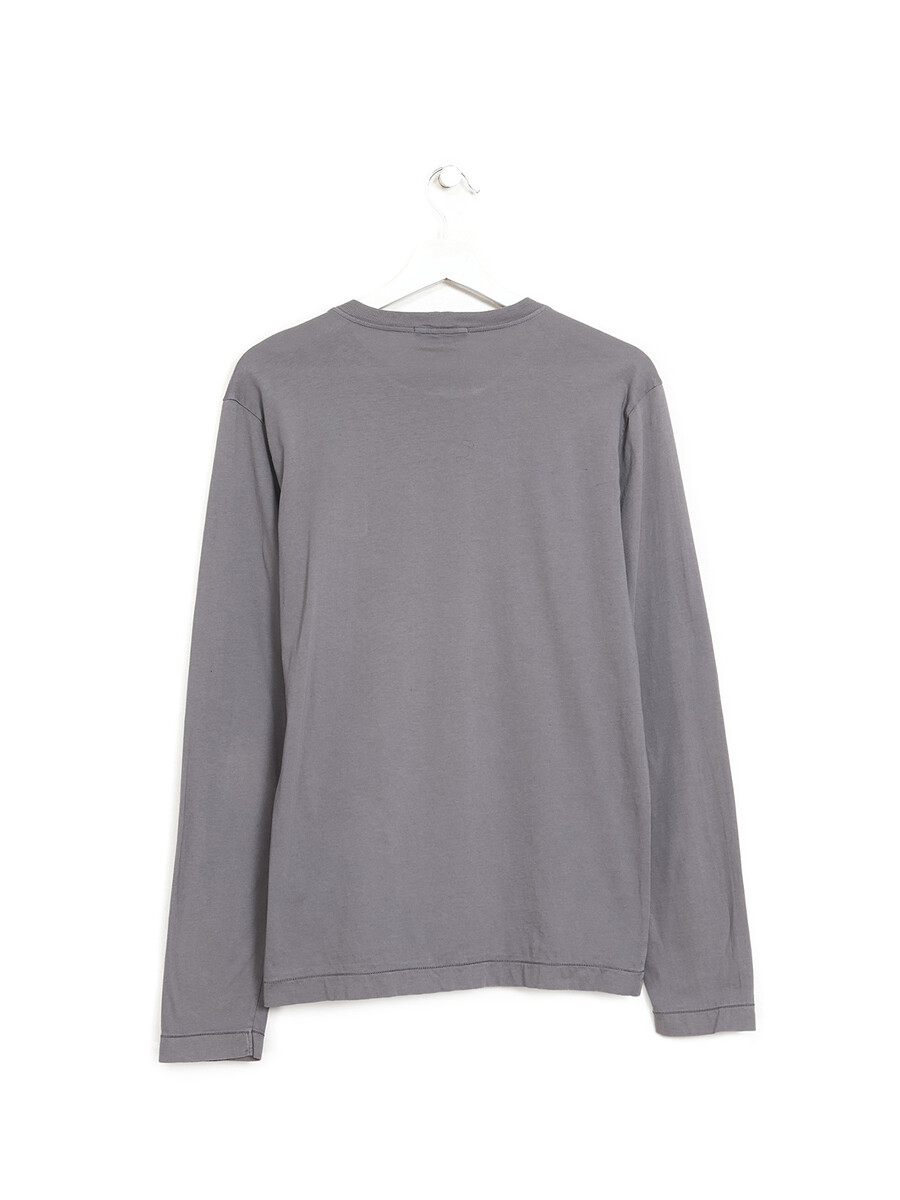 T-shirt à manches longues de couleur grise unie. Encolure ras-du-cou. Logo sur la poitrine.