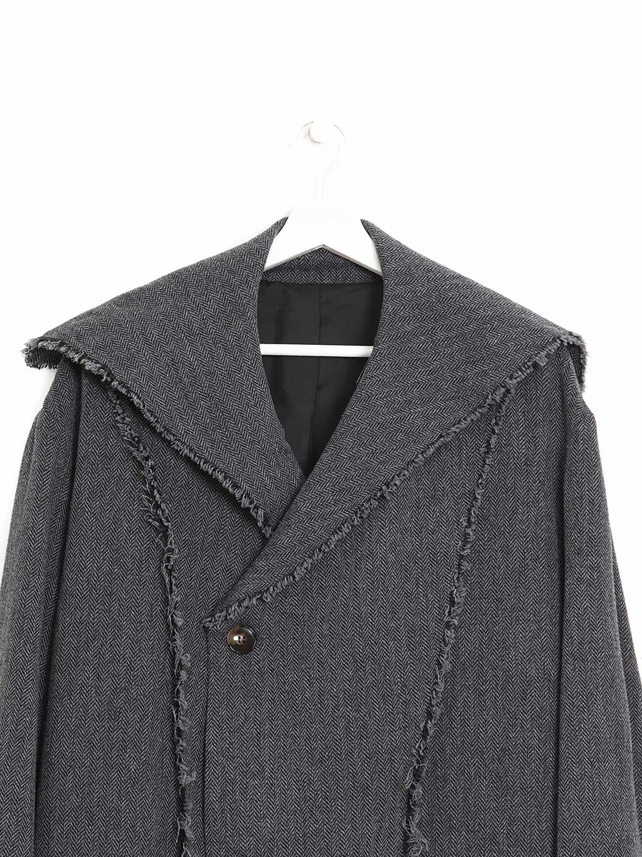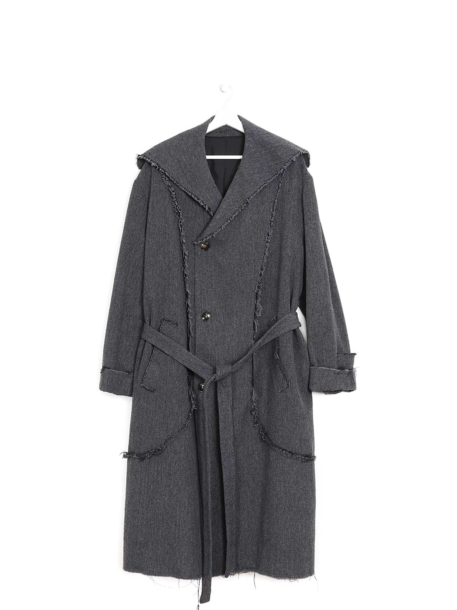 Manteau long en laine dans les tons de gris. Col large. Fermeture à boutons. Ceinture à la taille pour un ajustement sur mesure.