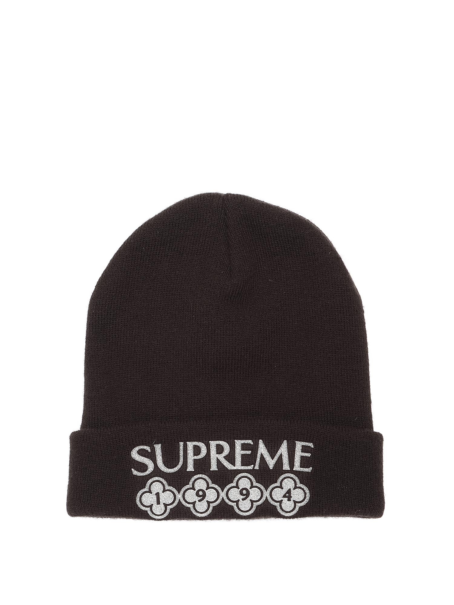 Bonnet à motif floral avec paillettes et texte 'SUPREME'. Tricot doux en acrylique.