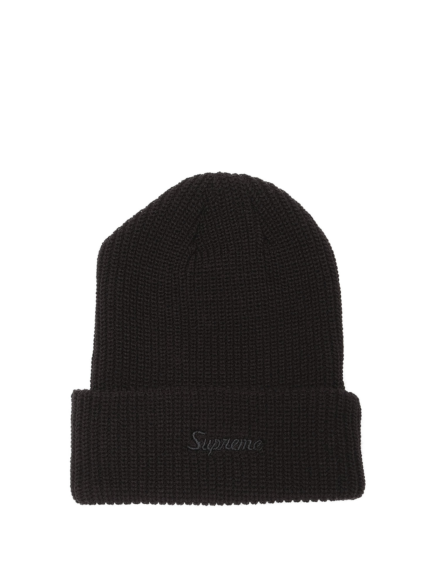 Bonnet en tricot côtelé noir avec broderie ton sur ton. Style classique à revers.