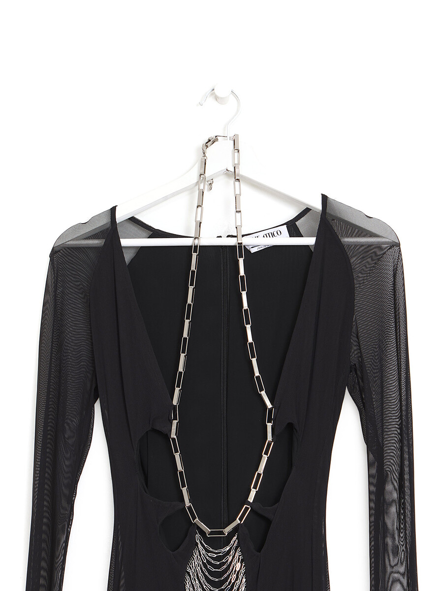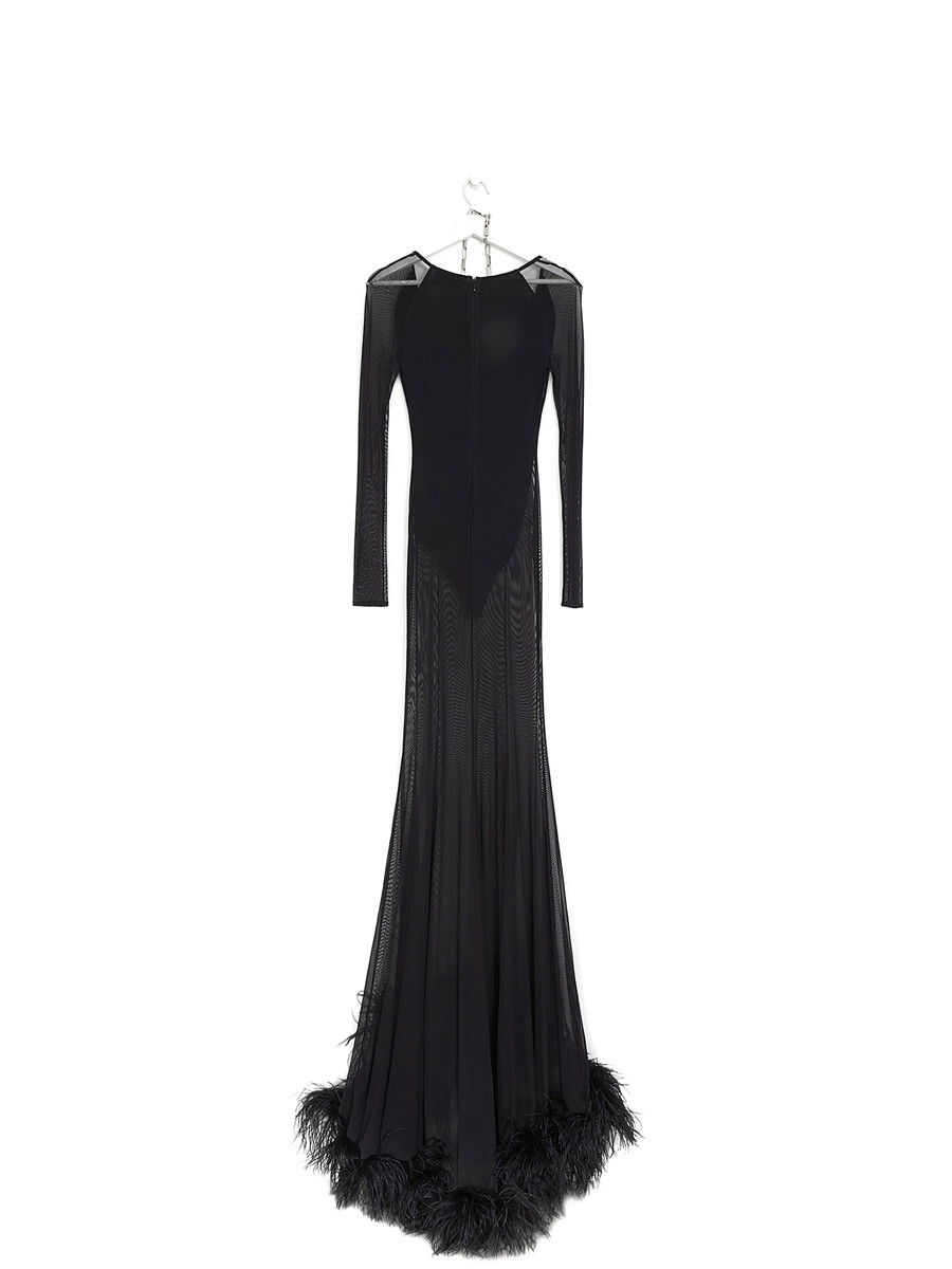 Robe maxi à manches longues avec panneaux en filet et accents de plumes en noir. Doublure justaucorps. Détails de chaînes au devant.