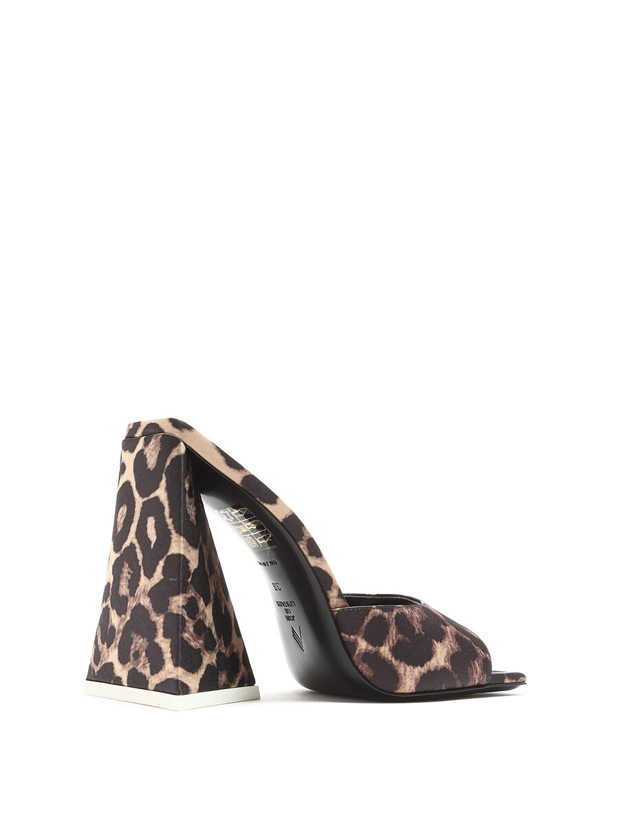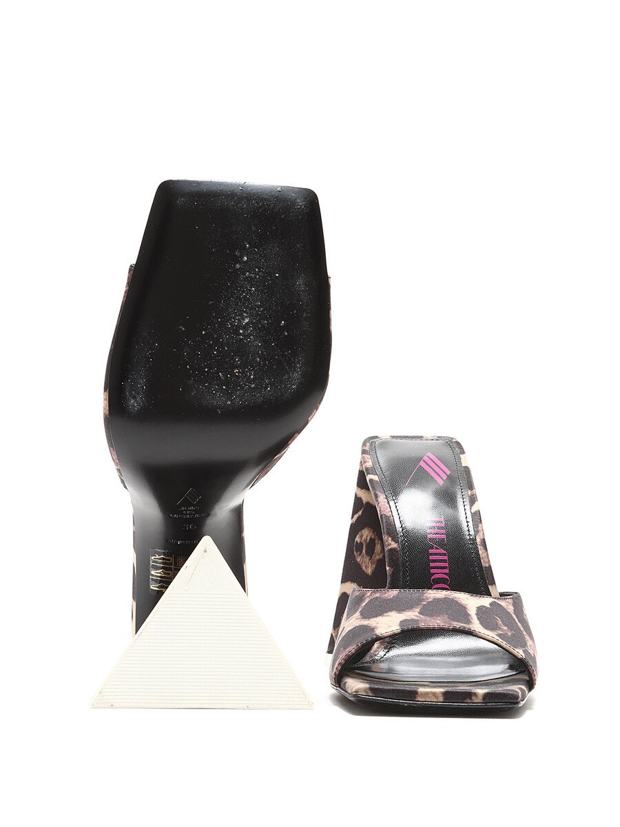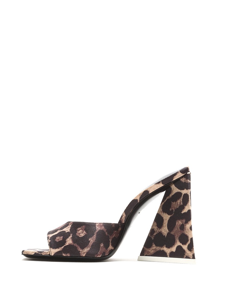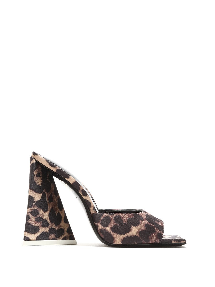 Mules à motif léopard en brun et noir. Bout carré. Semelle en cuir.