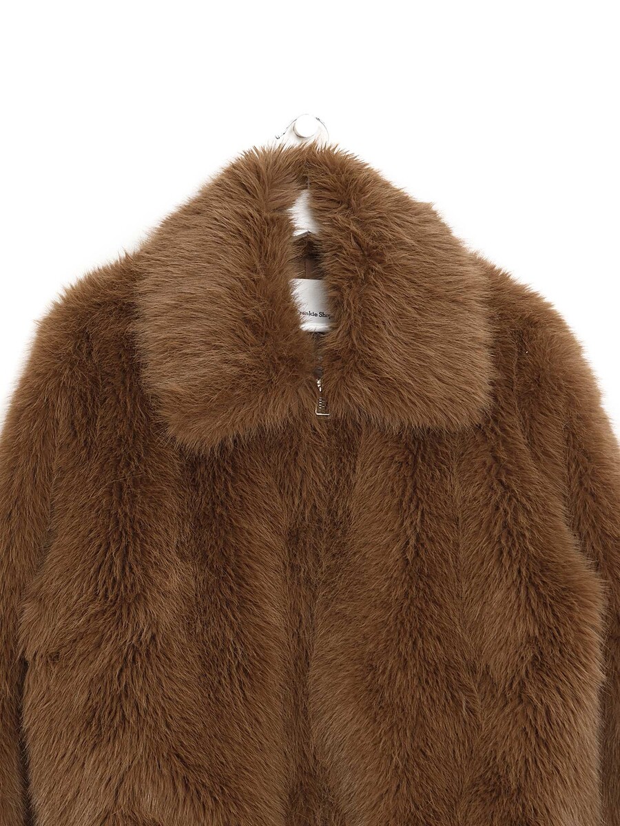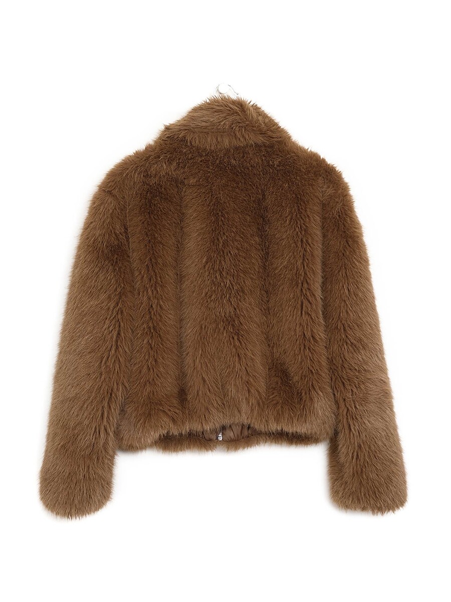 Manteau à manches longues en fausse fourrure brune à la texture luxueuse. Fermeture à glissière.