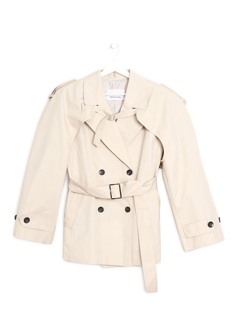 Trench-coat convertible à double boutonnage en beige comprenant un gilet et des manches amovibles, offrant une polyvalence d'usages. Fermeture à boutons et silhouette classique de trench.