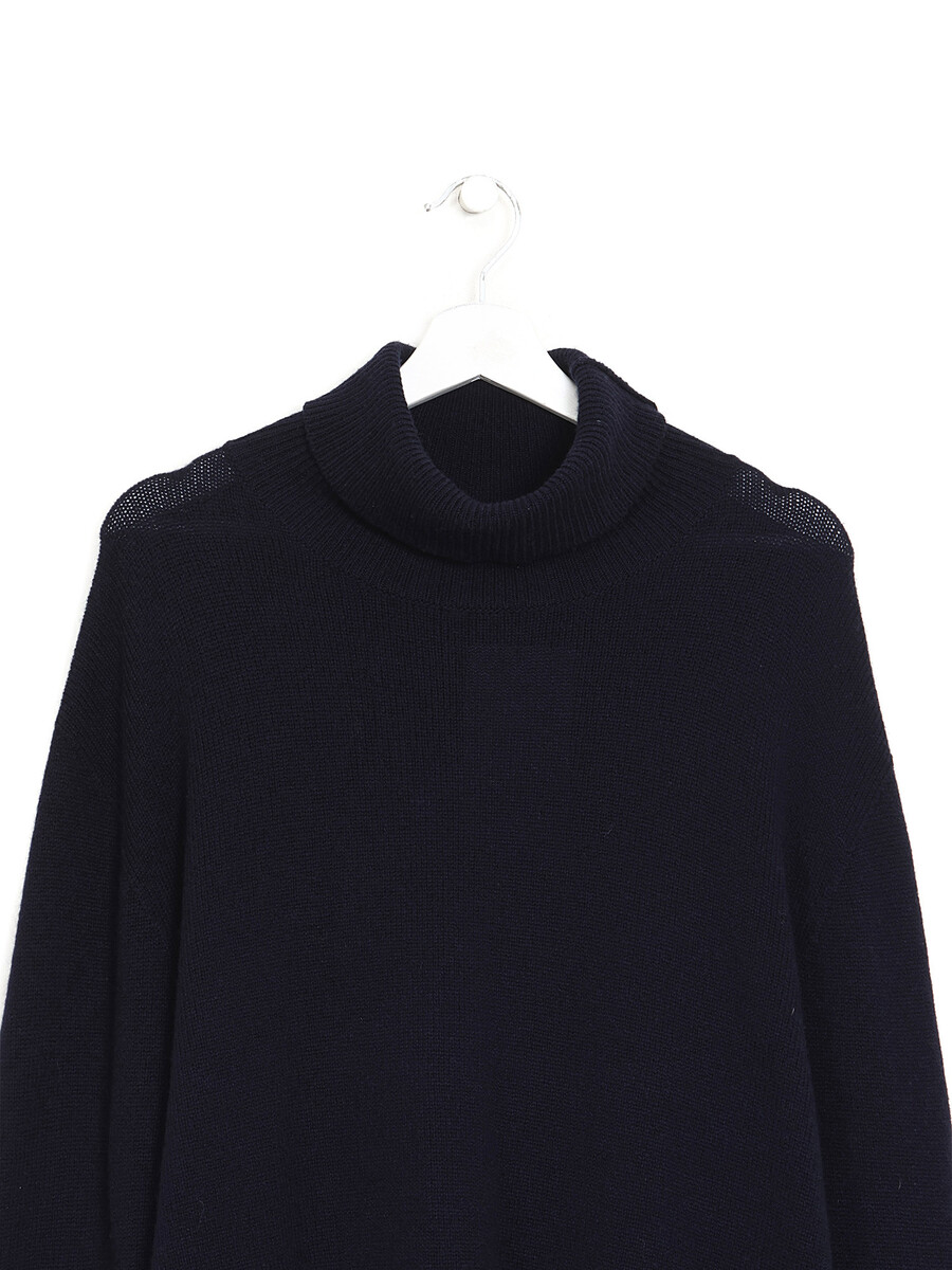 Chandail col roulé en laine bleu foncé, mélangé de cachemire.
