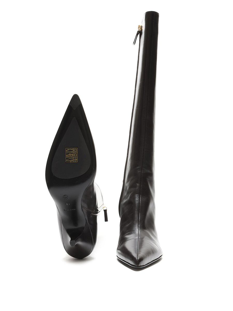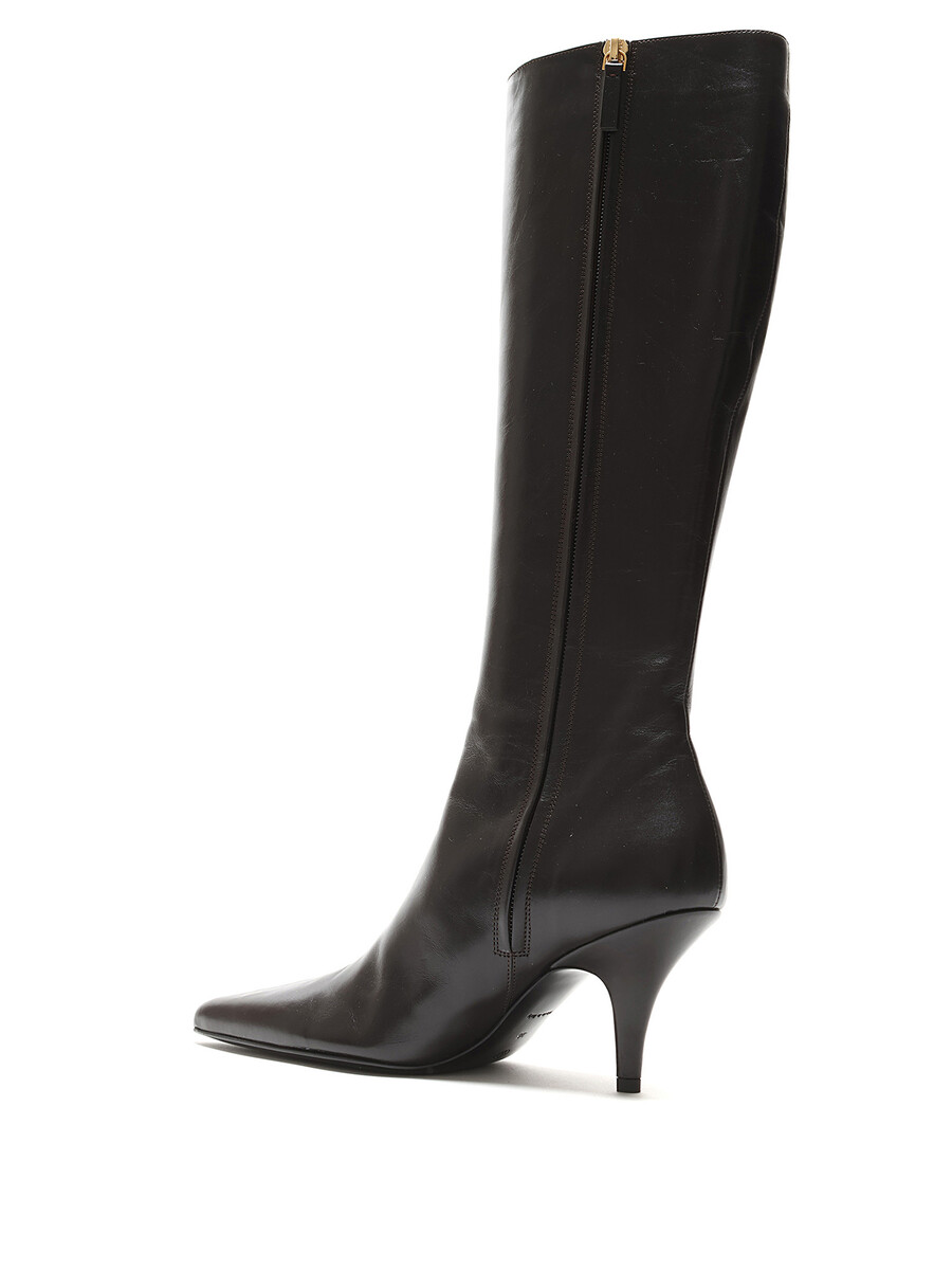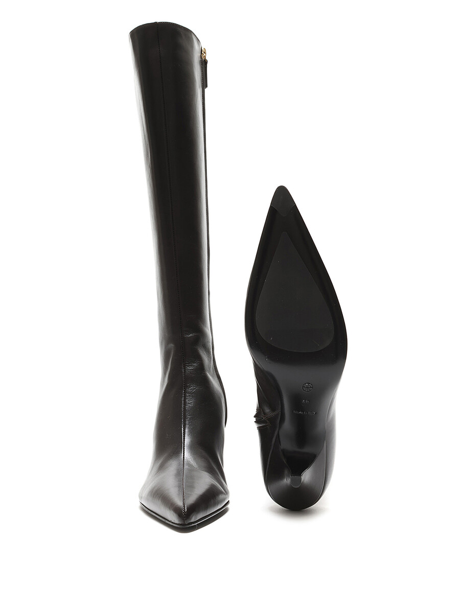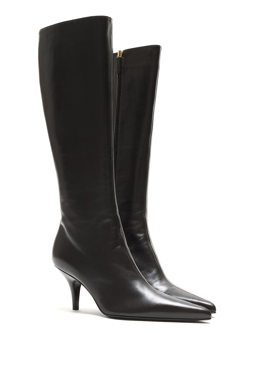 Bottes à talon en cuir grainé couleur noire, hauteur genou. Fermeture éclair sur le côté et bout pointu. Semelle en cuir élégante.