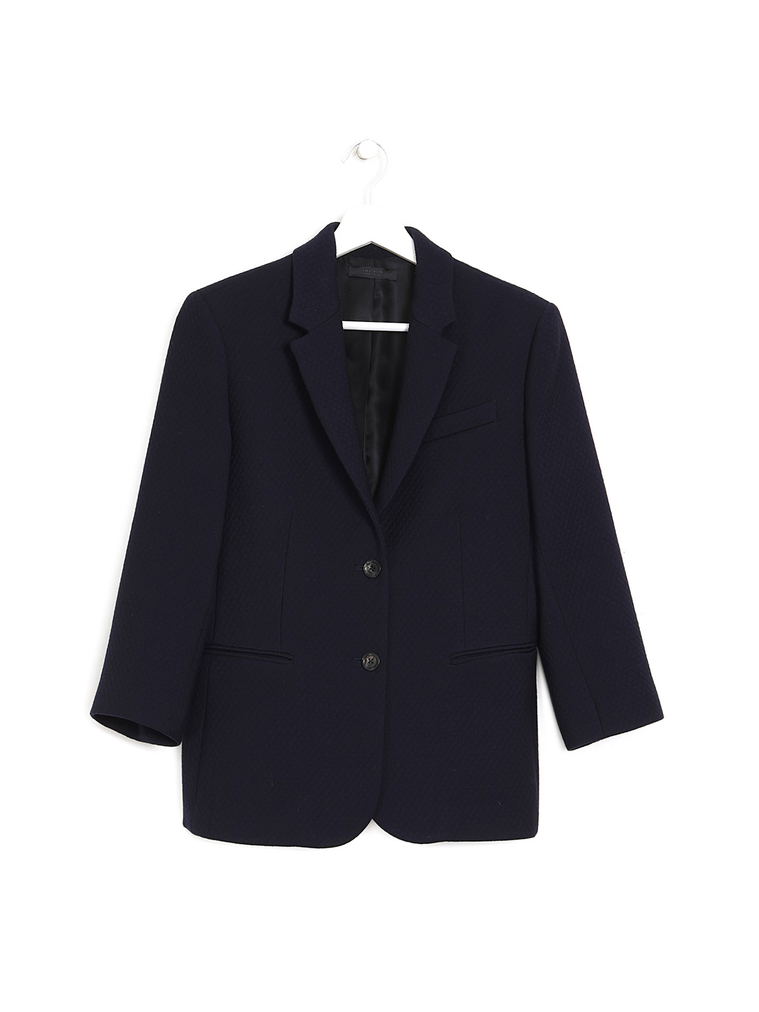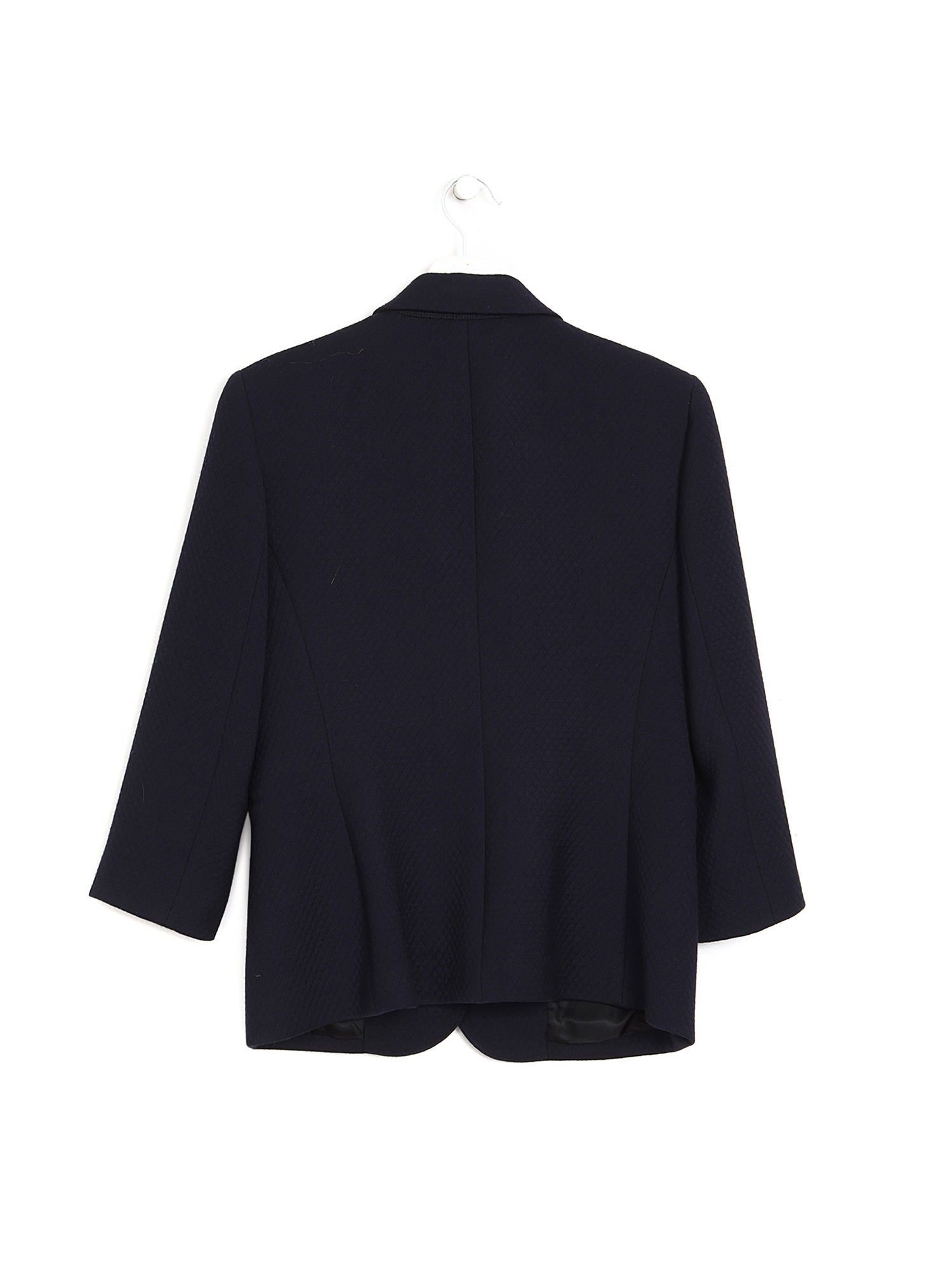 Veste de laine à manches longues texturée en bleu foncé. Fermeture à boutons devant. Col à revers cranté. Trois poches.