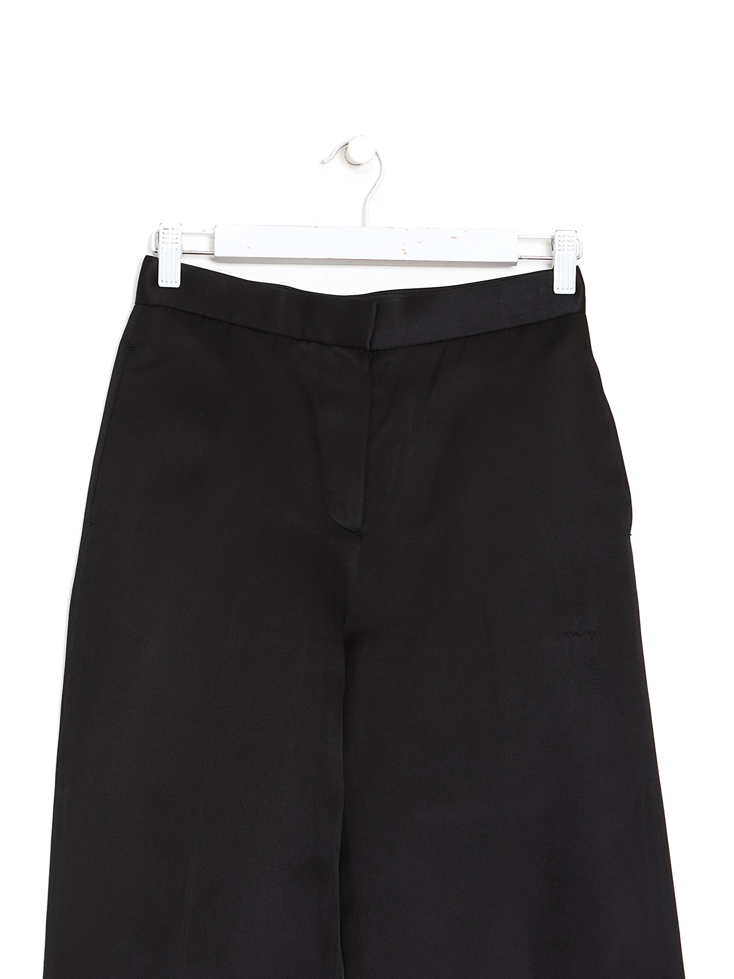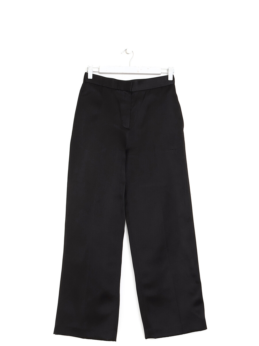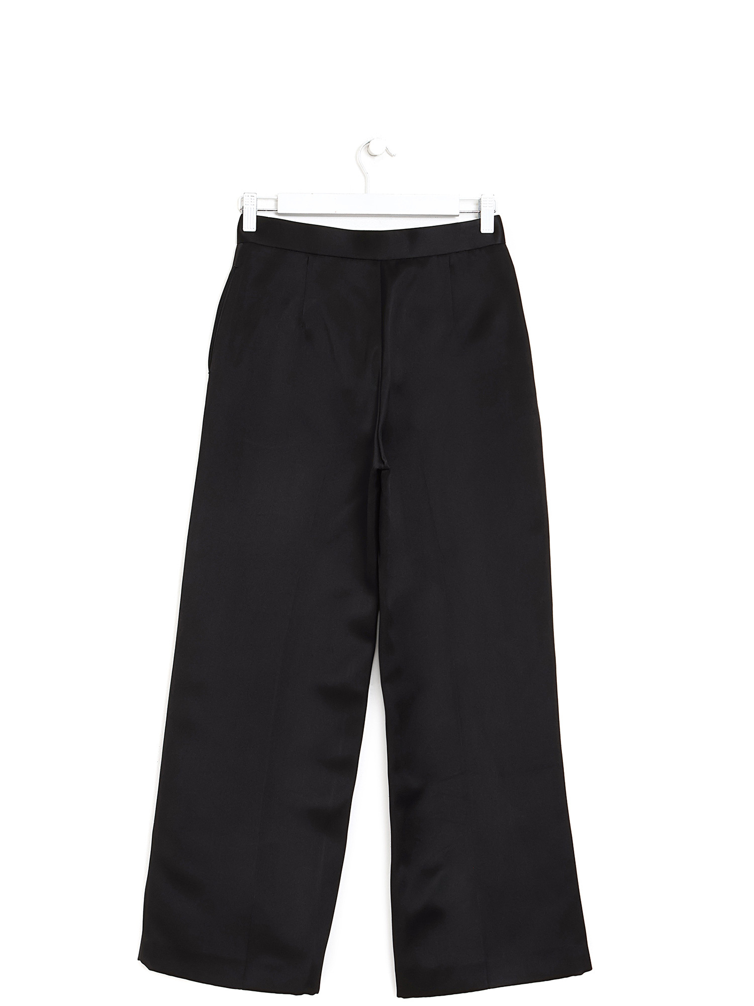 Pantalon large en soie noir. Fermeture éclair avec bouton. Silhouette élégante et fluide.
