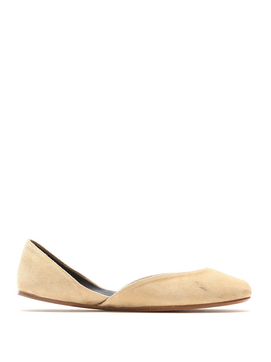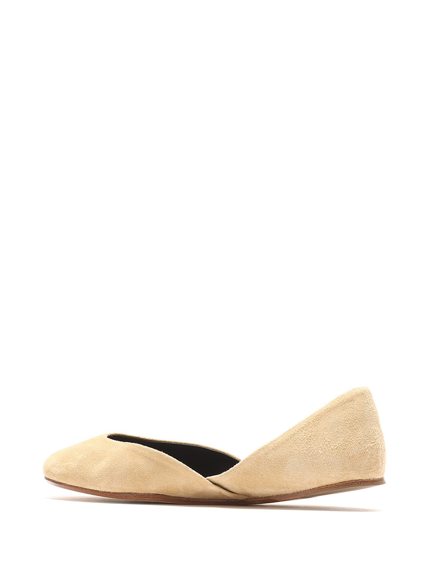 Ballerines en suède beige avec design à enfiler. Ces ballerines présentent un bout rond fermé et une semelle en cuir, offrant une finition sophistiquée à toute tenue. Avec boîte.