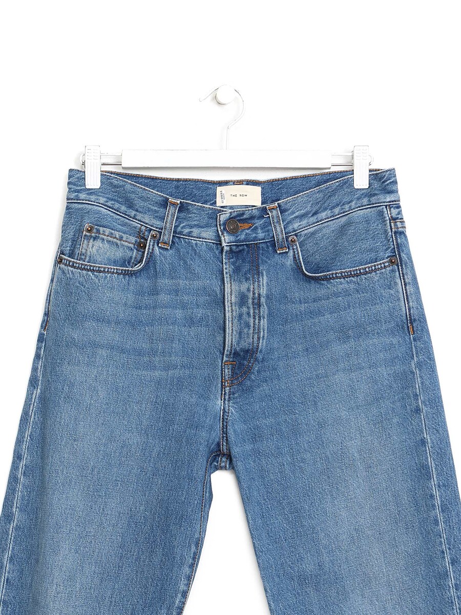 Jean bleu à coupe droite et taille mi-haute. Fermeture à boutons sur le devant. Cinq poches.