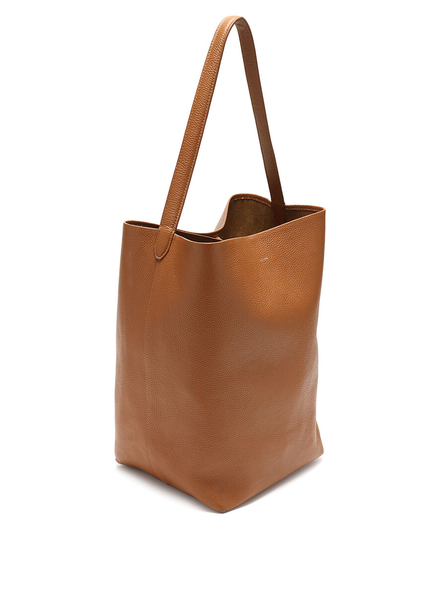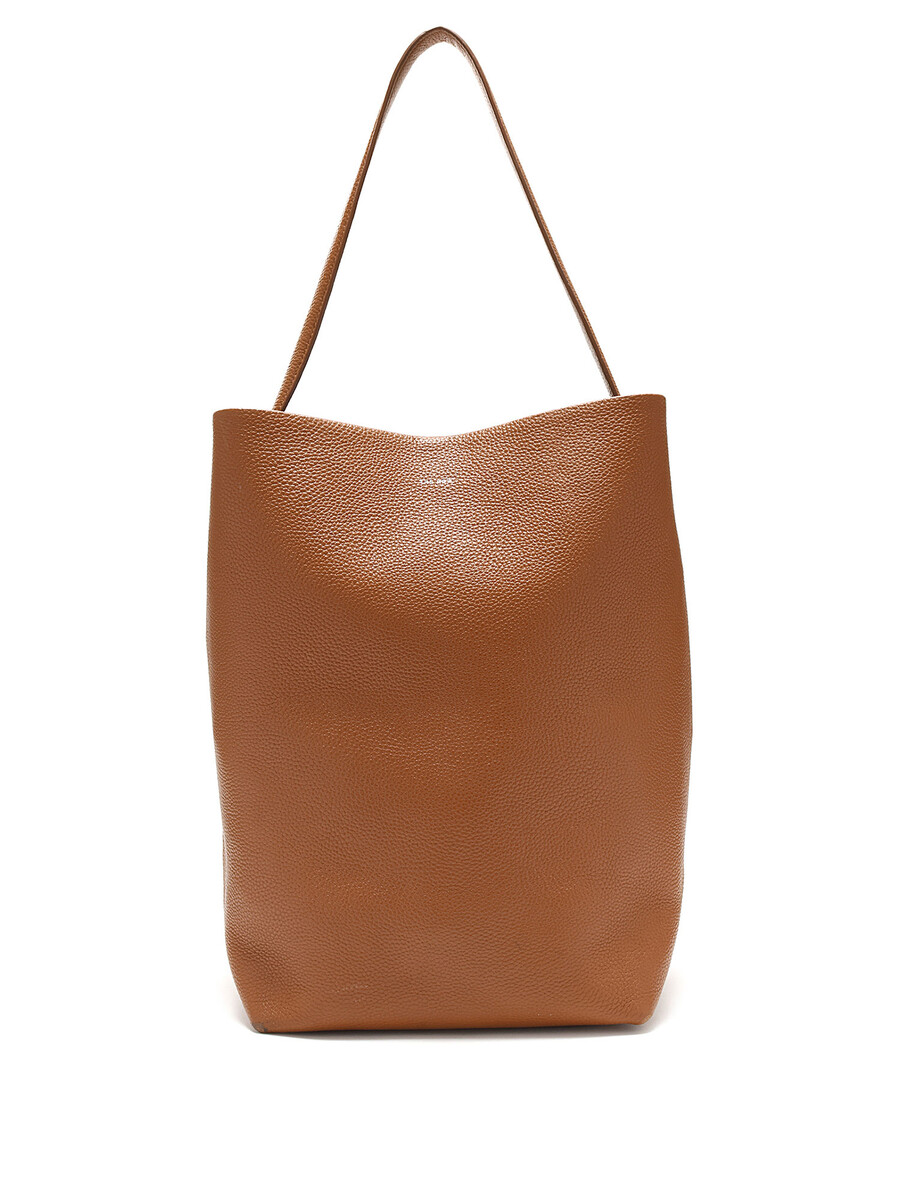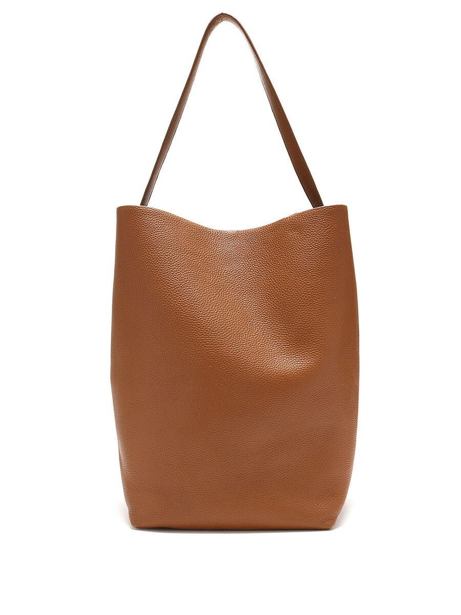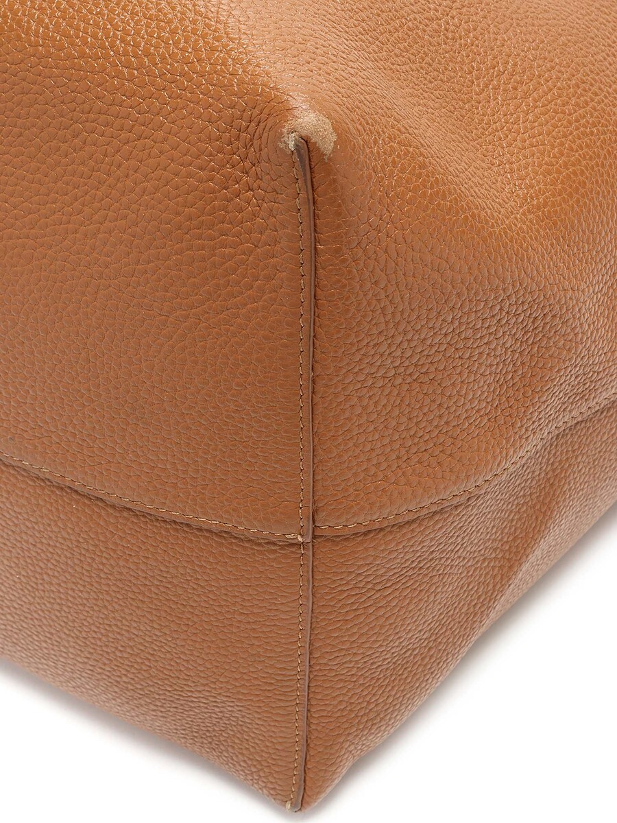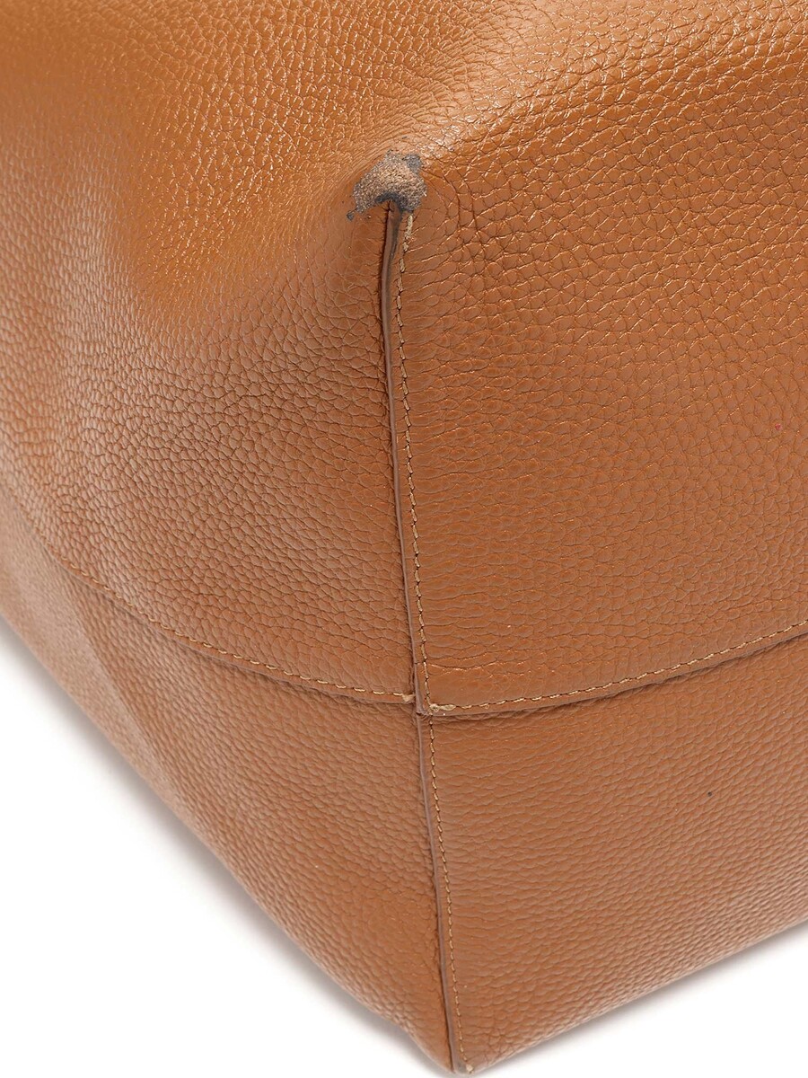 Sac seau en cuir brun pâle avec ouverture sur le dessus. Simple bandoulière. Coutures ton sur ton.