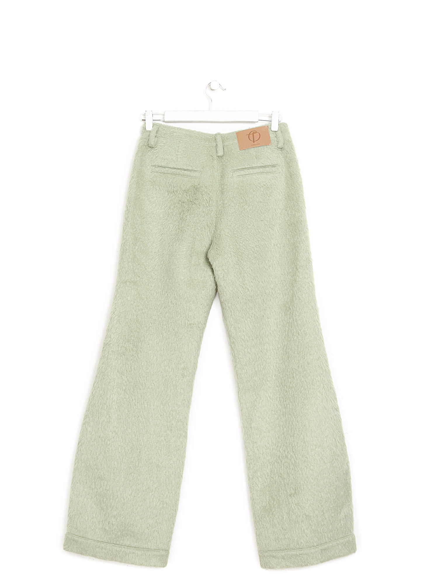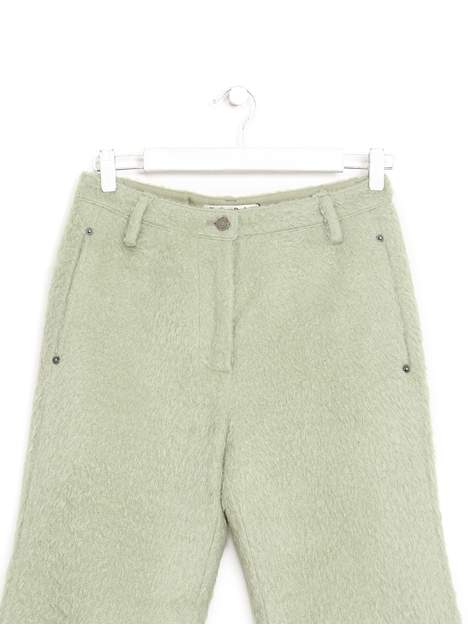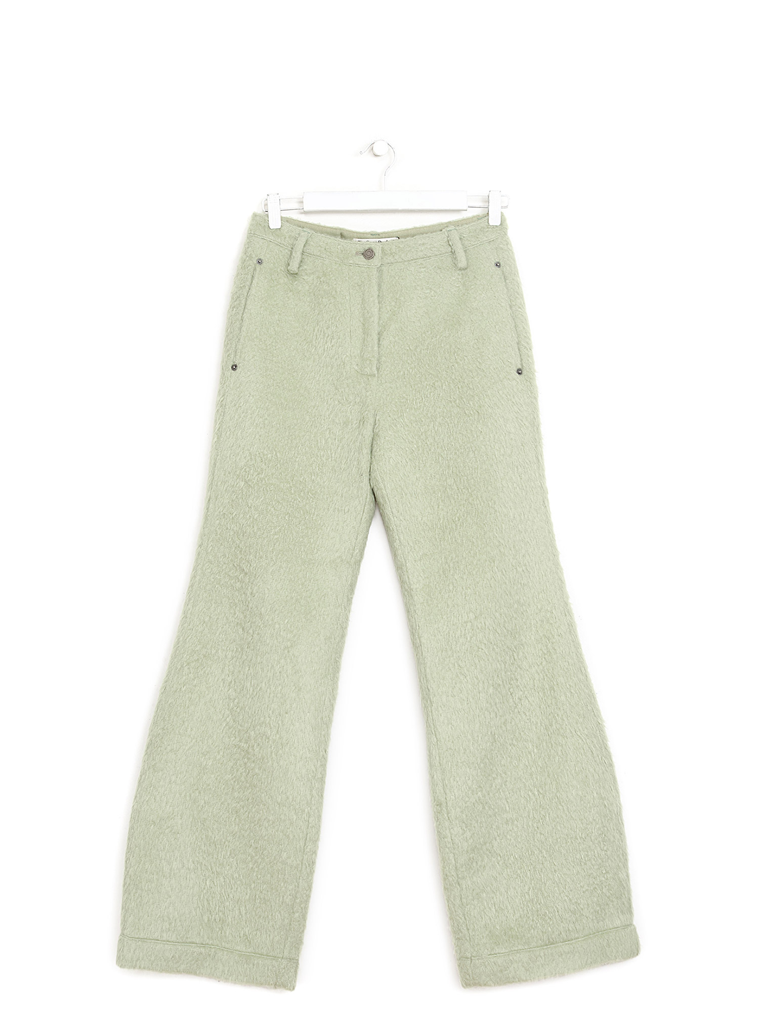Pantalon à jambe droite en mohair vert. Fermeture à glissière et bouton. Poches latérales.