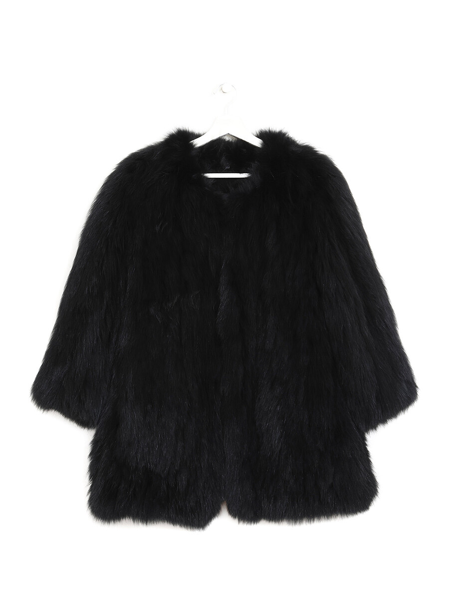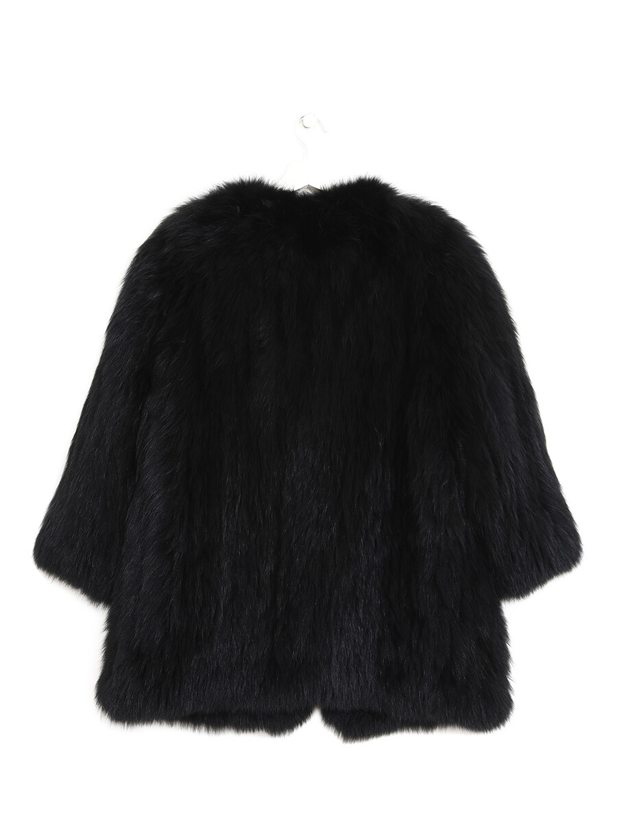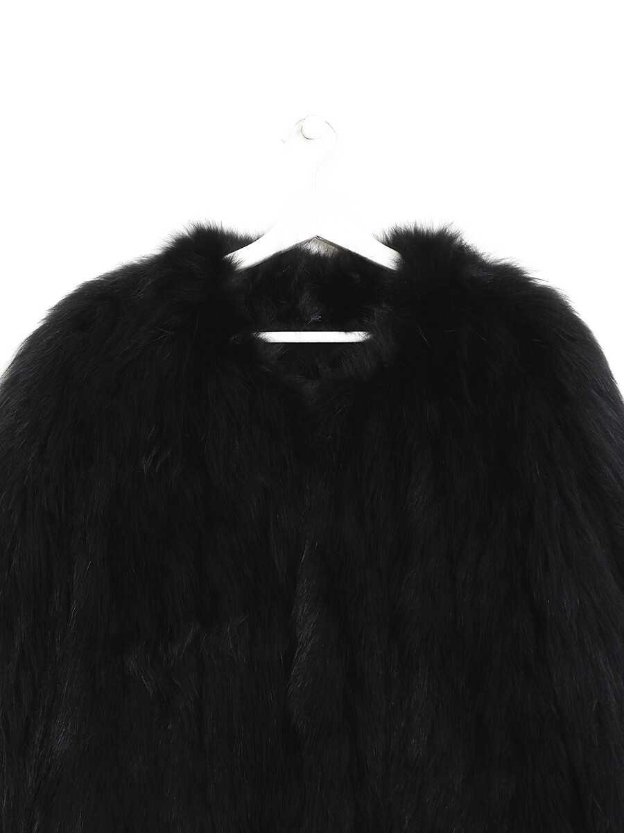Veste en fourrure de renard bleu teintée en noir. Fermeture à crochet au devant. Texture luxueuse et soyeuse.
