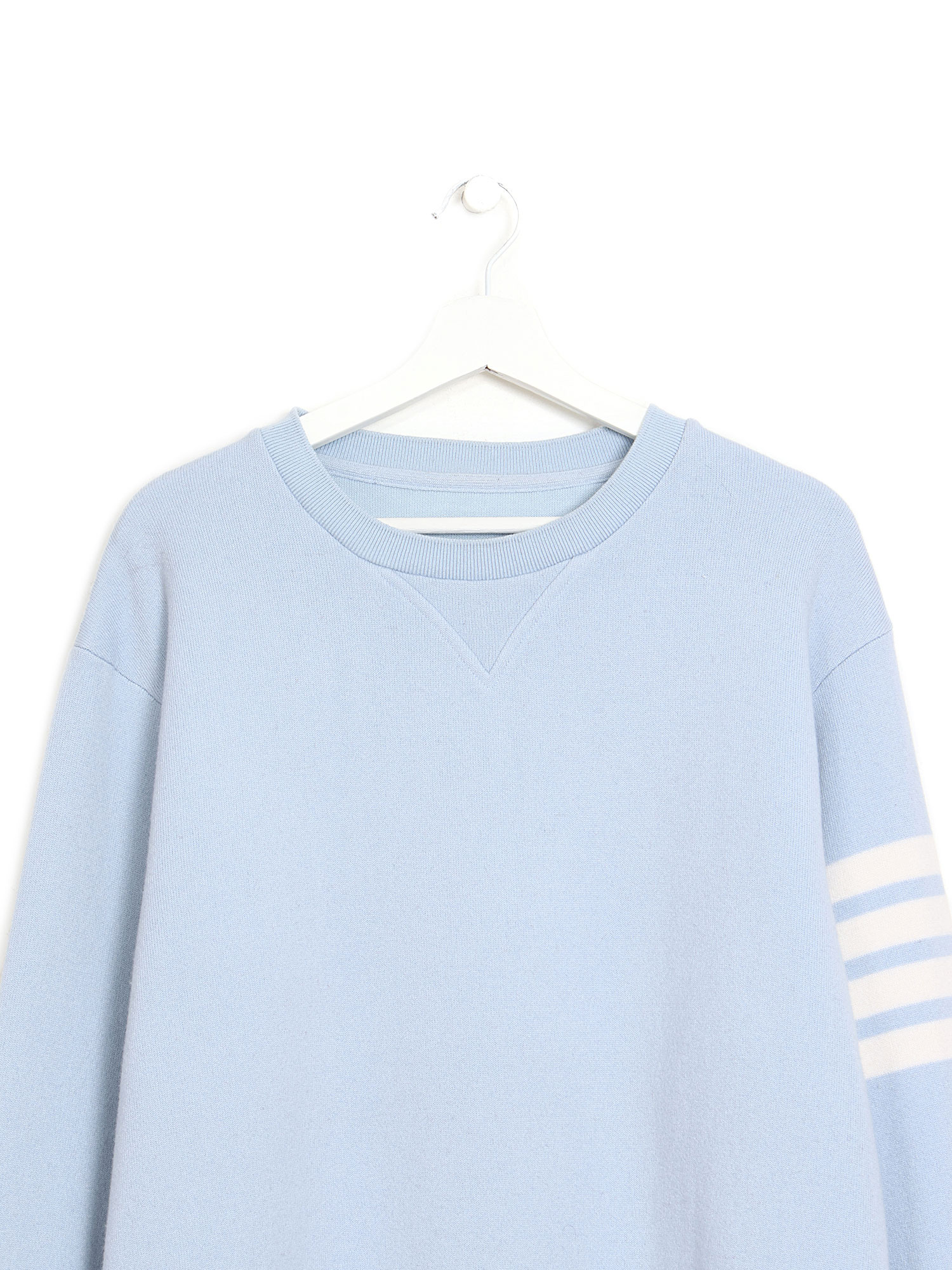 Pull à col rond en mélange de cachemire bleu poudre avec manches longues. Rayures blanches emblématiques sur la manche. Doux et confortable, parfait pour la superposition.