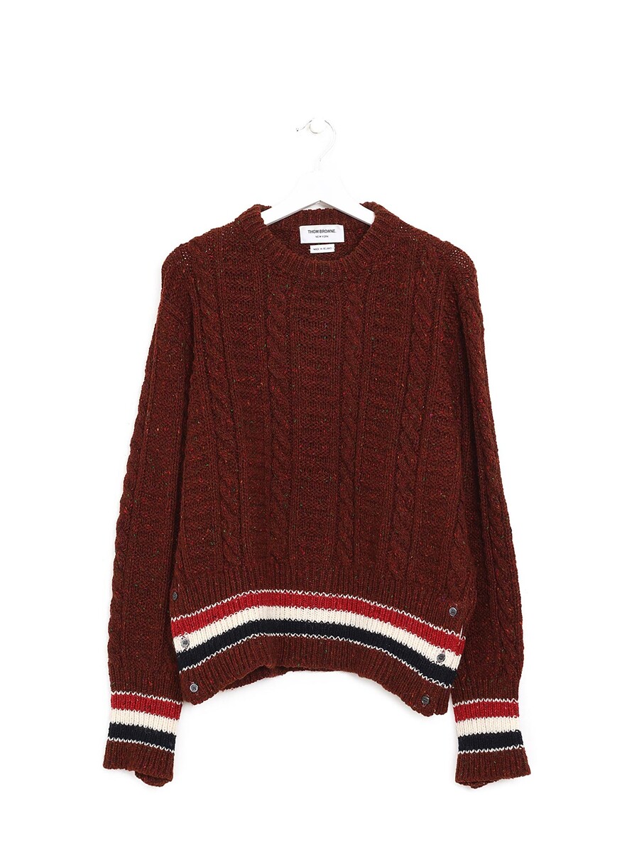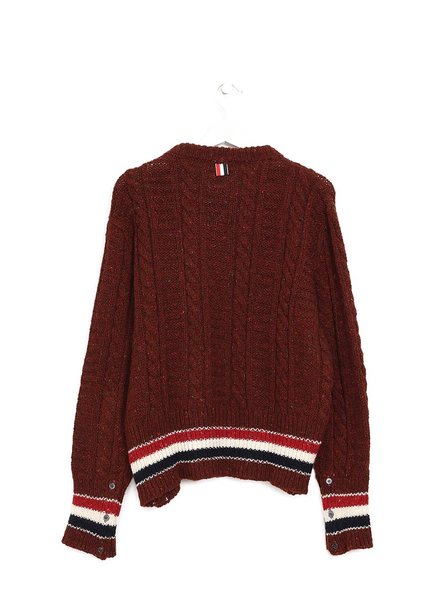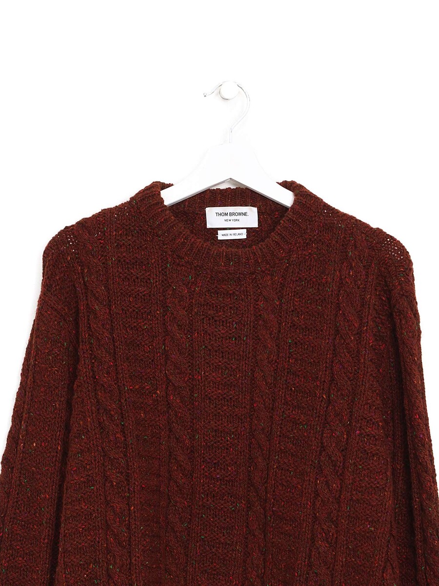 Pull à manches longues en maille torsadée brun-orangé. Col rond. Ourlet et poignets rayés.