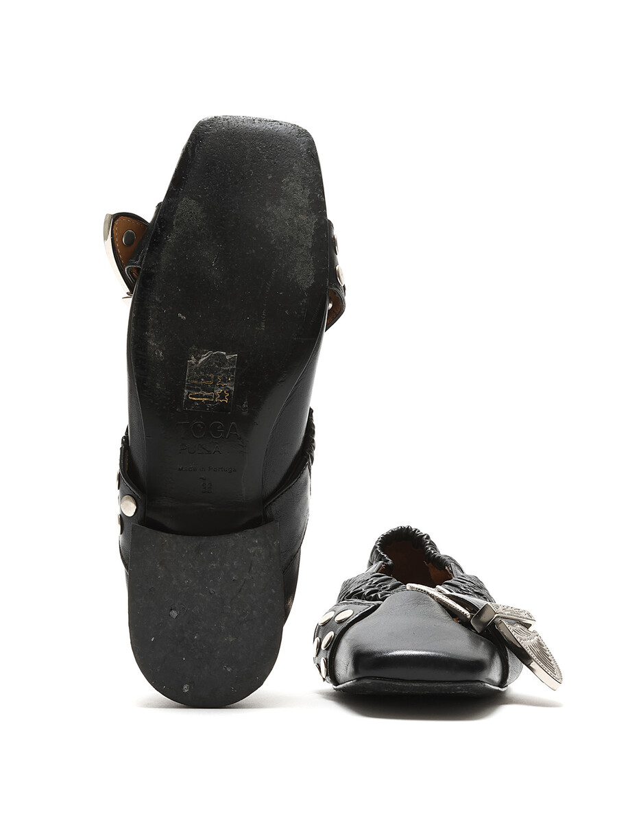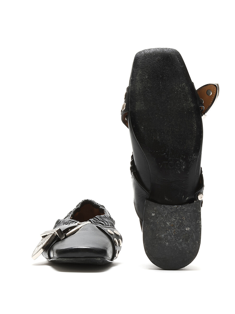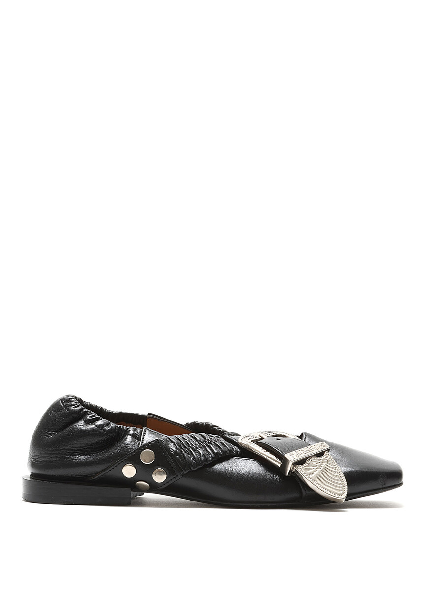 Ballerines en cuir noir avec fermeture à boucle. Bout rond avec ferrures en métal argenté. Semelle en cuir.