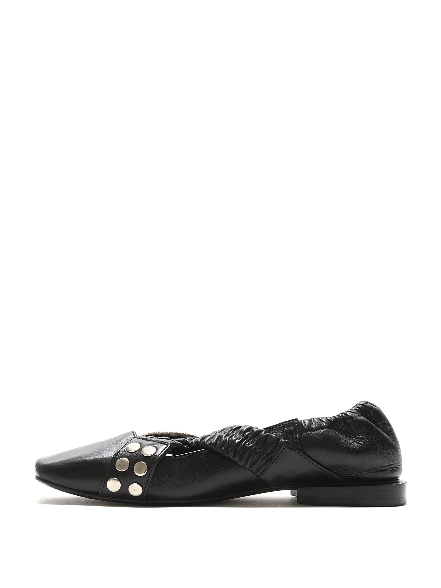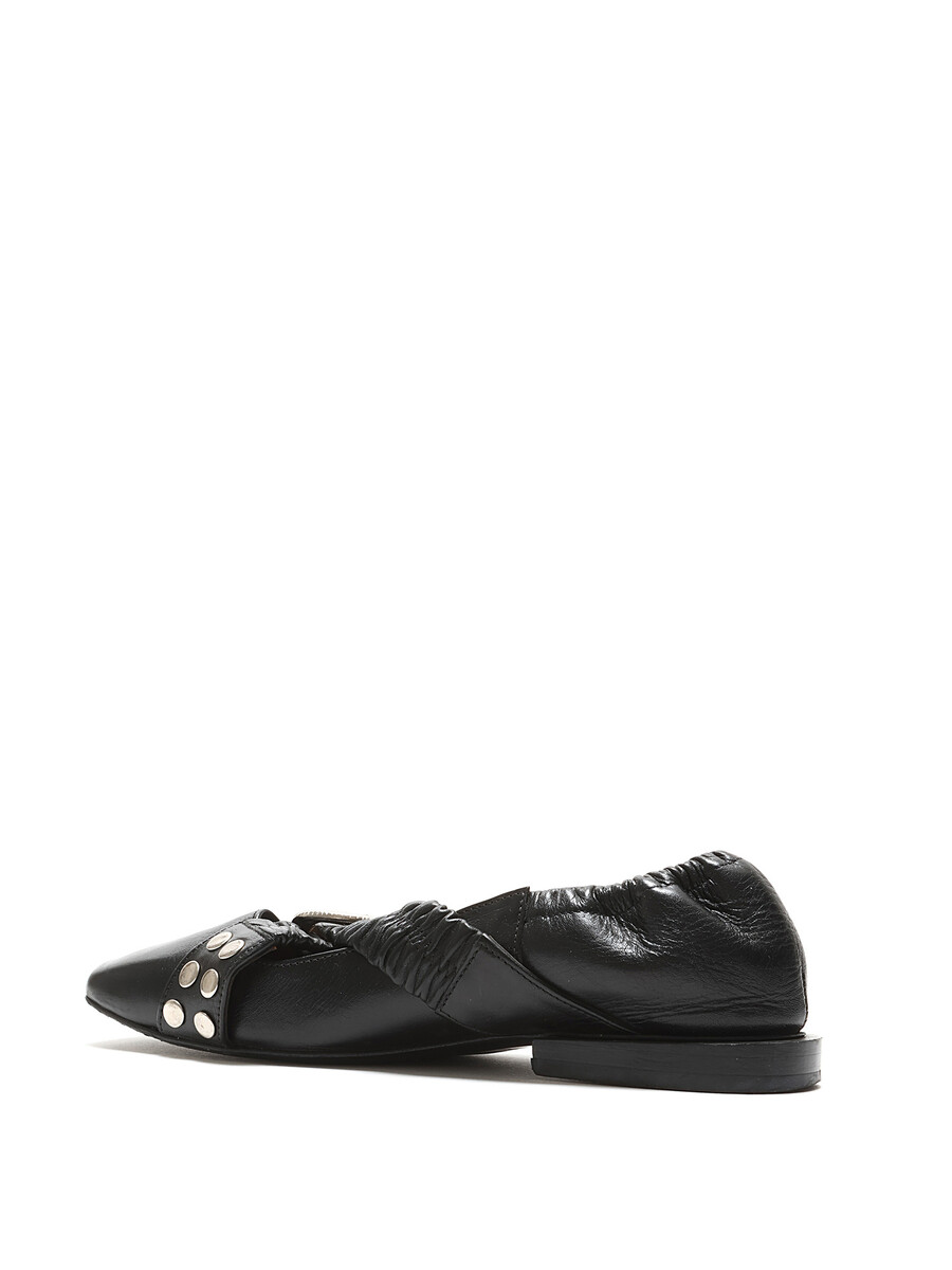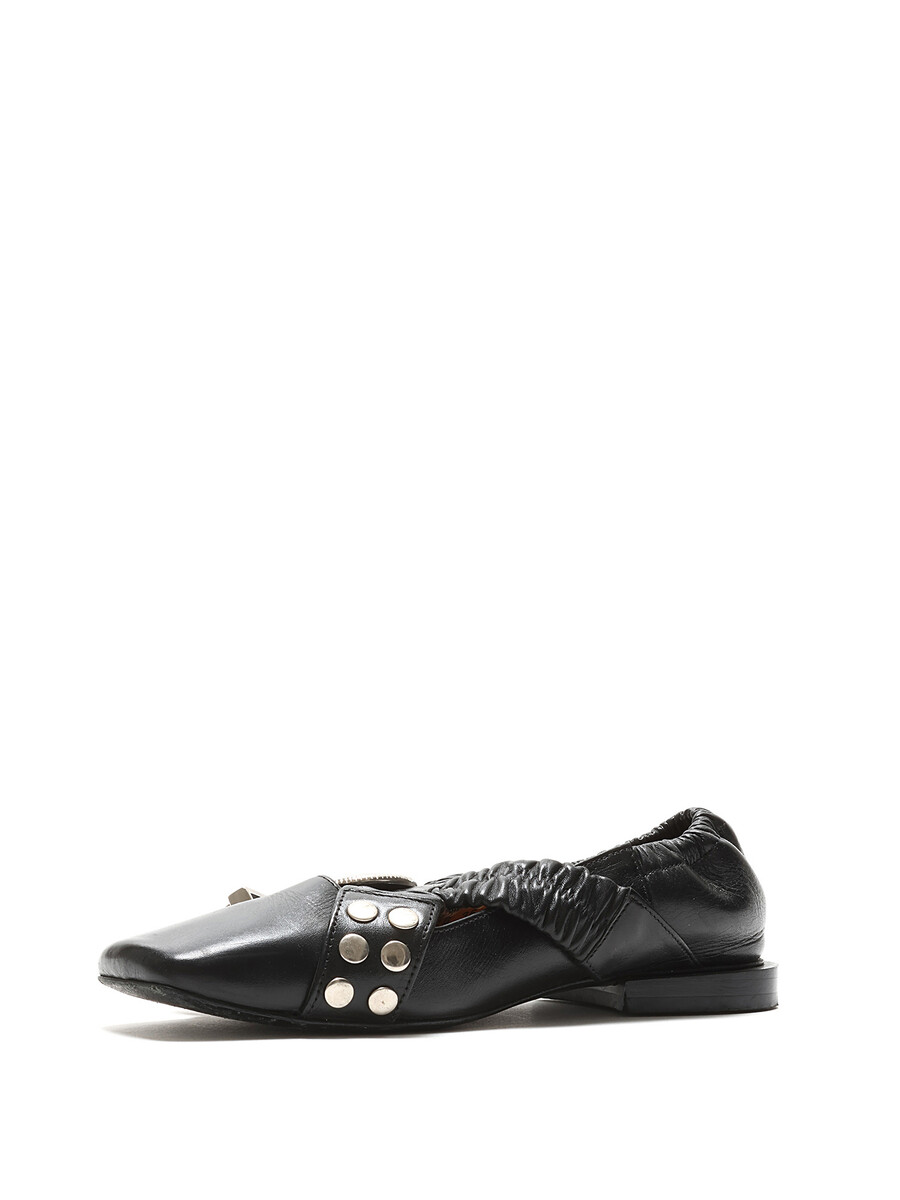 Ballerines en cuir noir avec fermeture à boucle. Bout rond avec ferrures en métal argenté. Semelle en cuir.