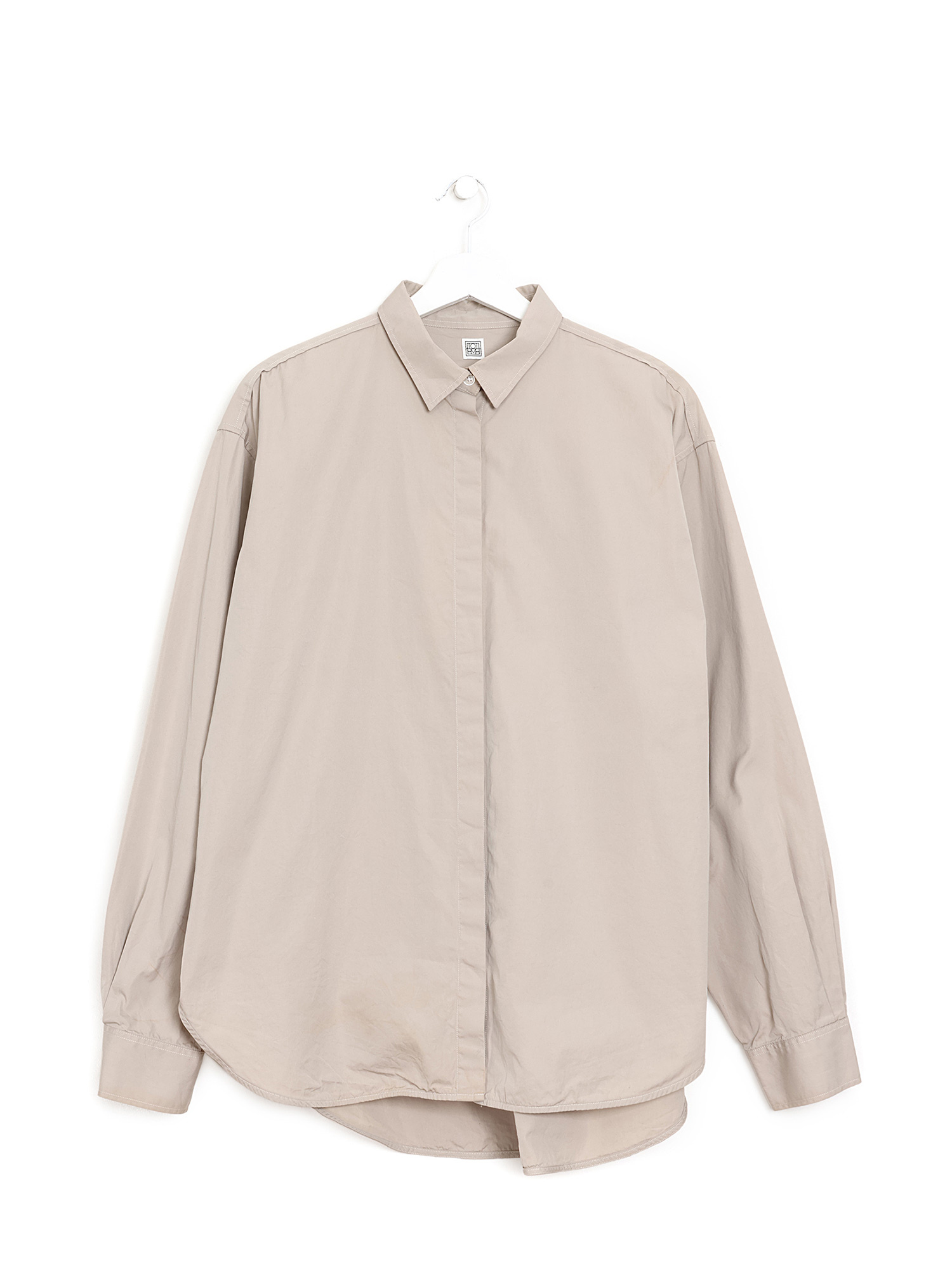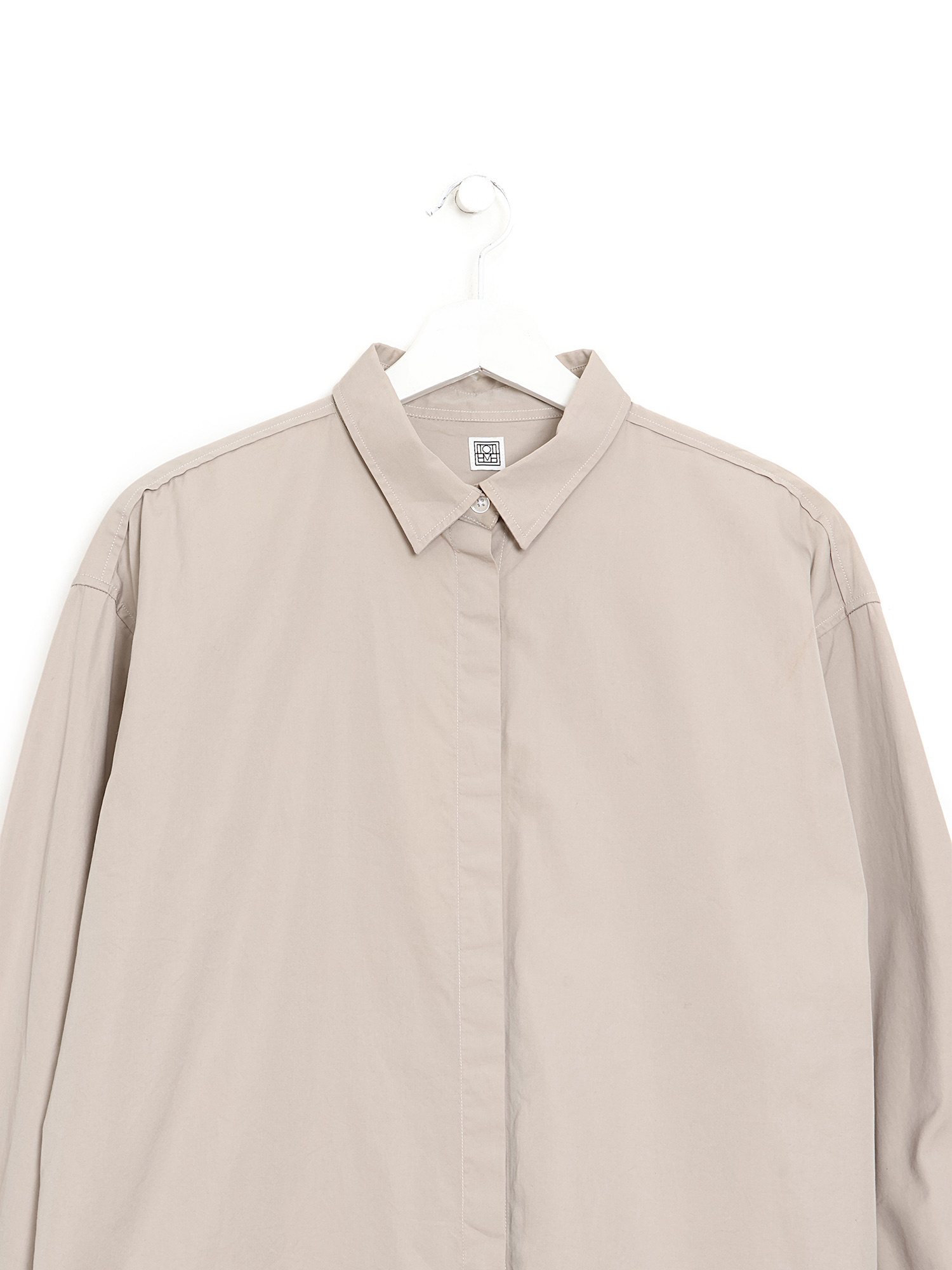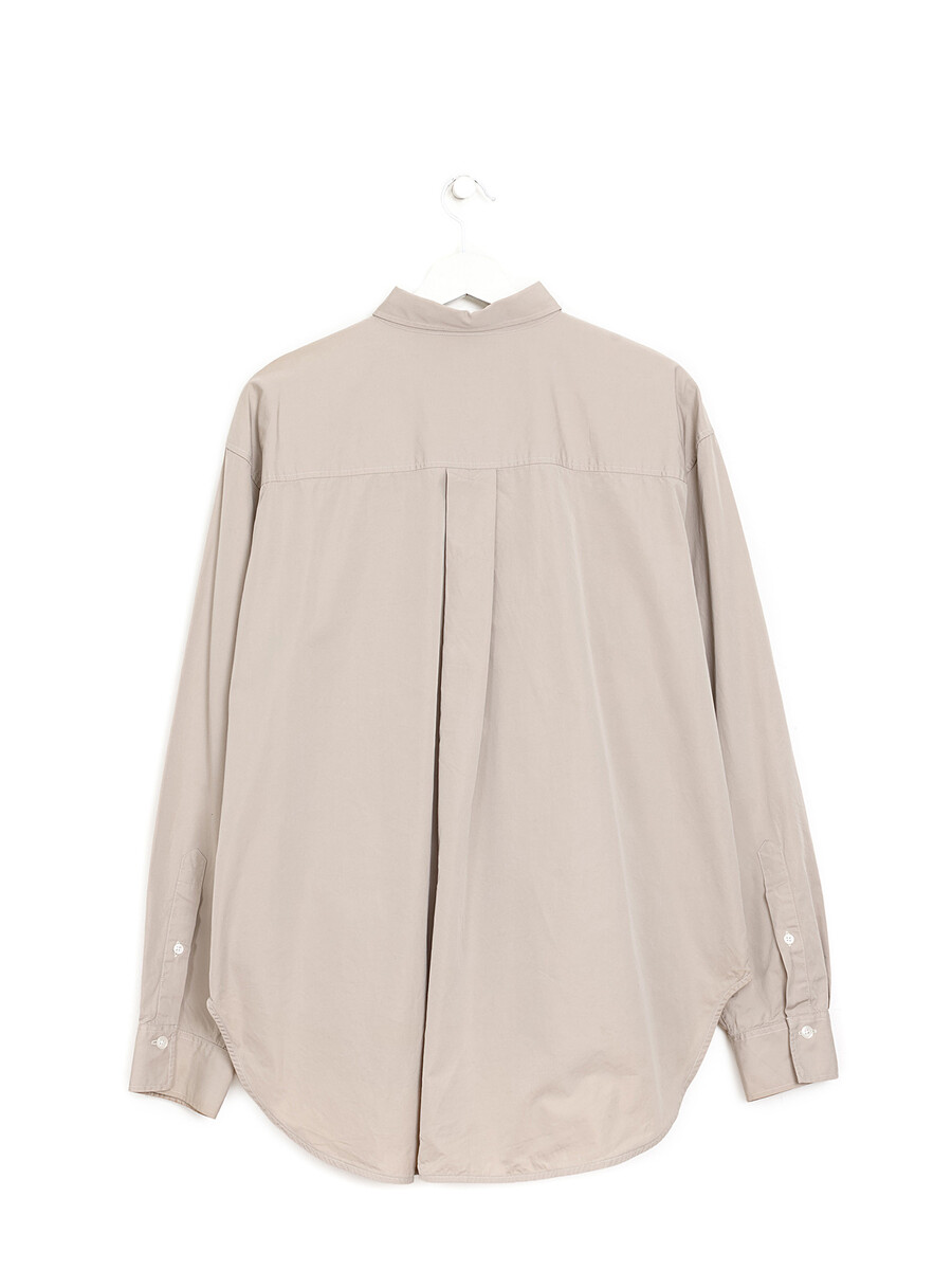Chemise à manches longues beige avec fermeture à boutons sur le devant. Col classique.