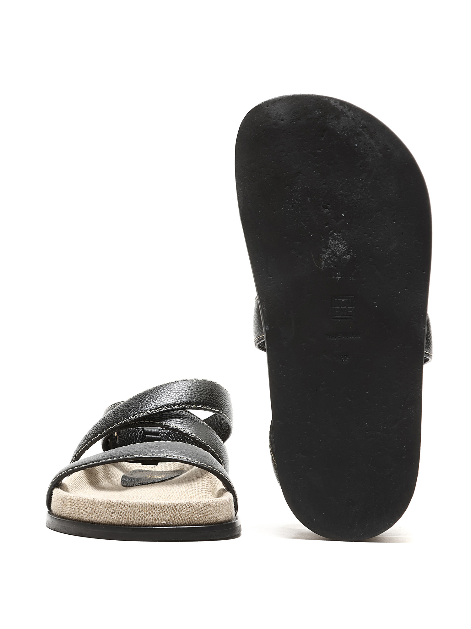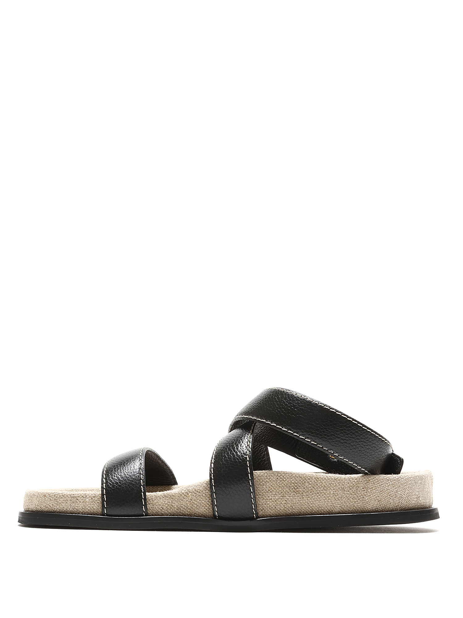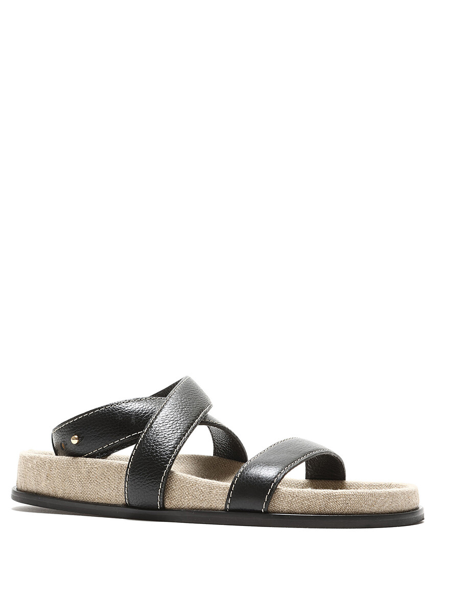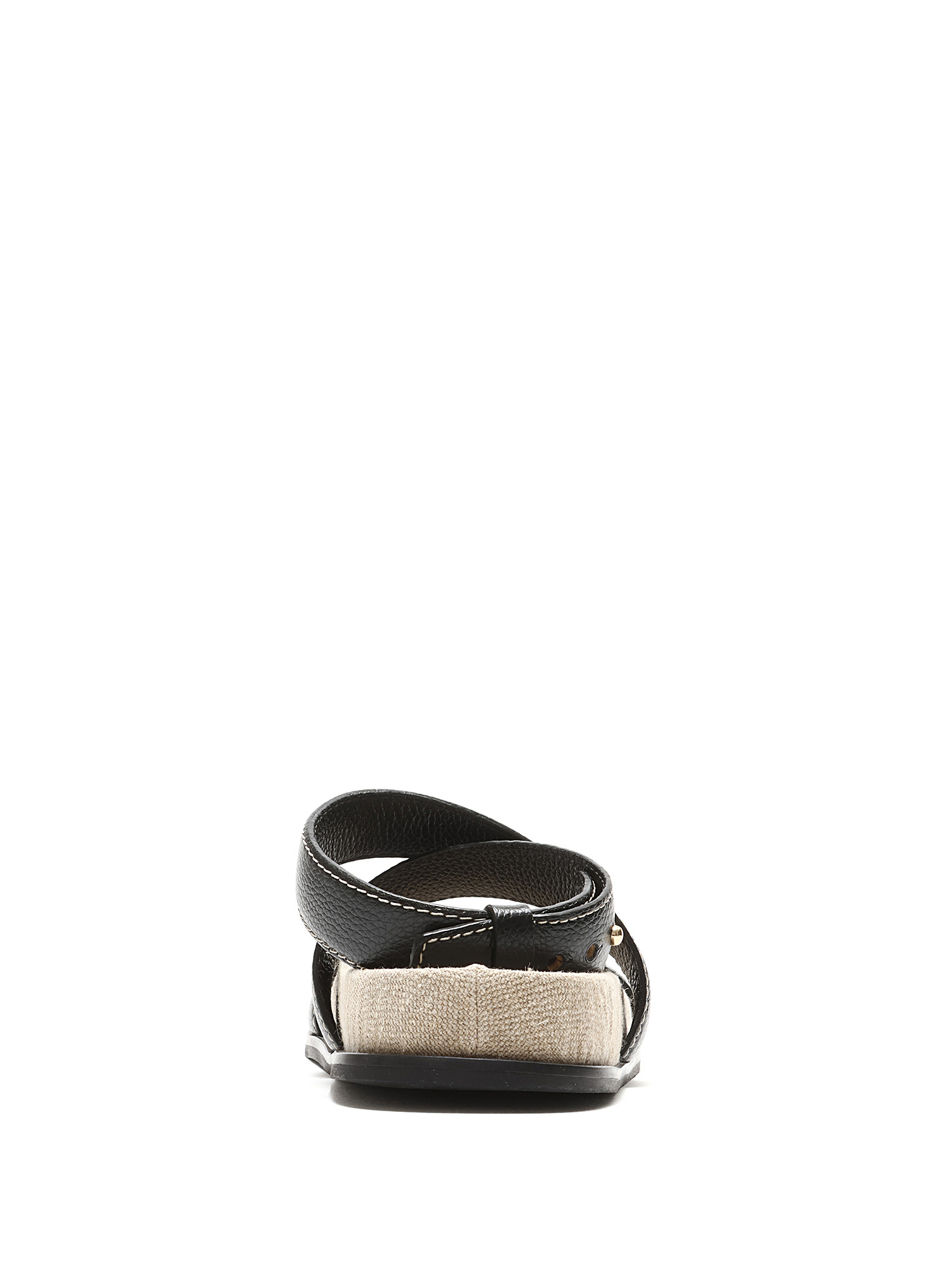 Sandales à brides en cuir noires avec design à bout ouvert. Semelle en caoutchouc robuste.