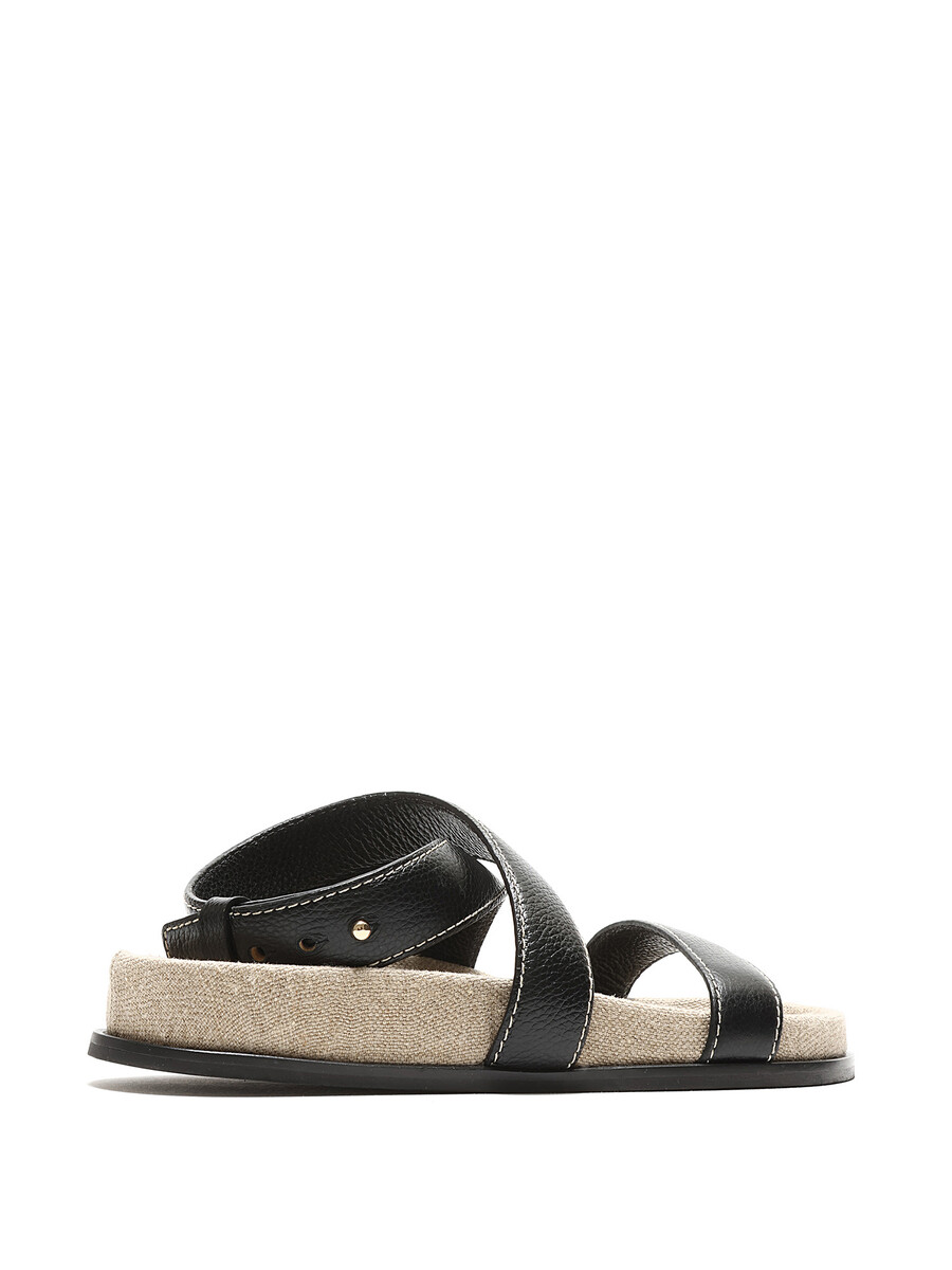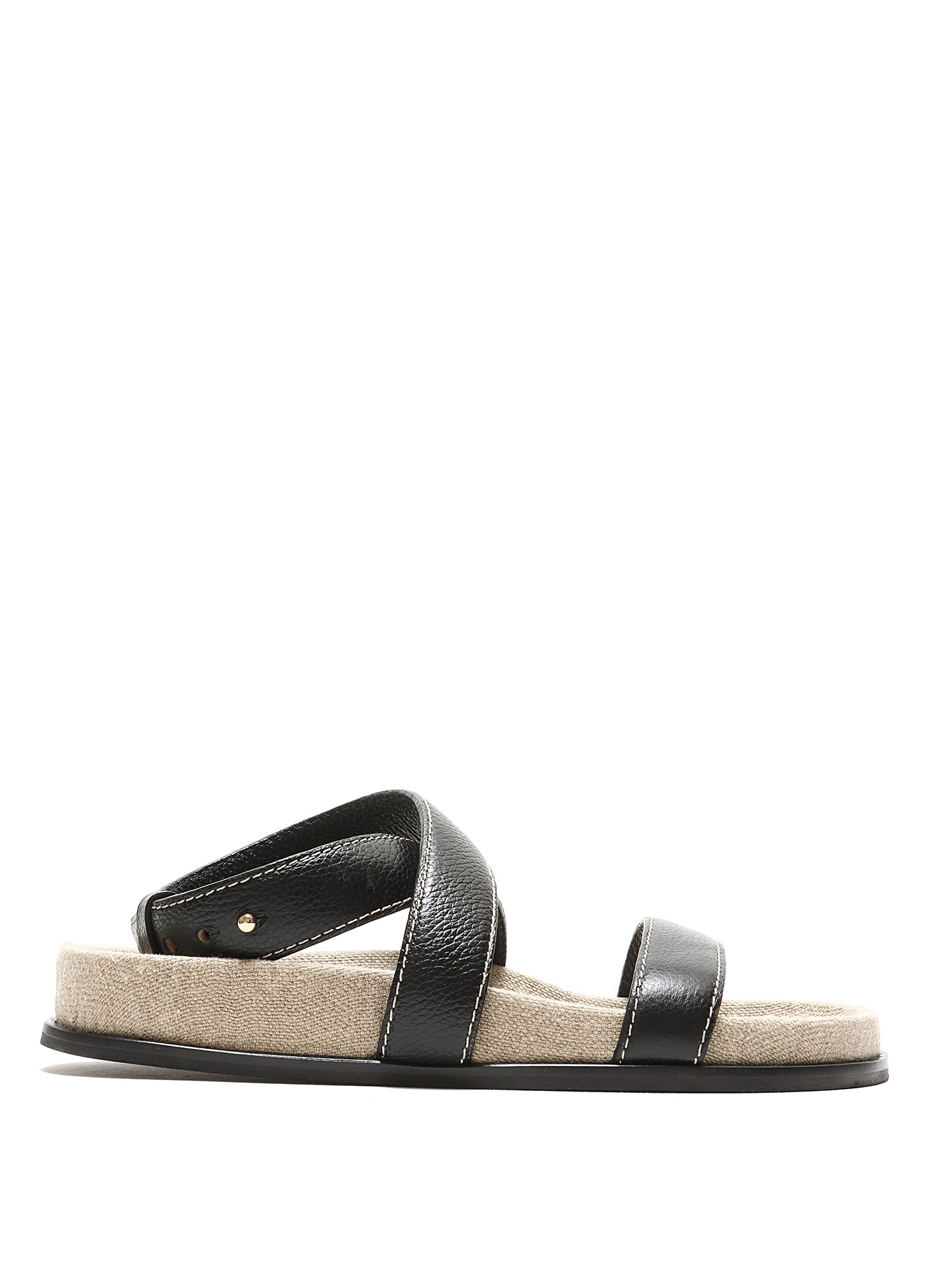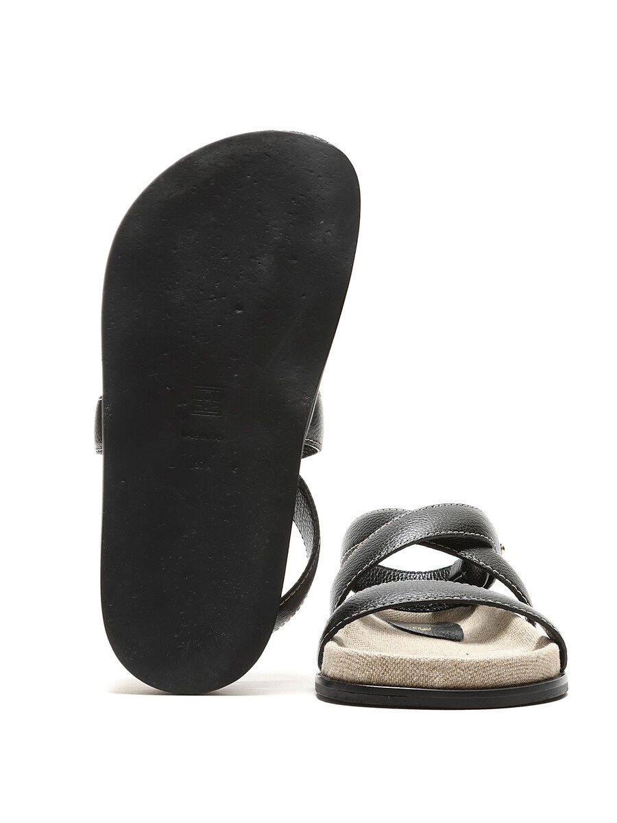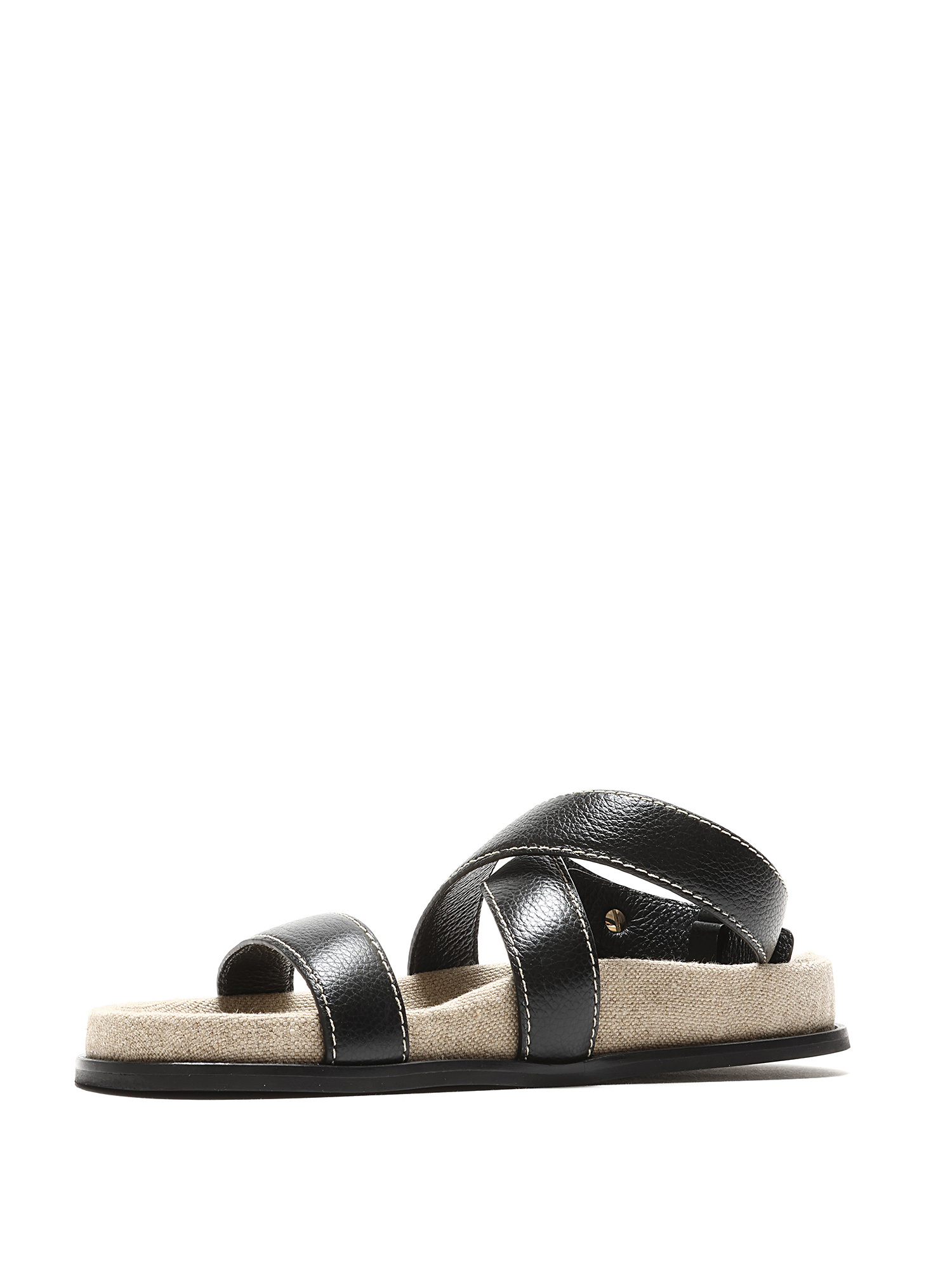 Sandales à brides en cuir noires avec design à bout ouvert. Semelle en caoutchouc robuste.