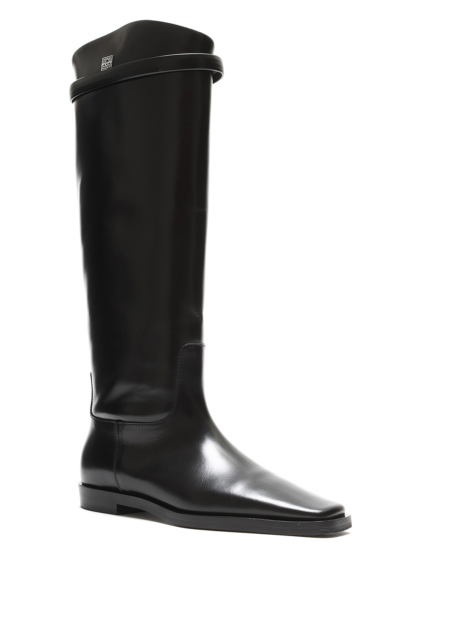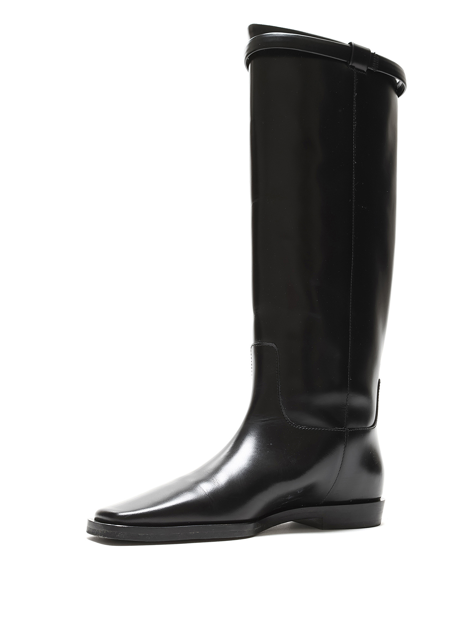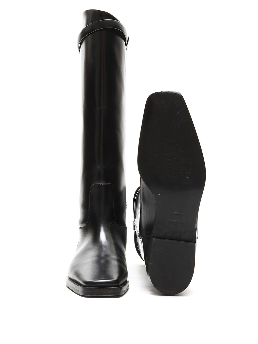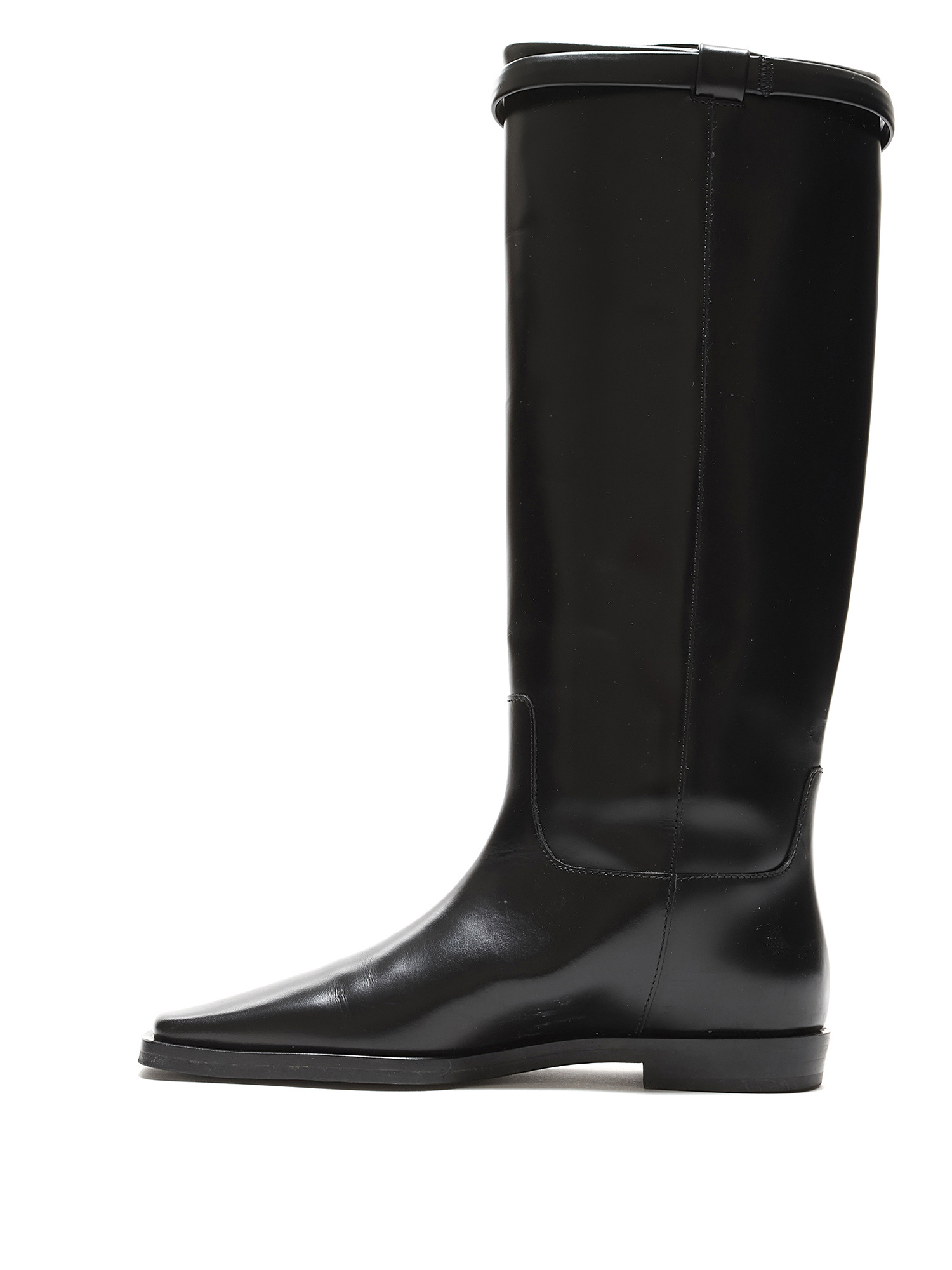 Bottes cavalières en cuir noir jusqu'aux genoux. Style à enfiler avec bout carré. Semelle en cuir.