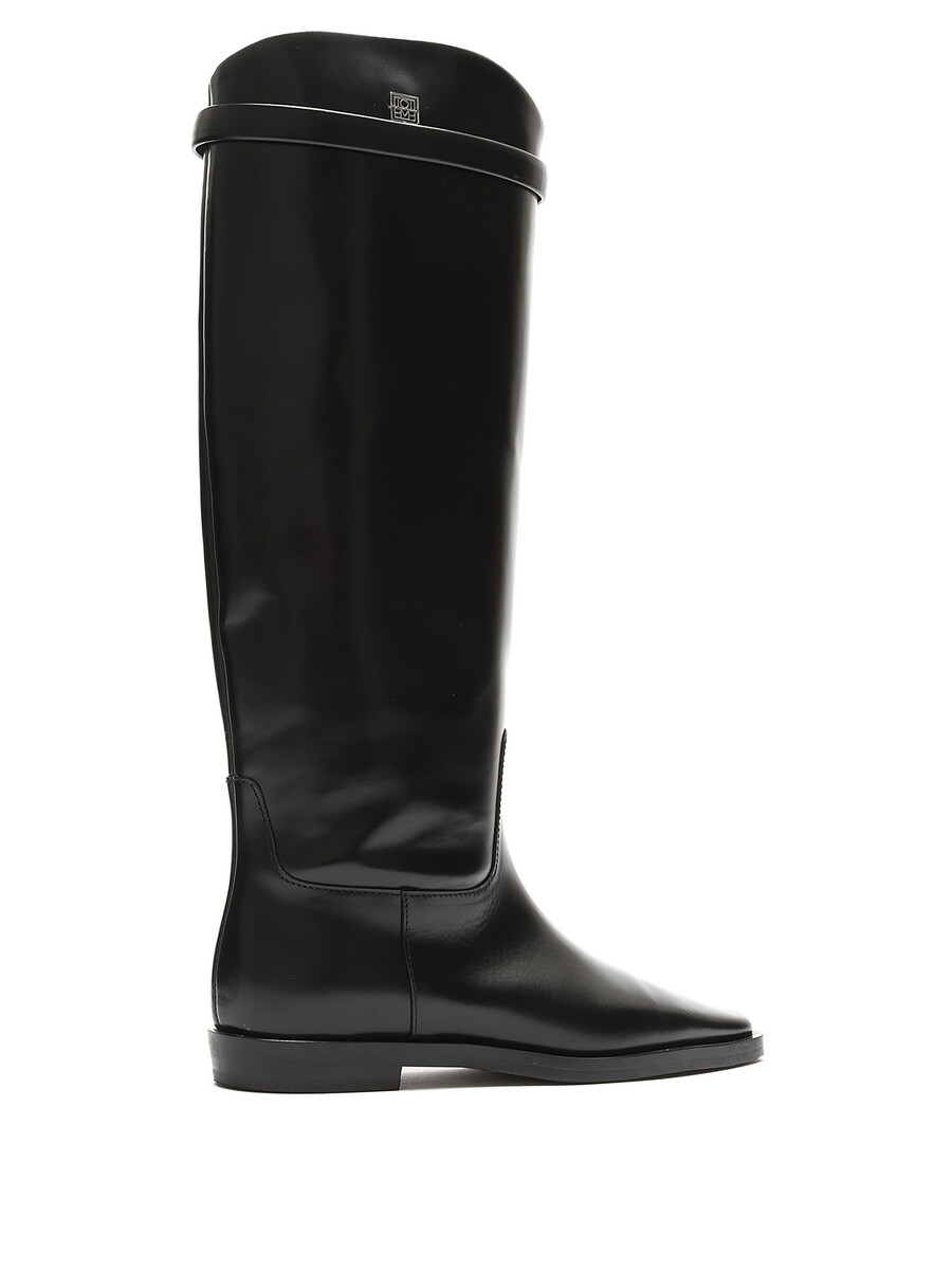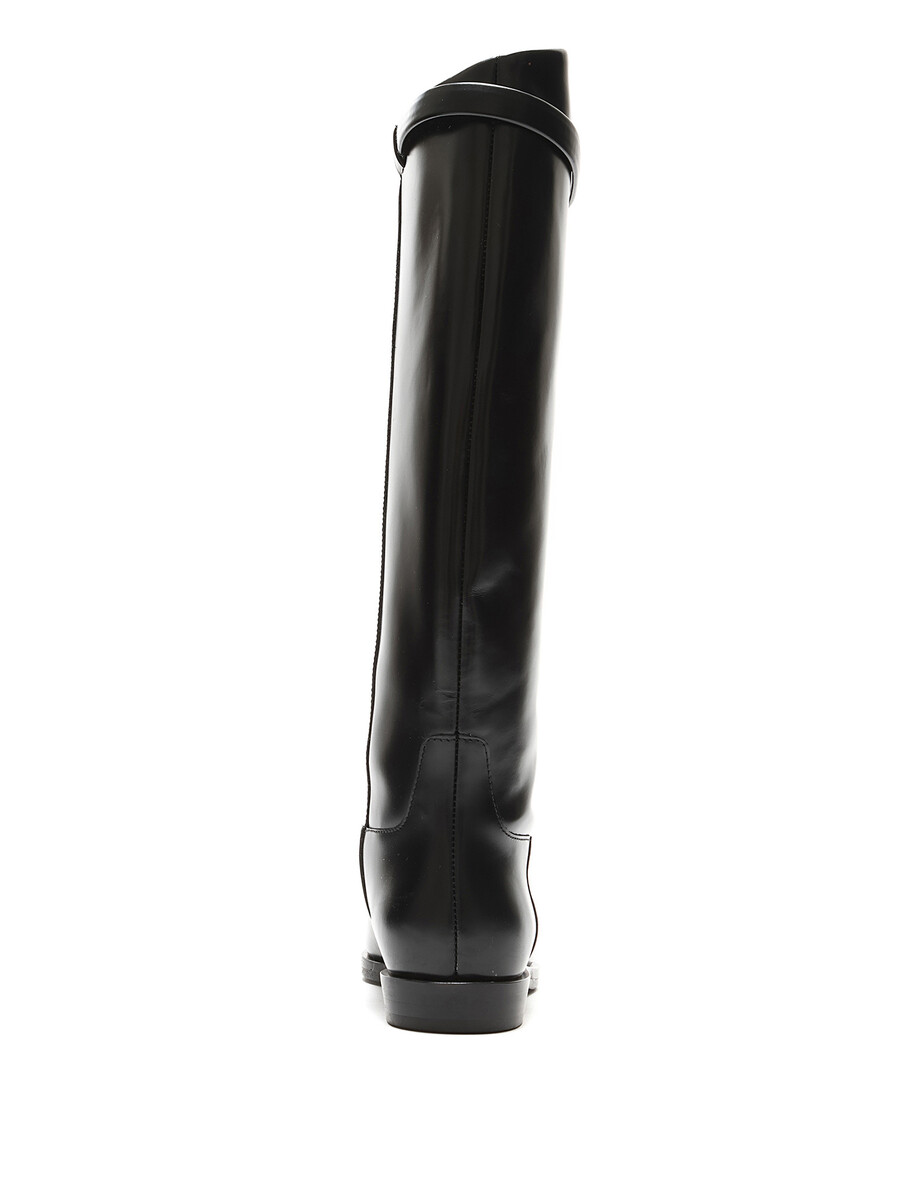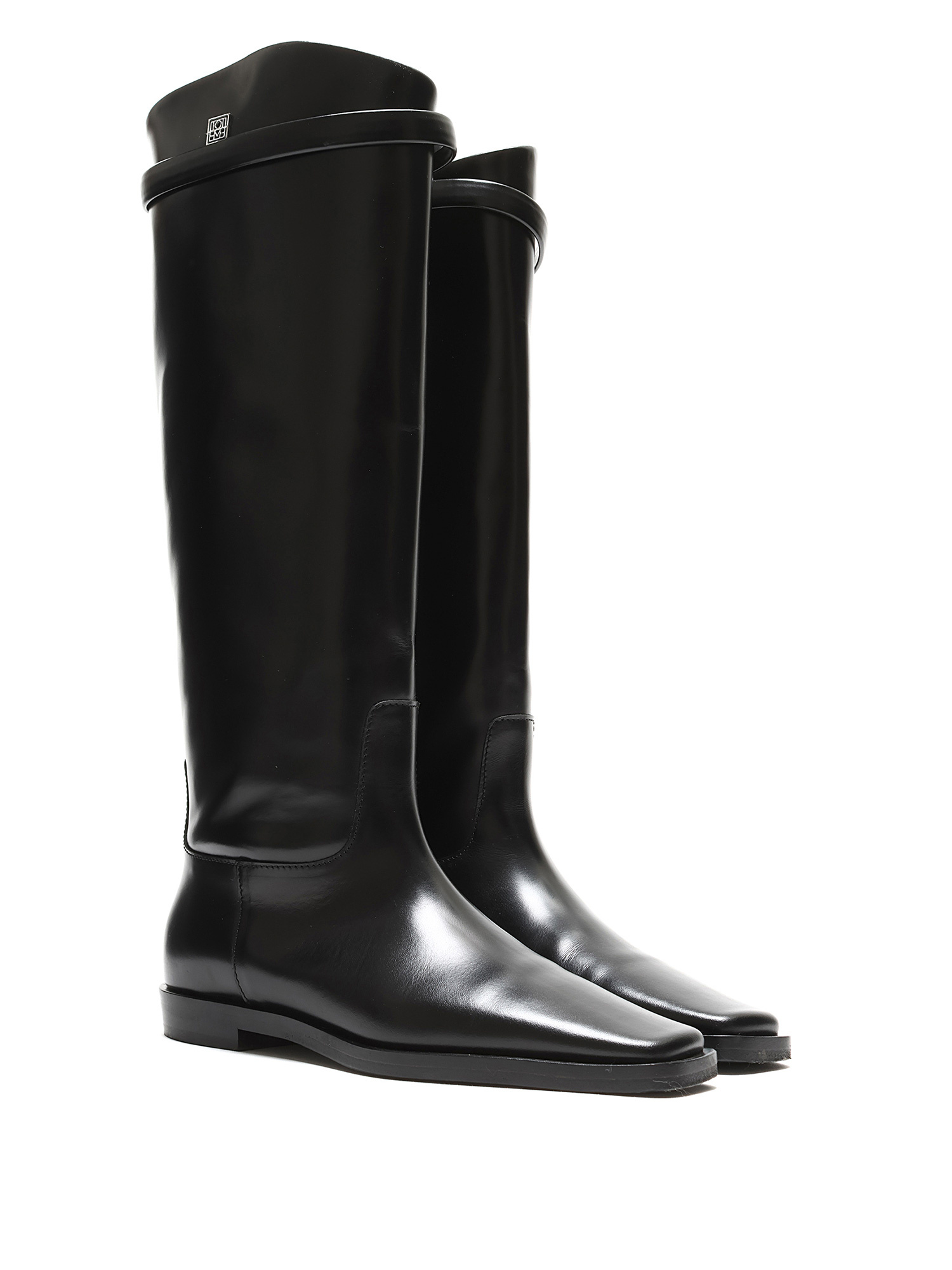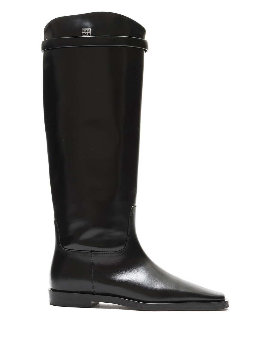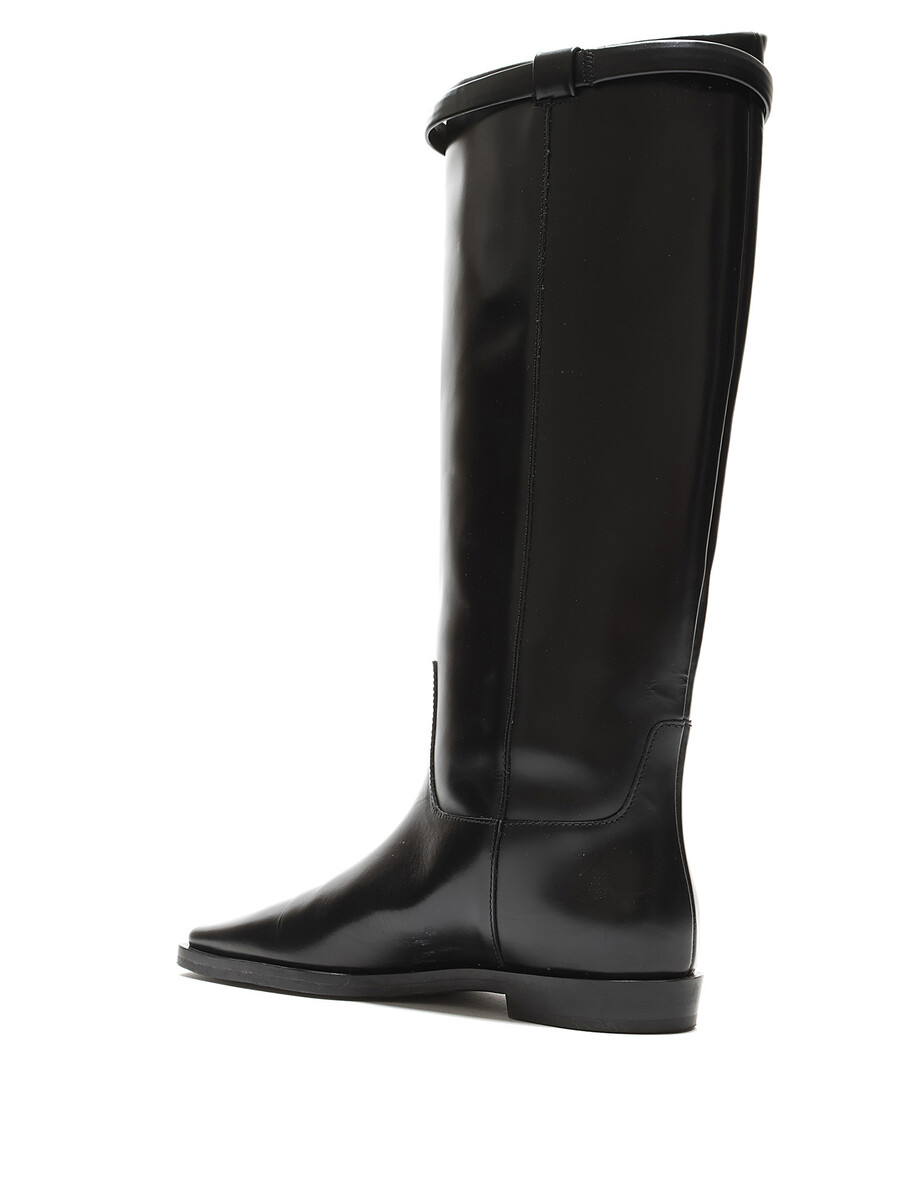Bottes cavalières en cuir noir jusqu'aux genoux. Style à enfiler avec bout carré. Semelle en cuir.