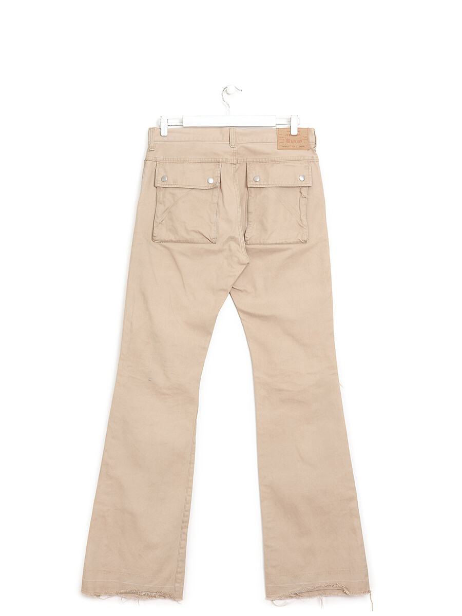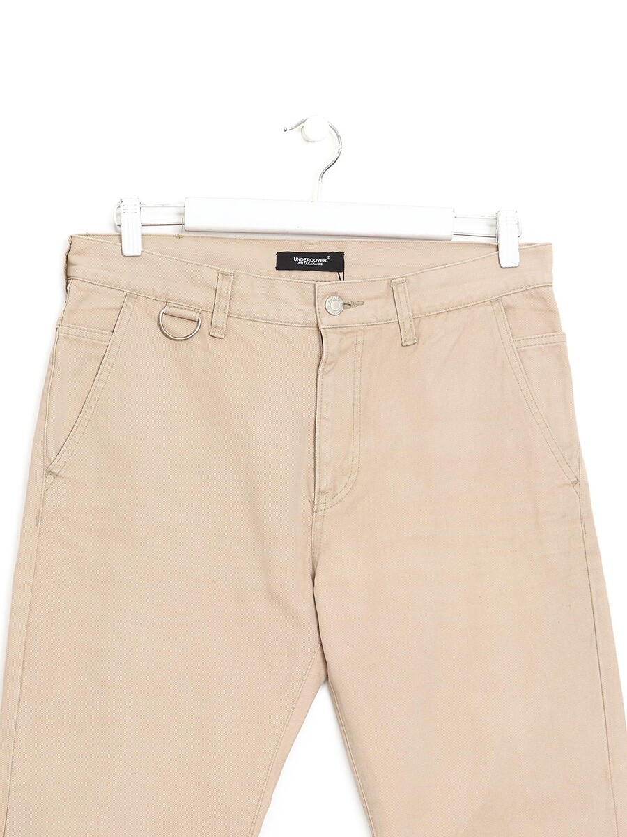 Pantalon en coton beige à effet affligé, avec détail d'anneau en D. Quatre poches. Usure visible aux ourlets et ferrures, délavage modéré.