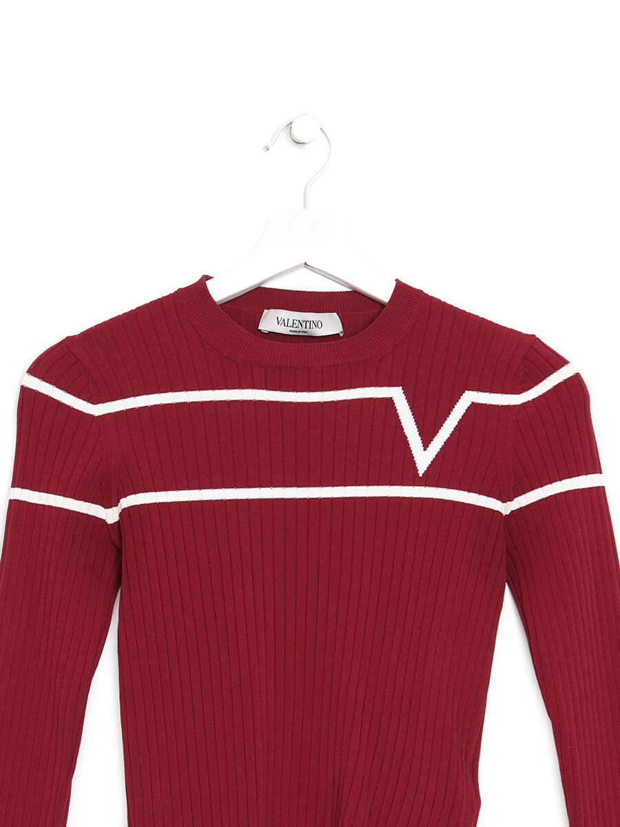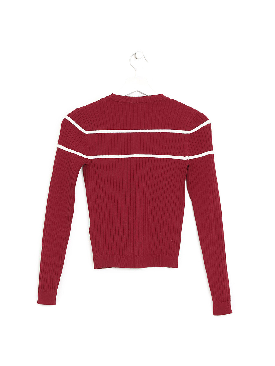 Chandail à manches longues avec texture côtelée et rayures blanches et rouges. Col rond.